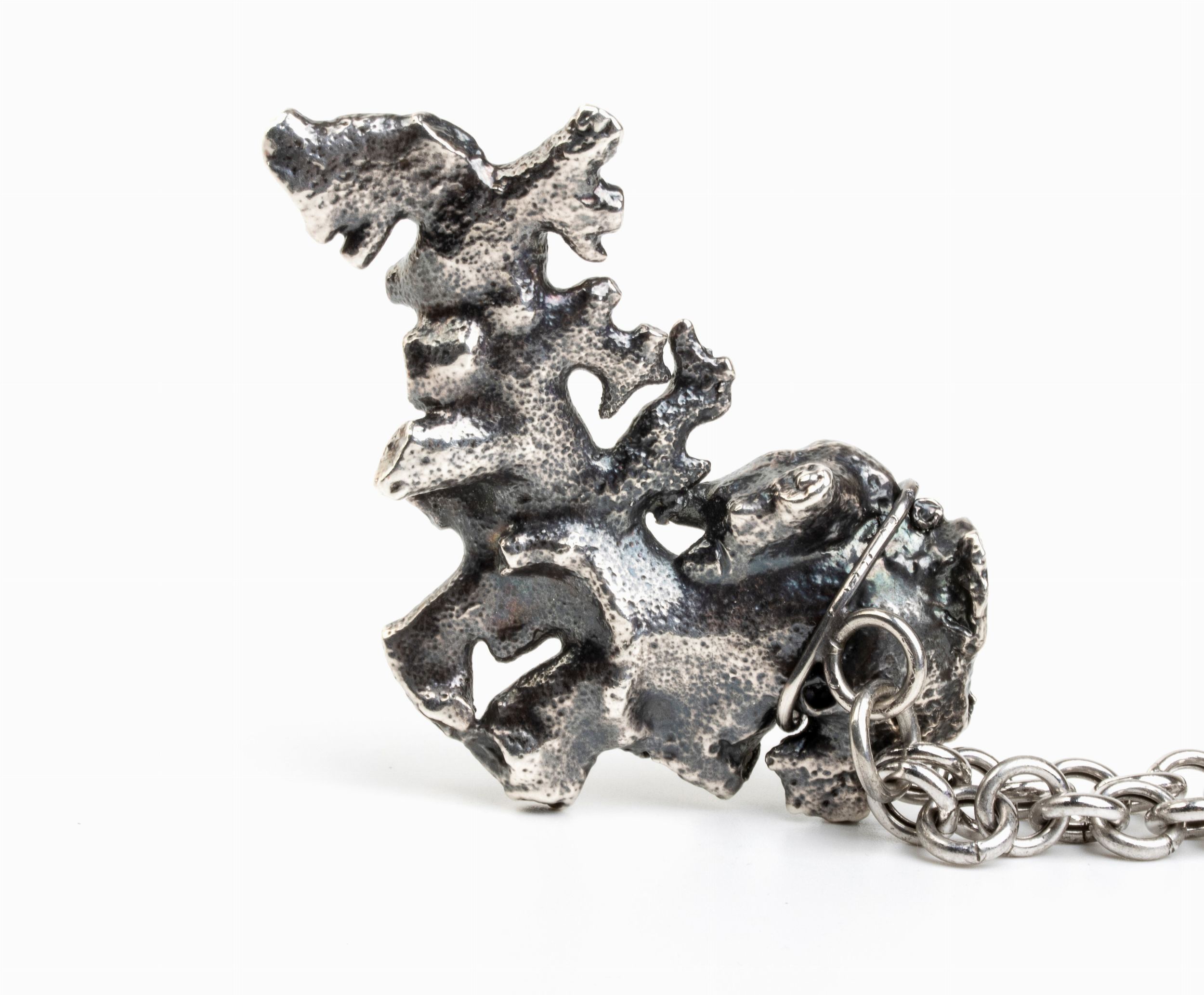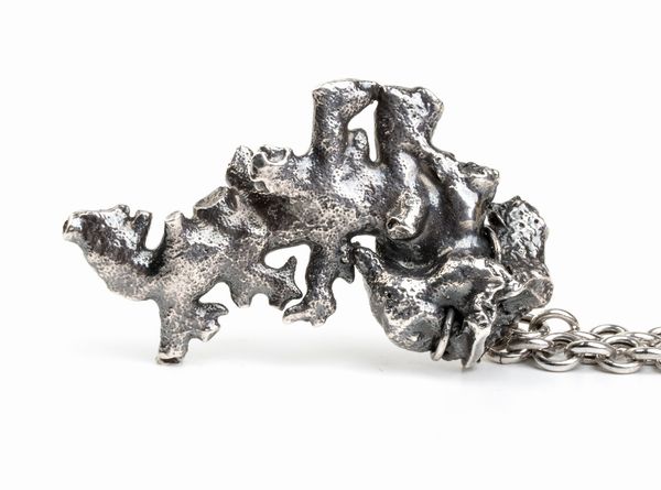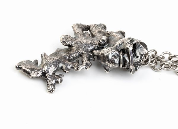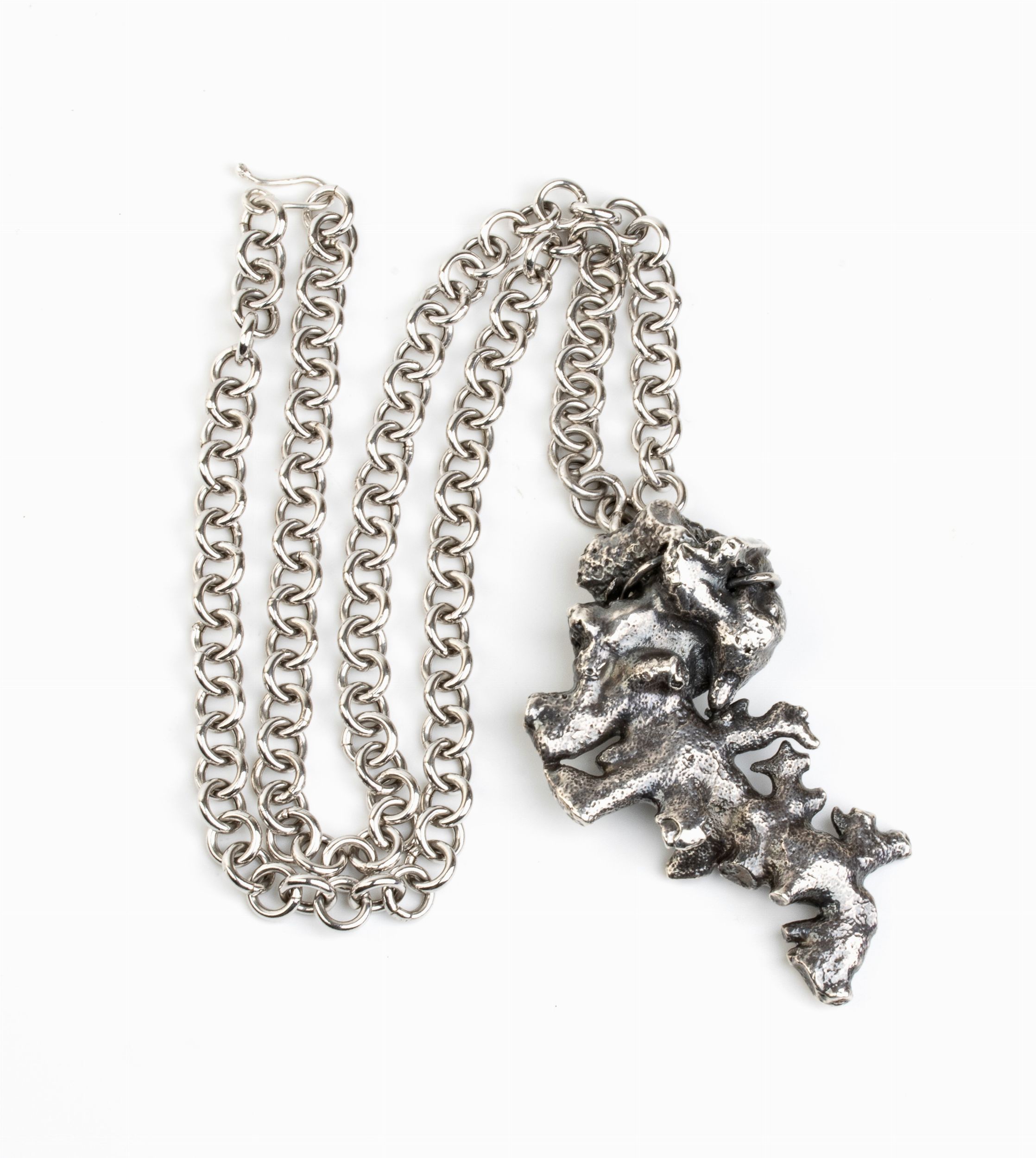 catena a maglia forzatina con pendente ramo di corallo elettroformato. Designer ISABELLA ASTENGO. Lunghezza catena 76 cm. Dimensioni pendente 9 x 5,5 cm. Peso complessivo 74,8 gr. Stato di conservazione: ***** eccellente.
