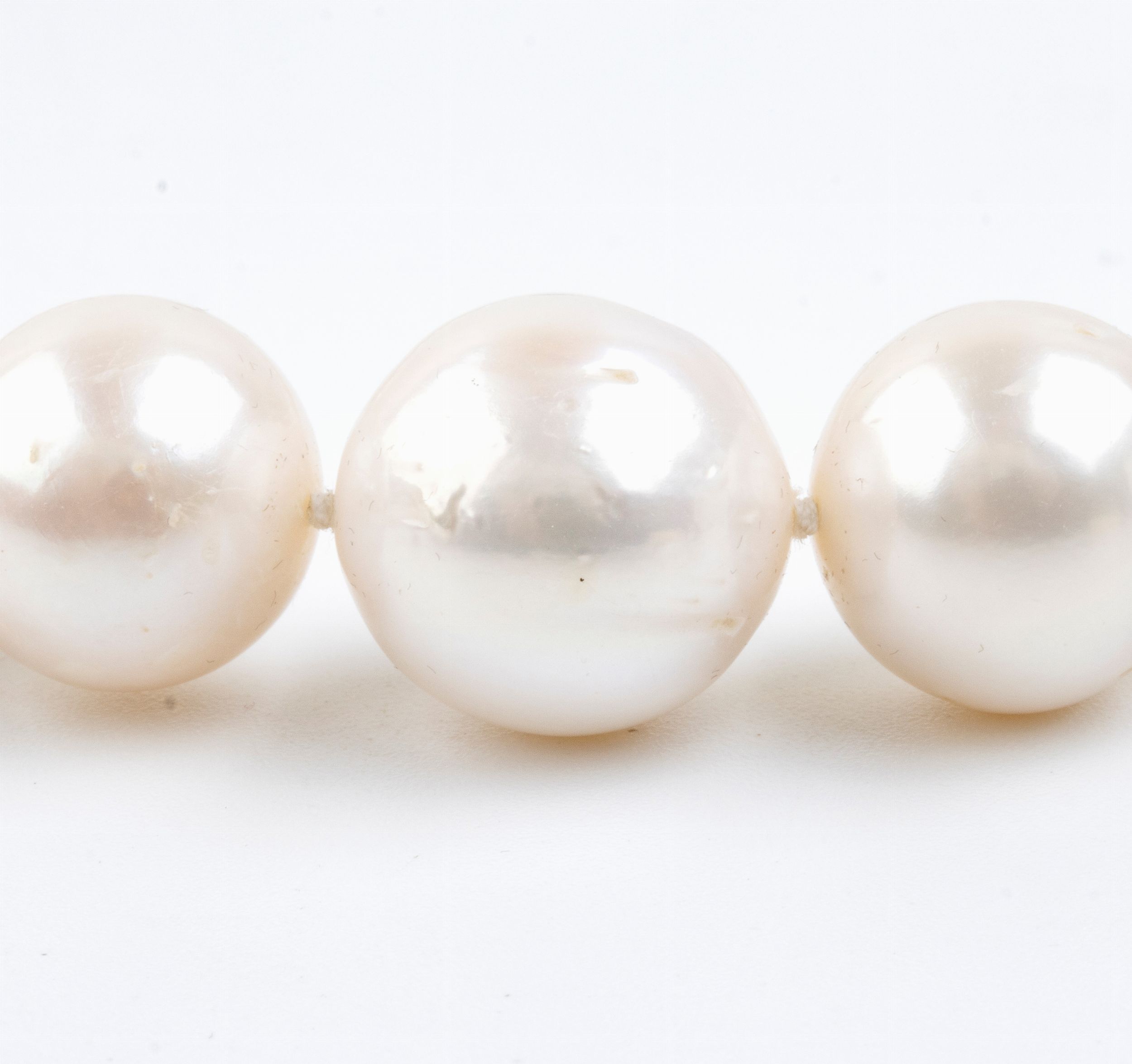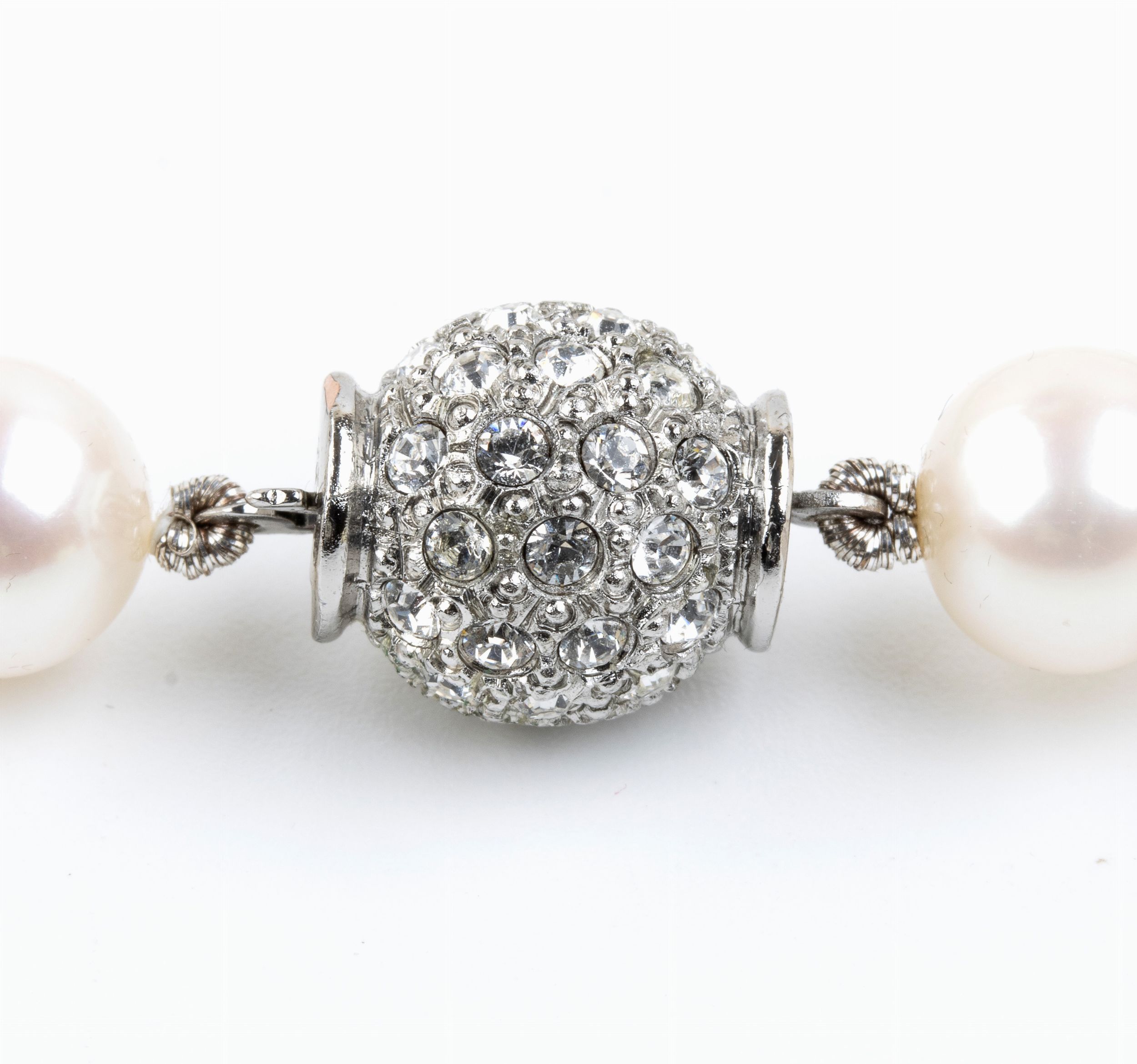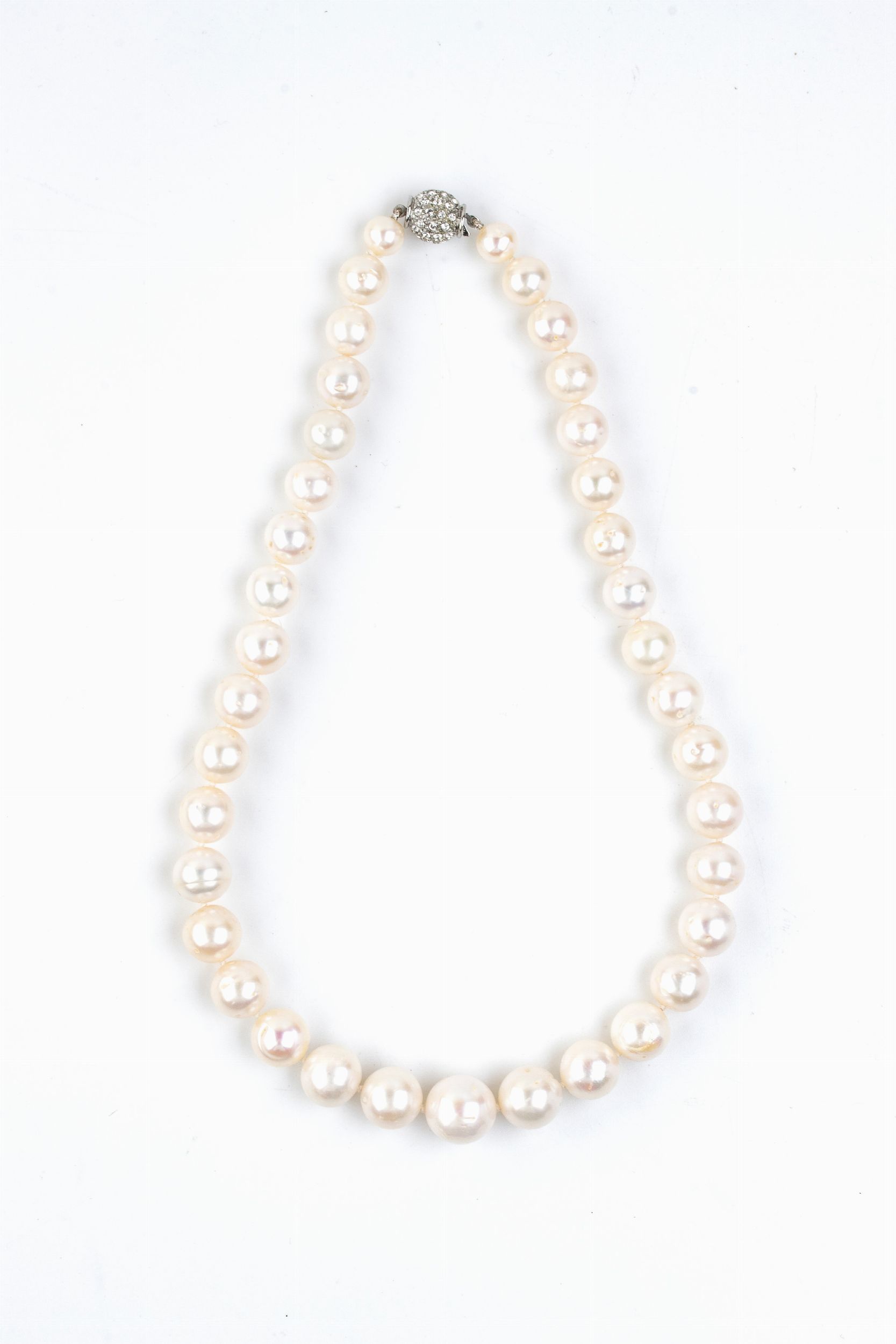 ad un filo di perle coltivate d'acqua salata, fermezza a scomparsa in oro bianco a basso titolo decorata con paste vitree.Diametro perle mm. Peso 105,7 gr.Stato di conservazione: **** buono.