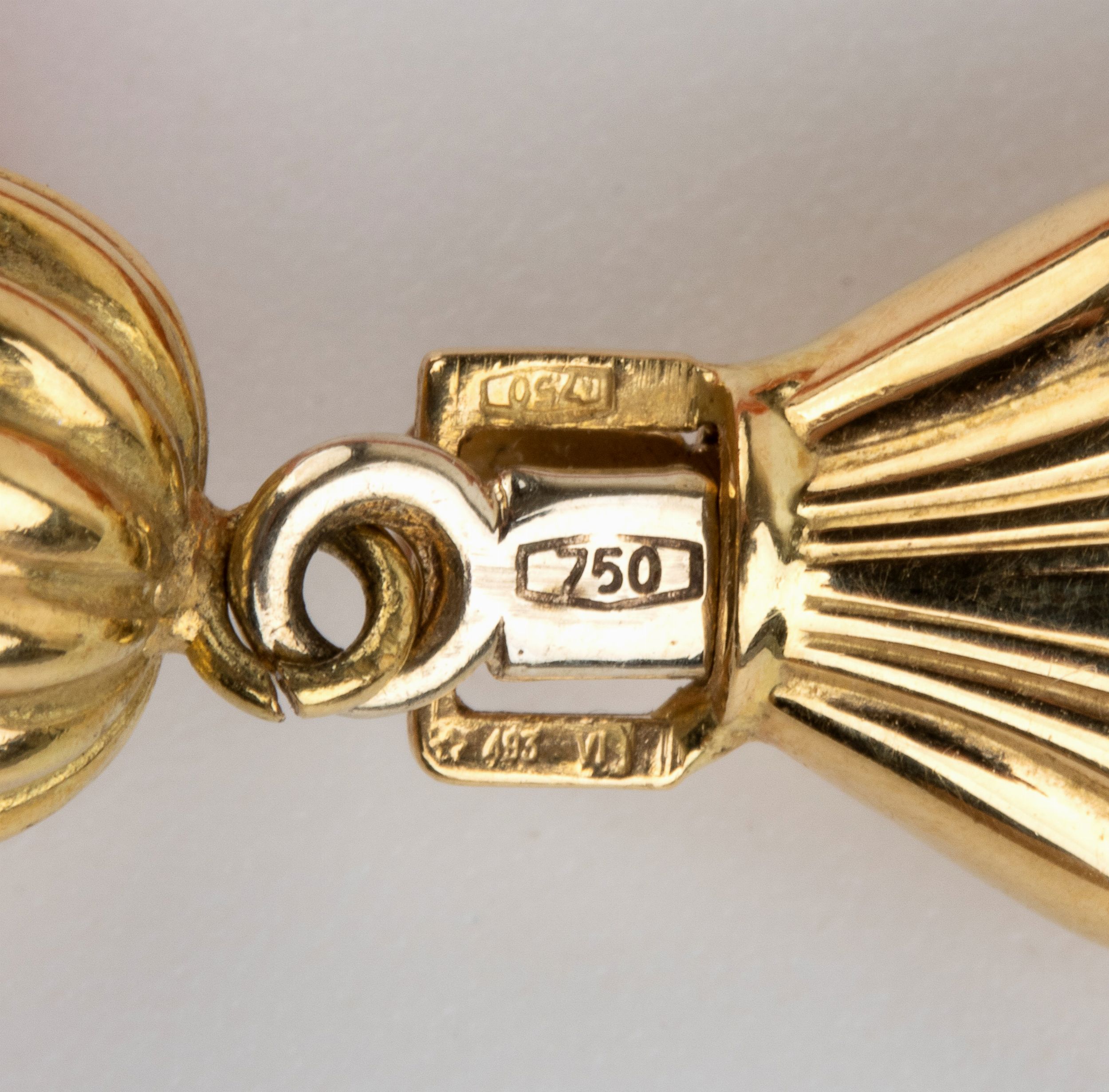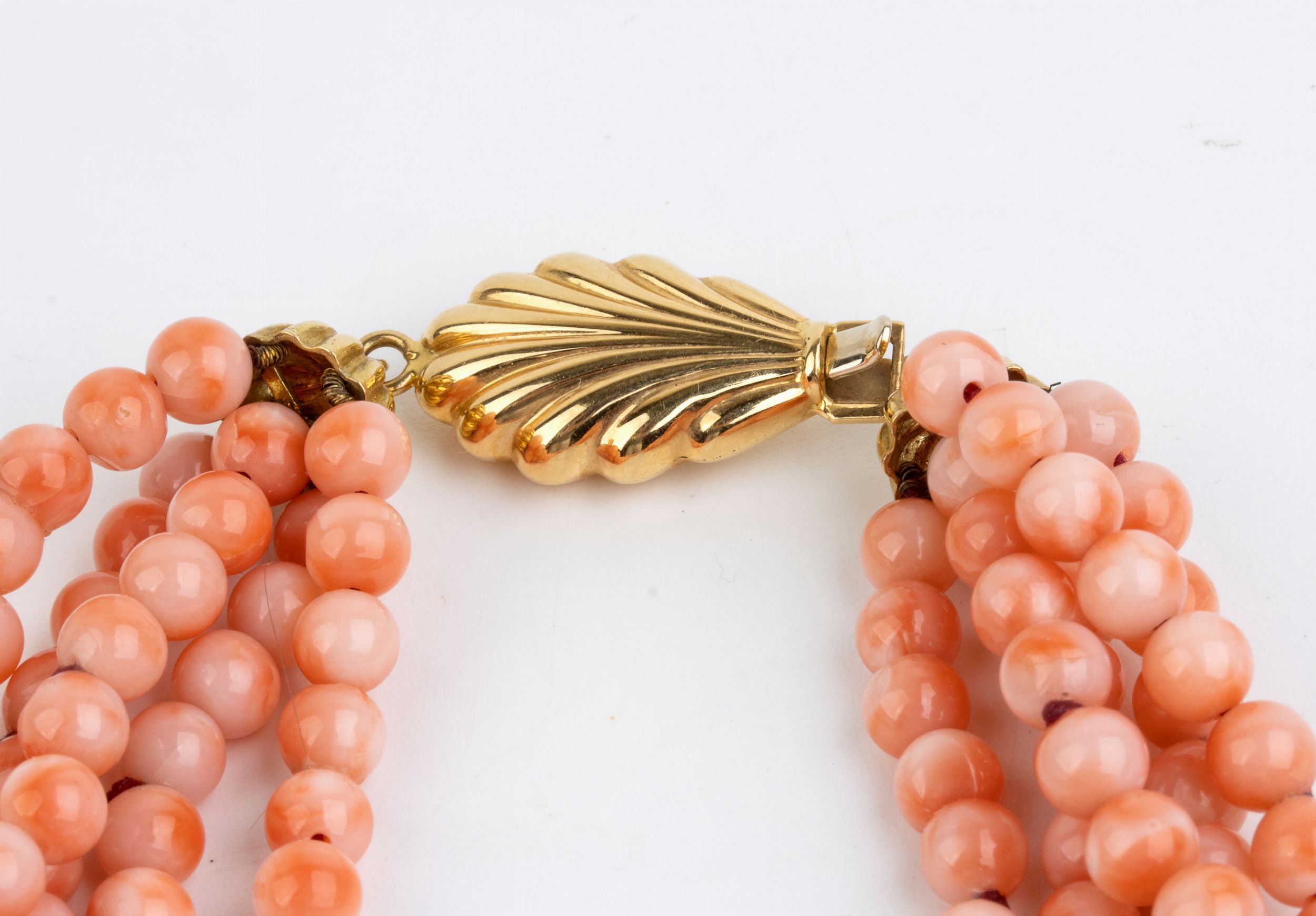 a 5 fili di sfere di corallo Deep Sea (corallium sp. nov.), fermezza in oro giallo 18k.Diametro 5.5 - 6 mm. Punzonato 750 - 493 VI. Lunghezza 68,3 cm. Peso 123,3 gr.Stato di conservazione: **** buono.