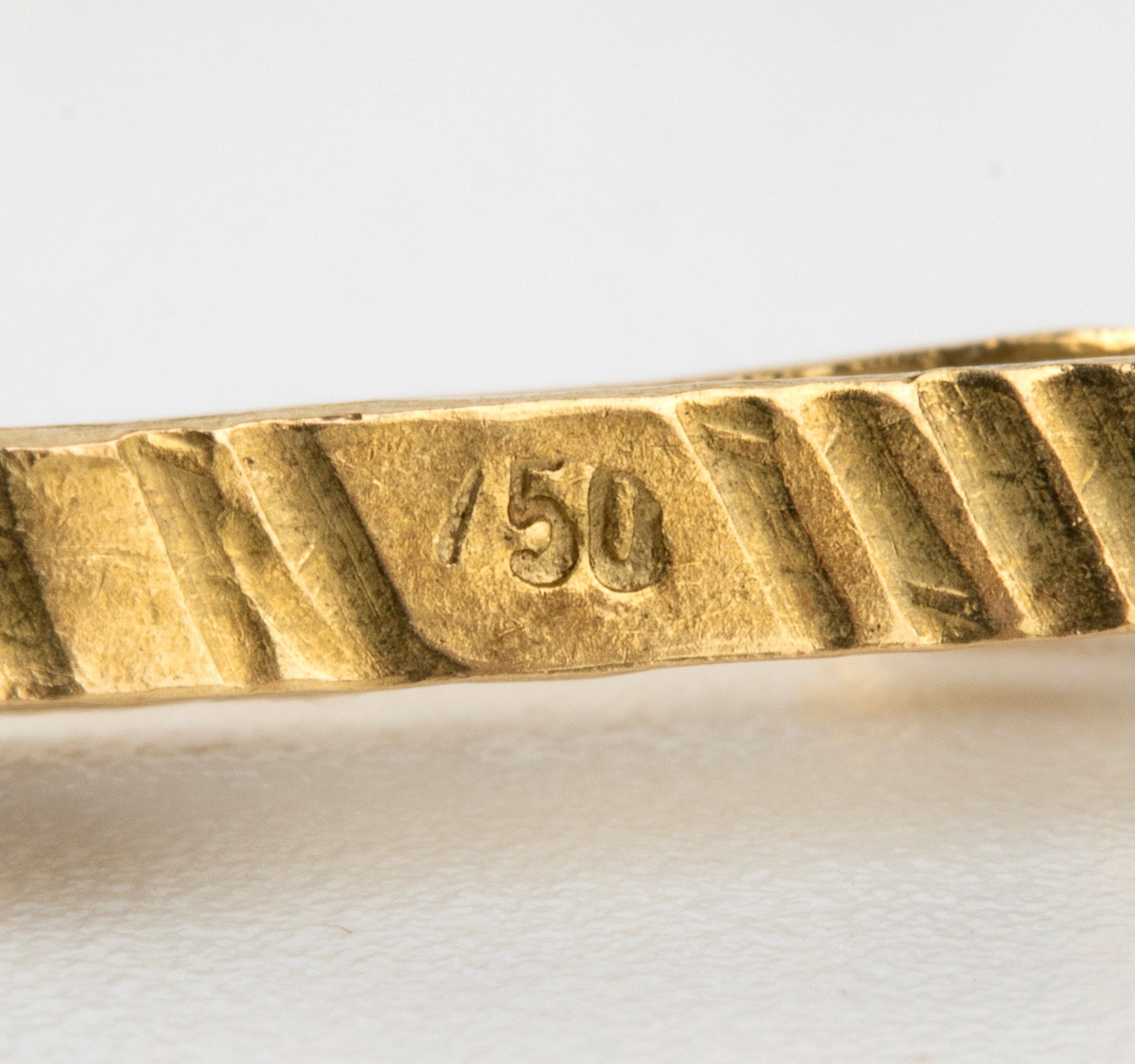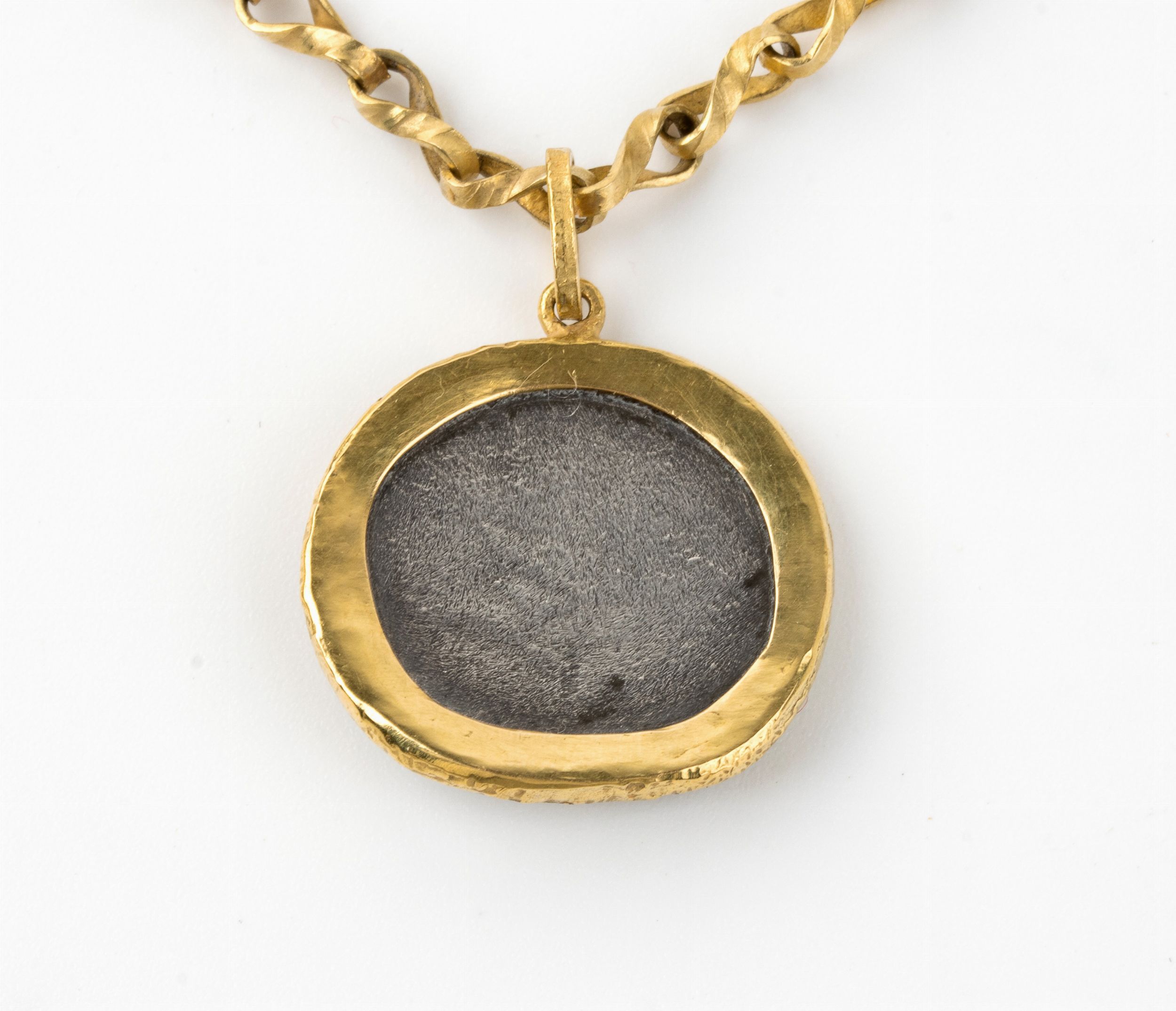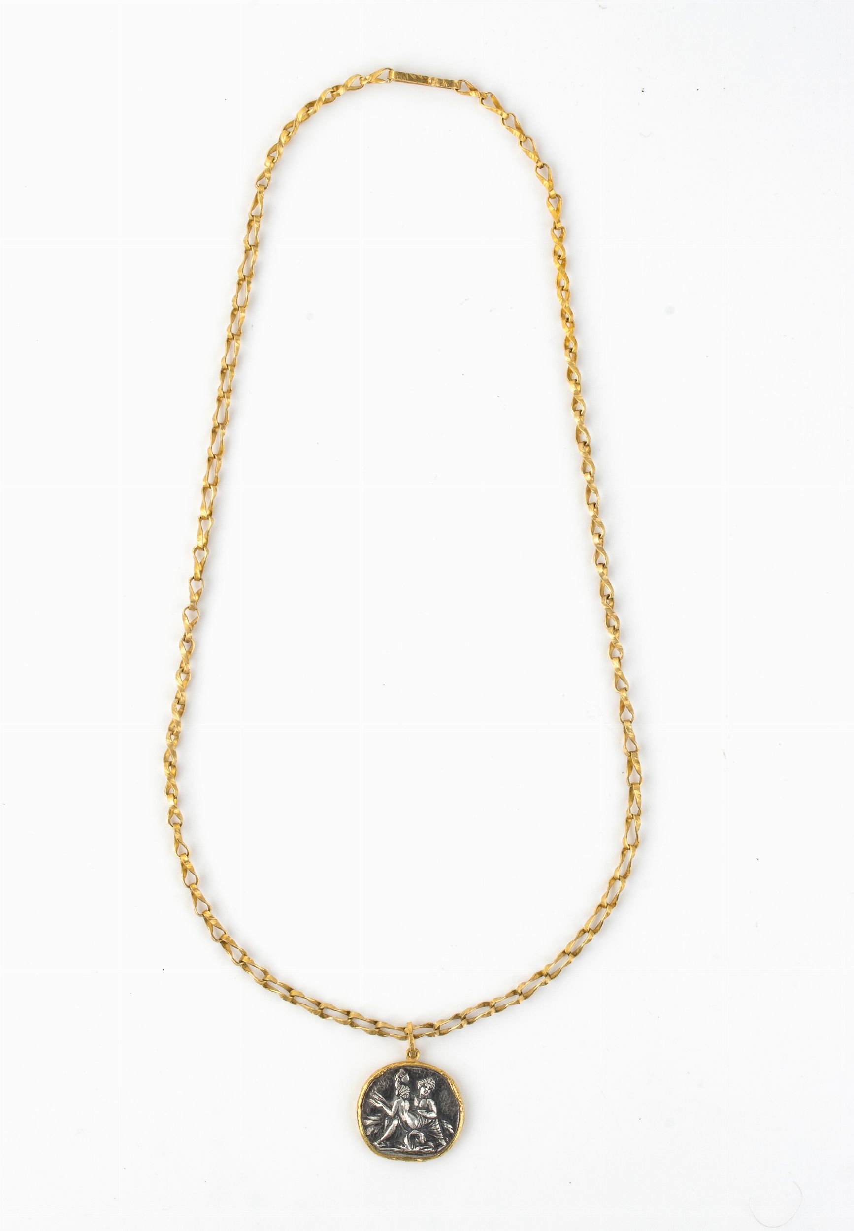 pendente incastonato con moneta raffigurante le figure mitologiche di Afrodite e Dioniso durante un baccanale, castone e catena in oro giallo 18k.