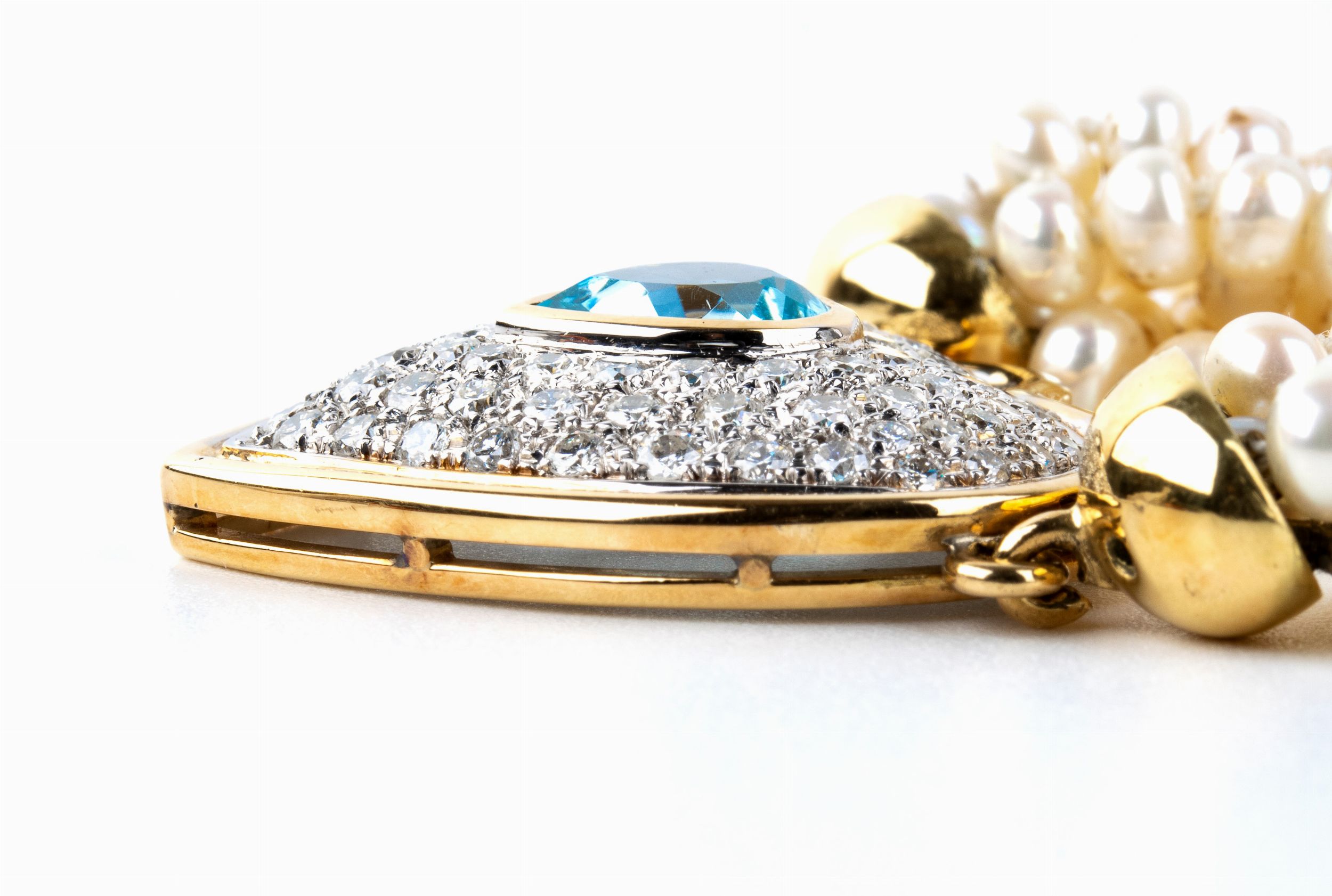 ad un filo di perle coltivate d'acqua dolce, centrale in oro giallo 18k incastonato con topazio azzurro contornato da diamanti.