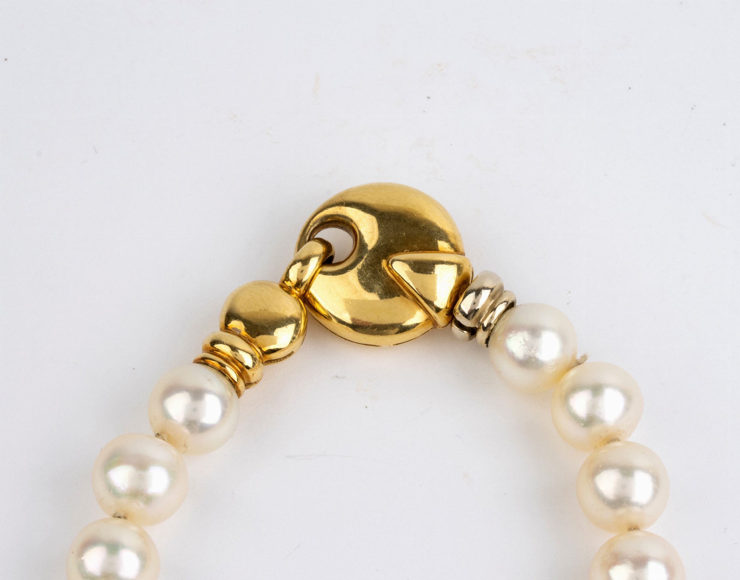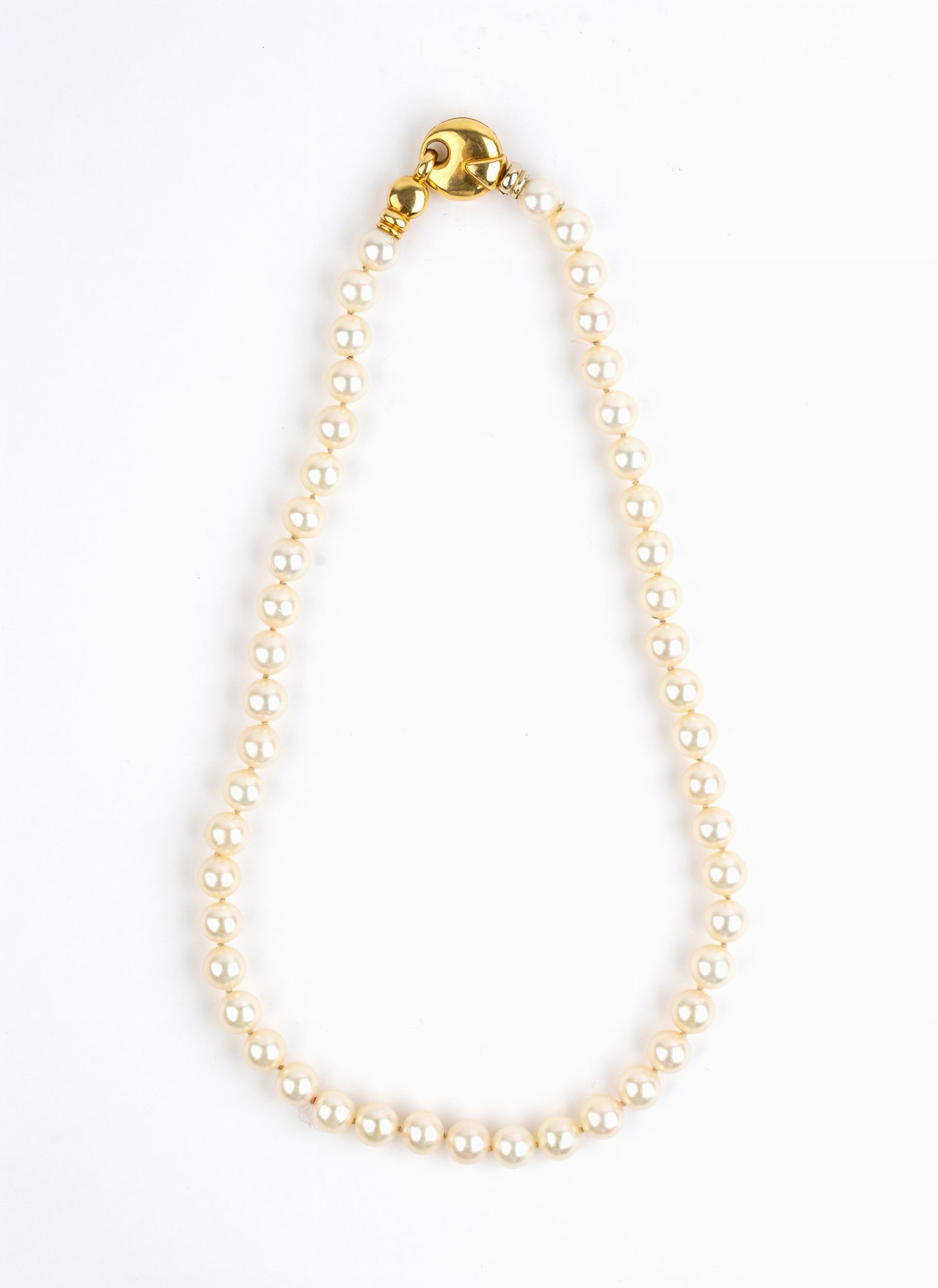ad un filo di perle coltivate d'acqua salata, diametro 8,5 - 9 mm, chiusura a scomparsa in oro giallo 18k.Punzonato 750 - 1557 AL. Lunghezza 48 cm. Peso 51,4 gr.Stato di conservazione: **** buono.
