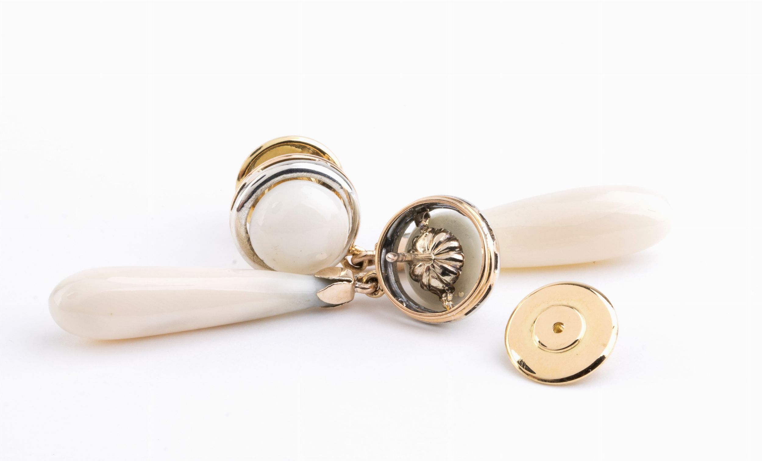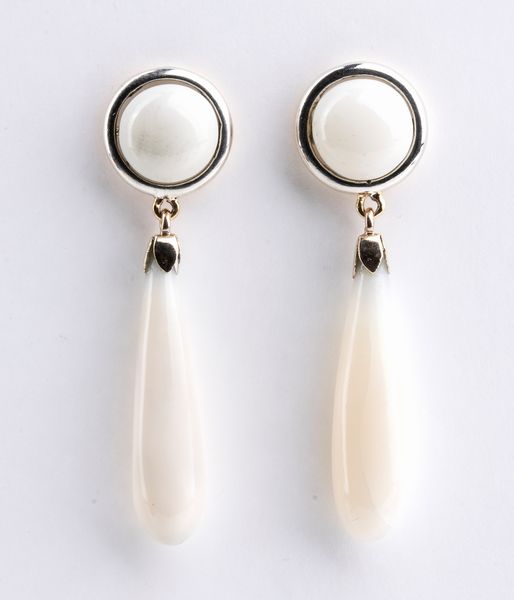 in oro giallo e bianco 18k con pendente in corallo bianco (corallium Konjoy).Punzonati 750. Lunghezza 4,5 cm. Peso complessivo 9,7 gr.Stato di conservazione: ***** eccellente.