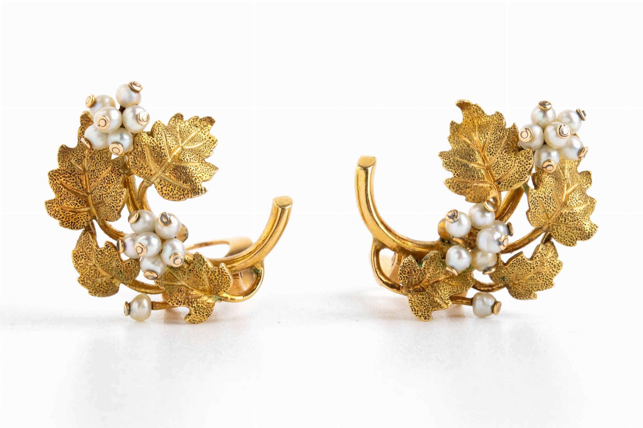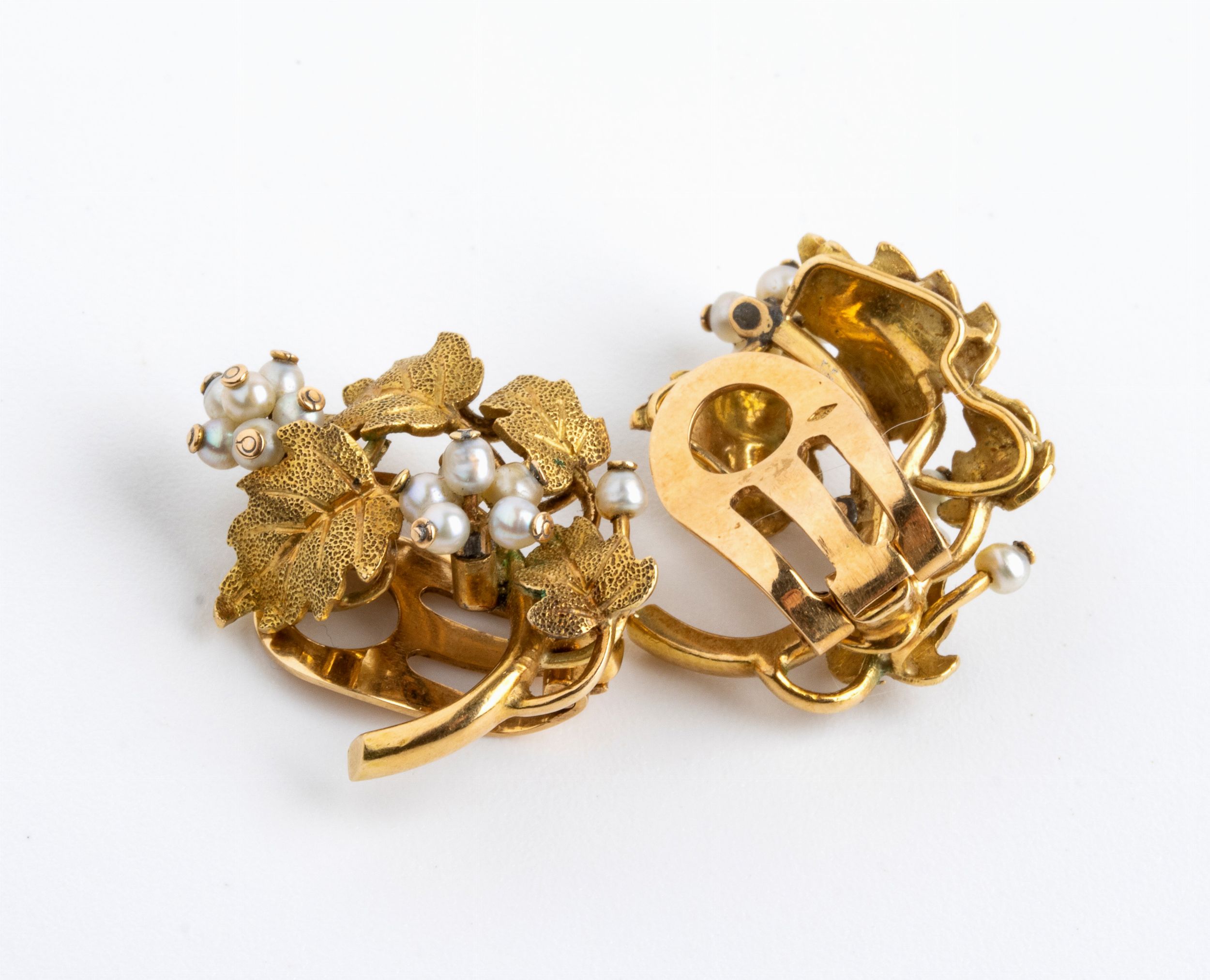 in oro giallo 18k con motivo di foglie e rami, frutti in piccole perle.Punzonato 750. Dimensioni 2,2 x 1,8 cm. Peso complessivo 9,5 gr.Stato di conservazione: **** buono.