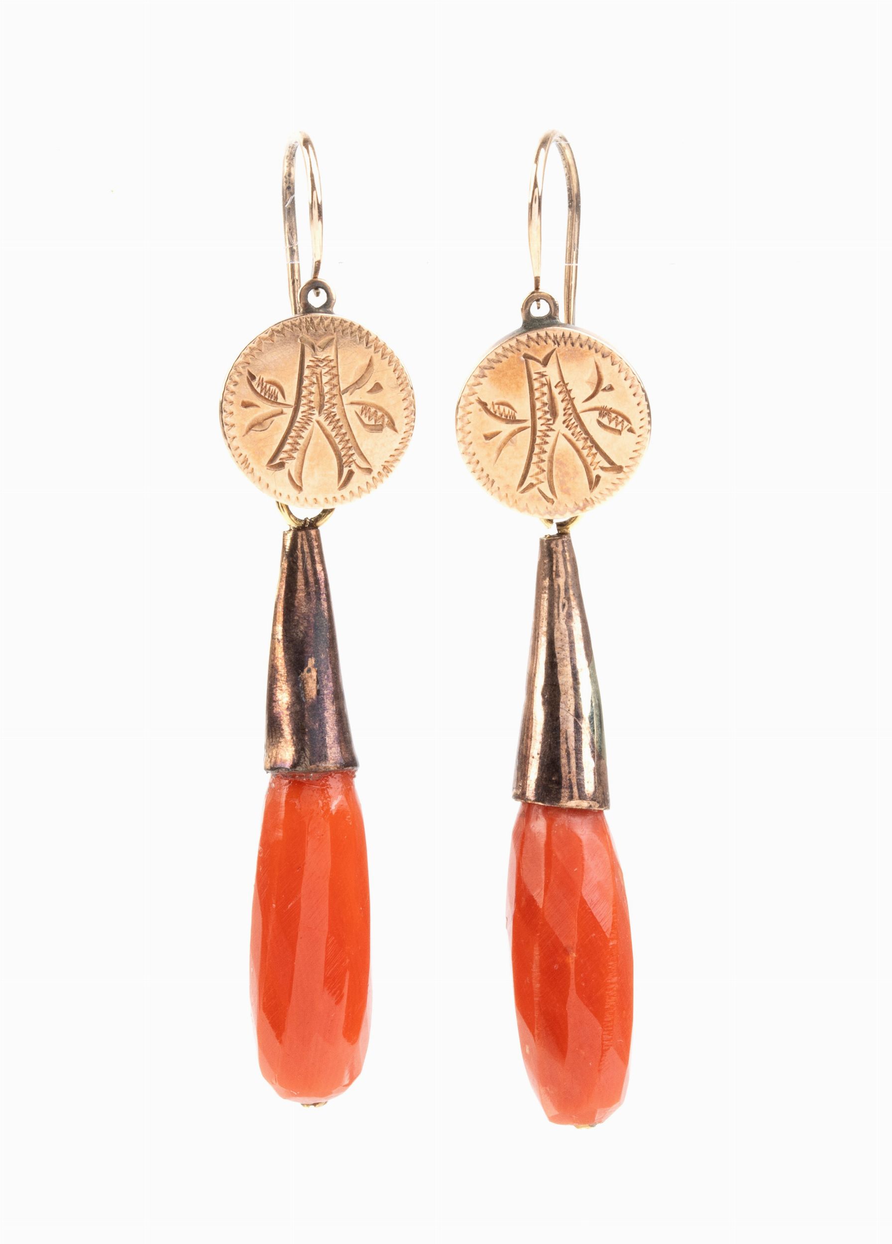 ciascuno con goccia di corallo Mediterraneo (corallium rubrum).Lunghezza 5,2 cm. Peso complessivo 5,2 gr.Stato di conservazione: **** buono.