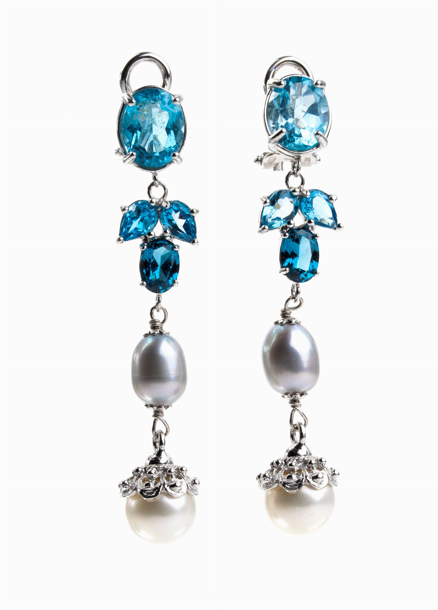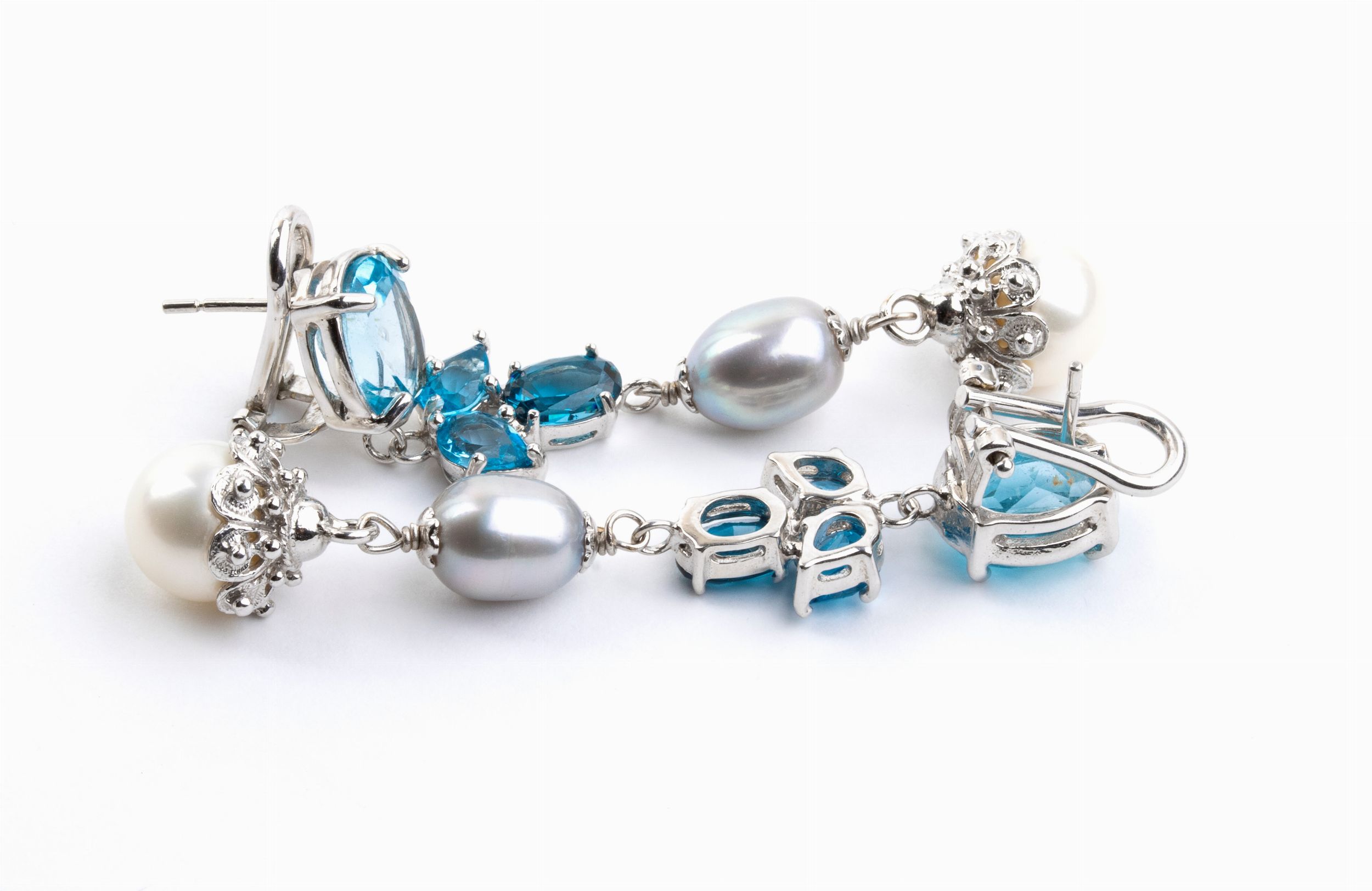 in oro bianco 18k, con linea di topazi azzurri e perle coltivate d'acqua salata e d'acqua dolce. Punzonato 750. Lunghezza 6 cm. Peso complessivo 16,5 gr.Stato di conservazione: ***** eccellente.