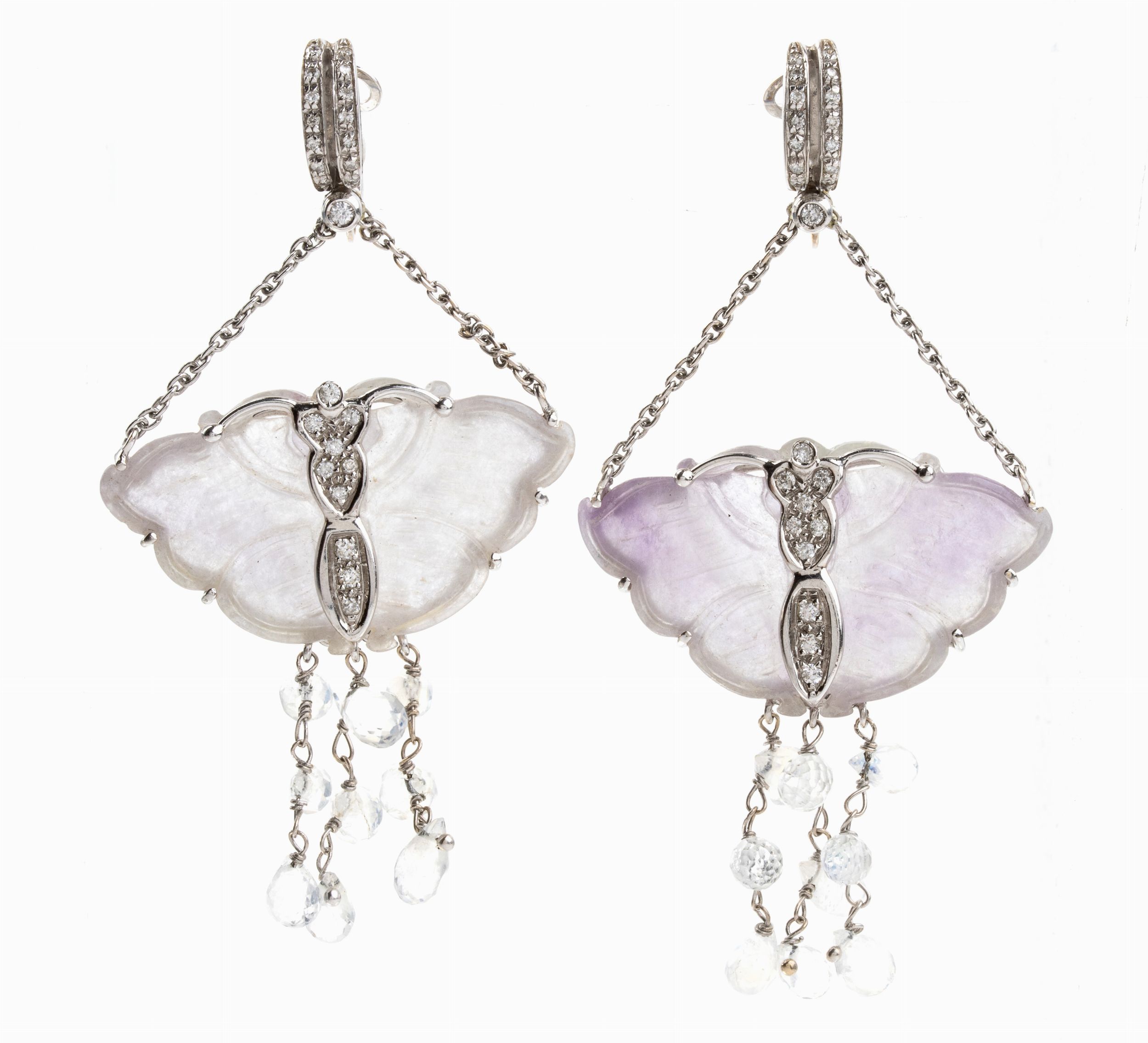 in oro bianco 18k, impreziositi da diamanti, gocce di labradorite e lavanda intagliata nella forma di una farfalla.