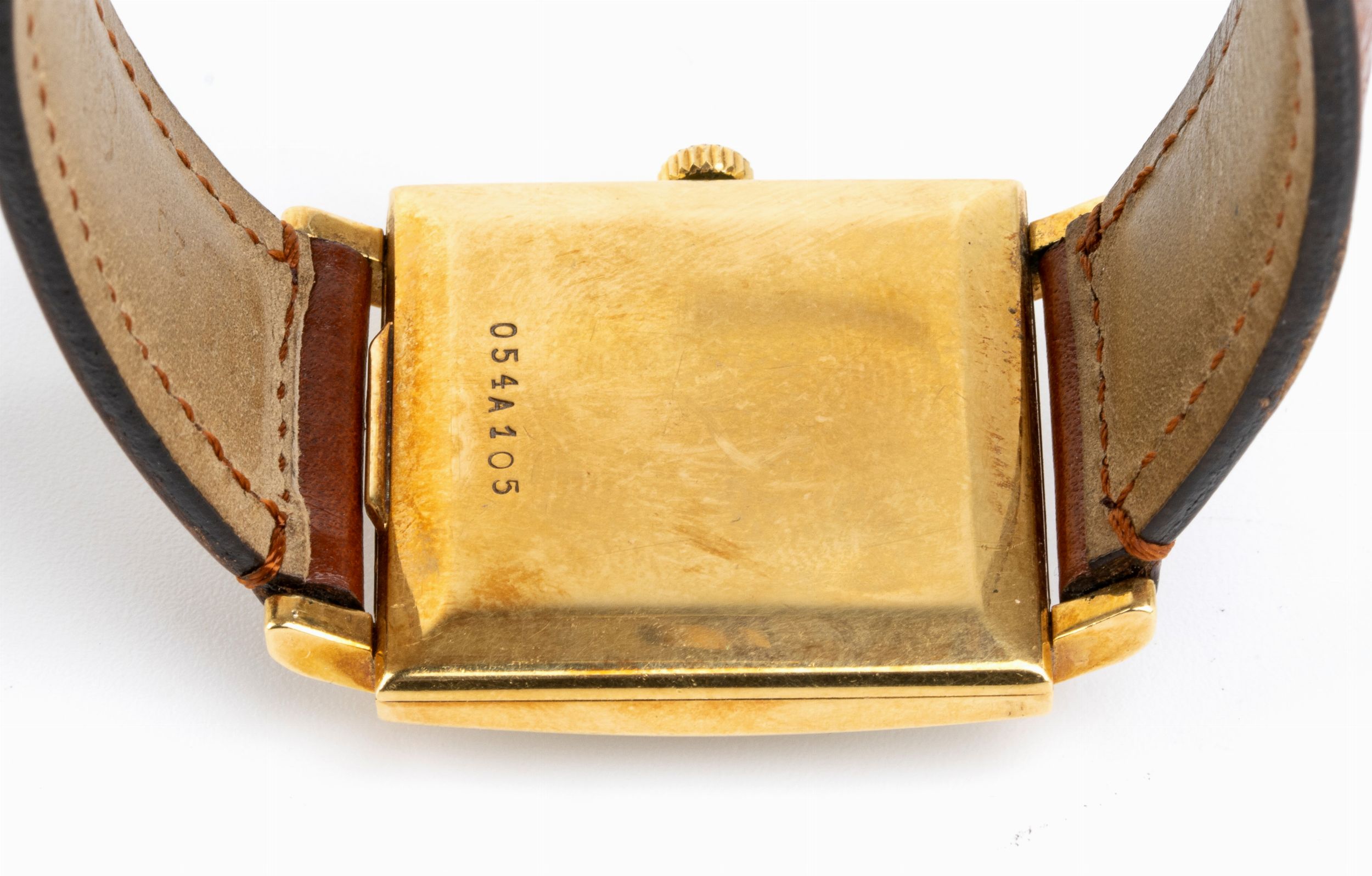 cassa in oro giallo 18k di forma quadrata, cinturino in pelle, quadrante bianco con indici a sfera dorata, secondi alle 6, movimento meccanico a carica manuale. Matricola 054A105.