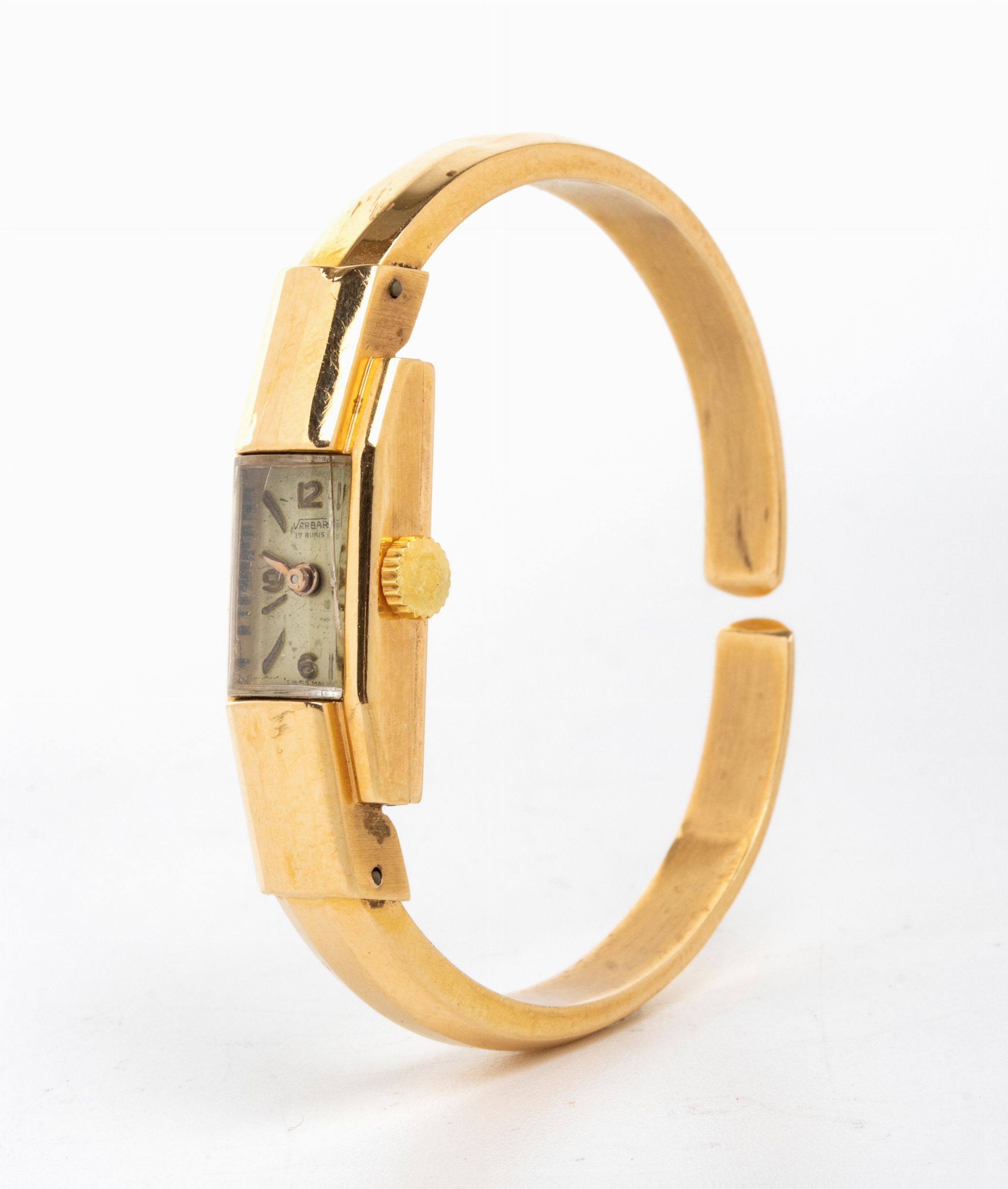 cassa e bracciale a molla in oro giallo 18k, quadrante argenté con scritta Varbar - 17 Rubis - Swiss made, indici arabi e dritti dorati.