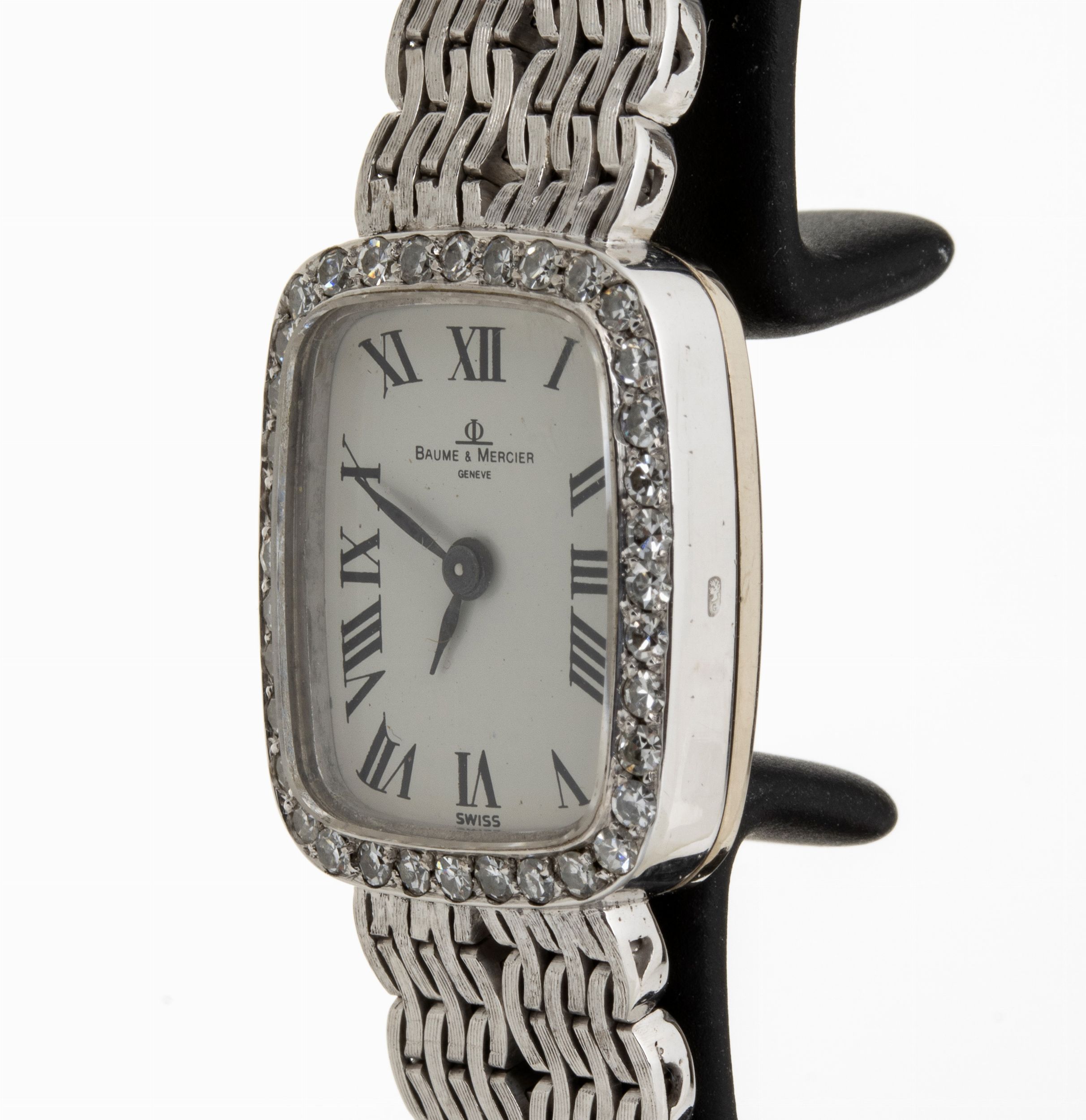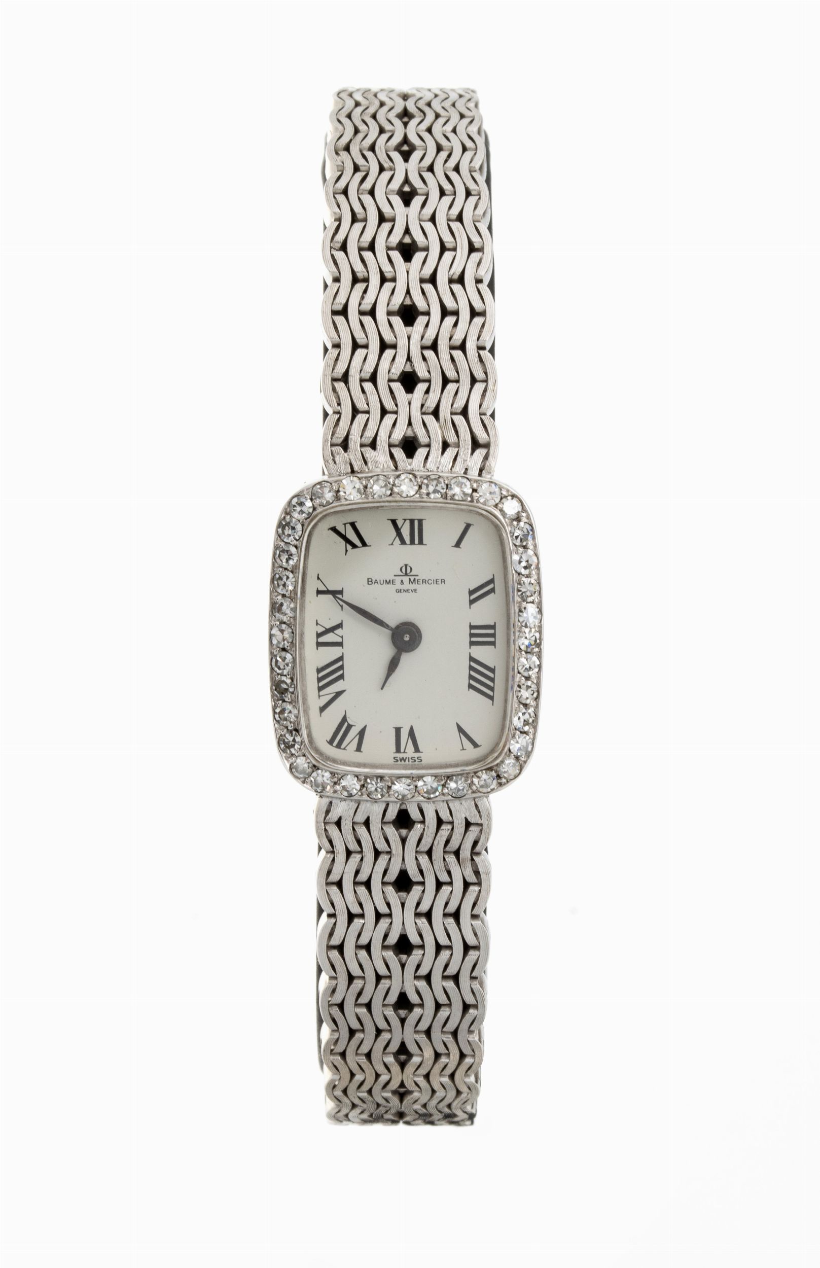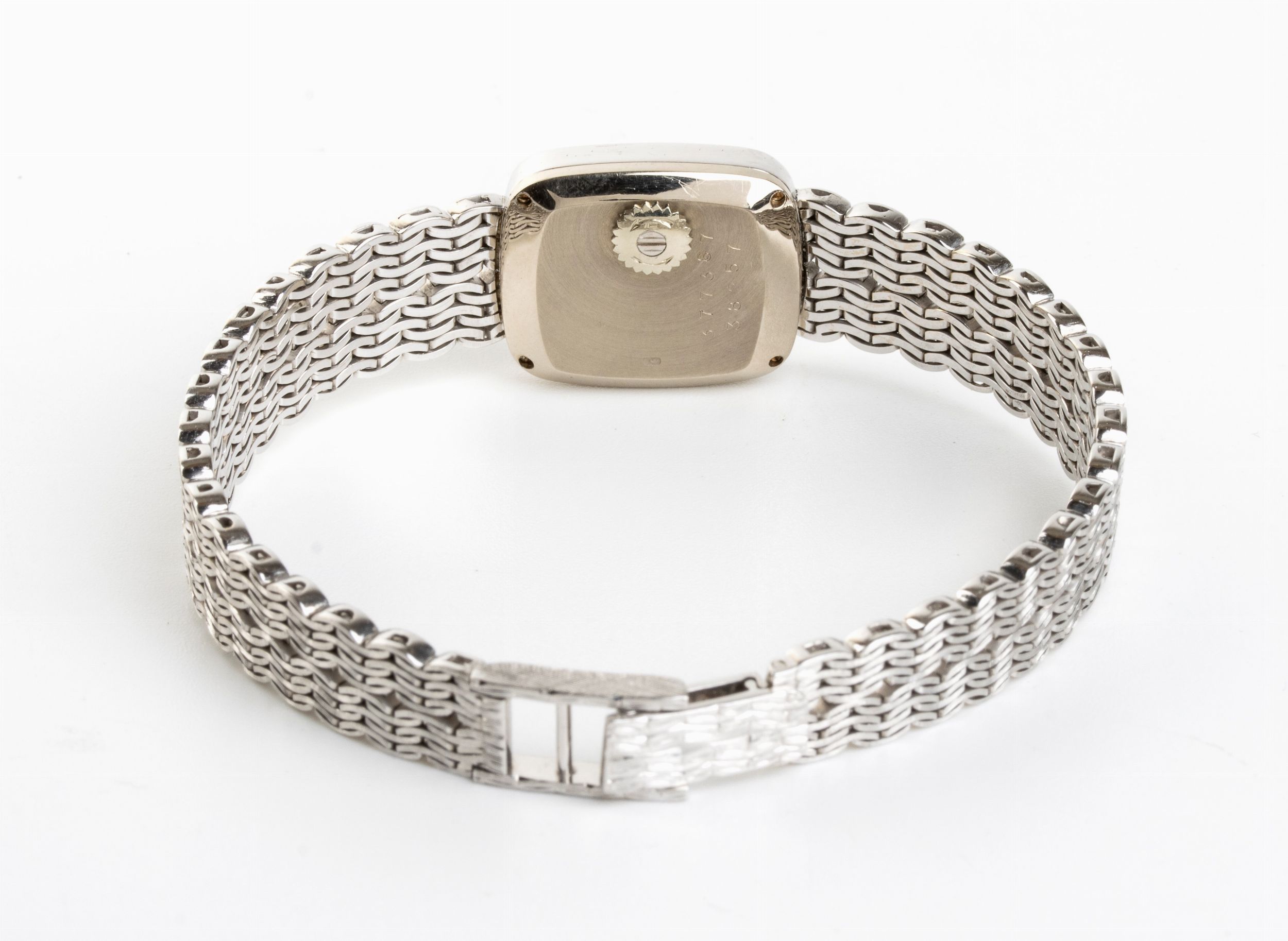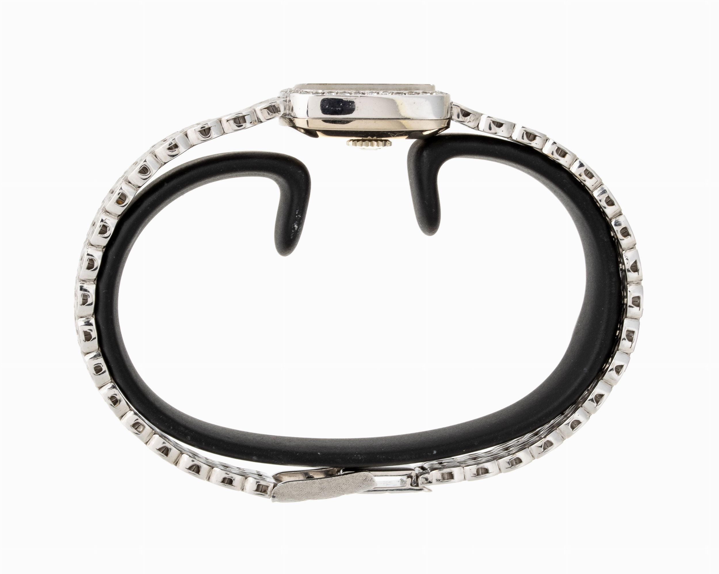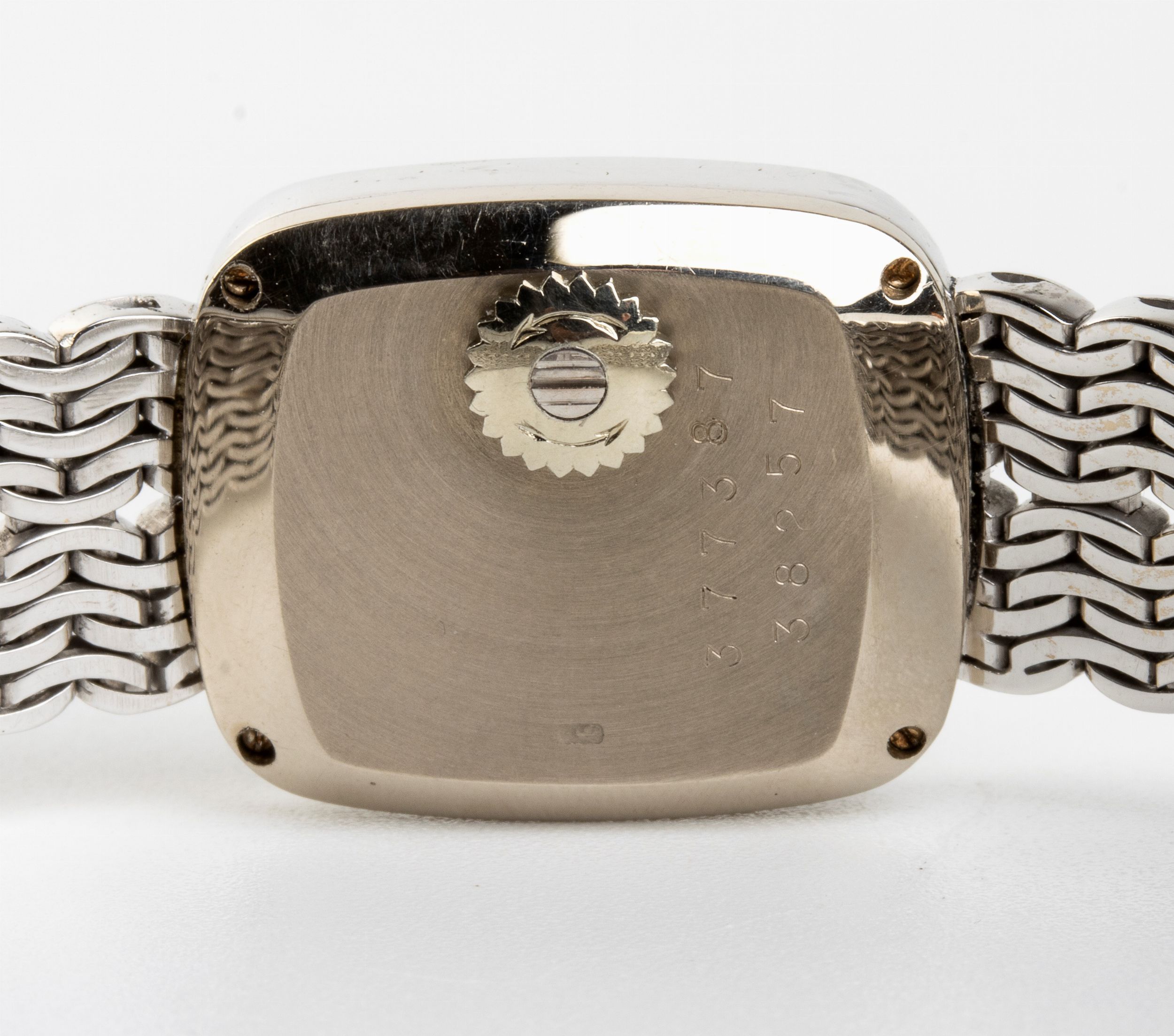 cassa in oro bianco 18k, di forma rettangolare, bracciale integrato, con quadrante bianco con numeri romani contornato da diamanti. Movimento meccanico a carica manuale, corona sul fondello.