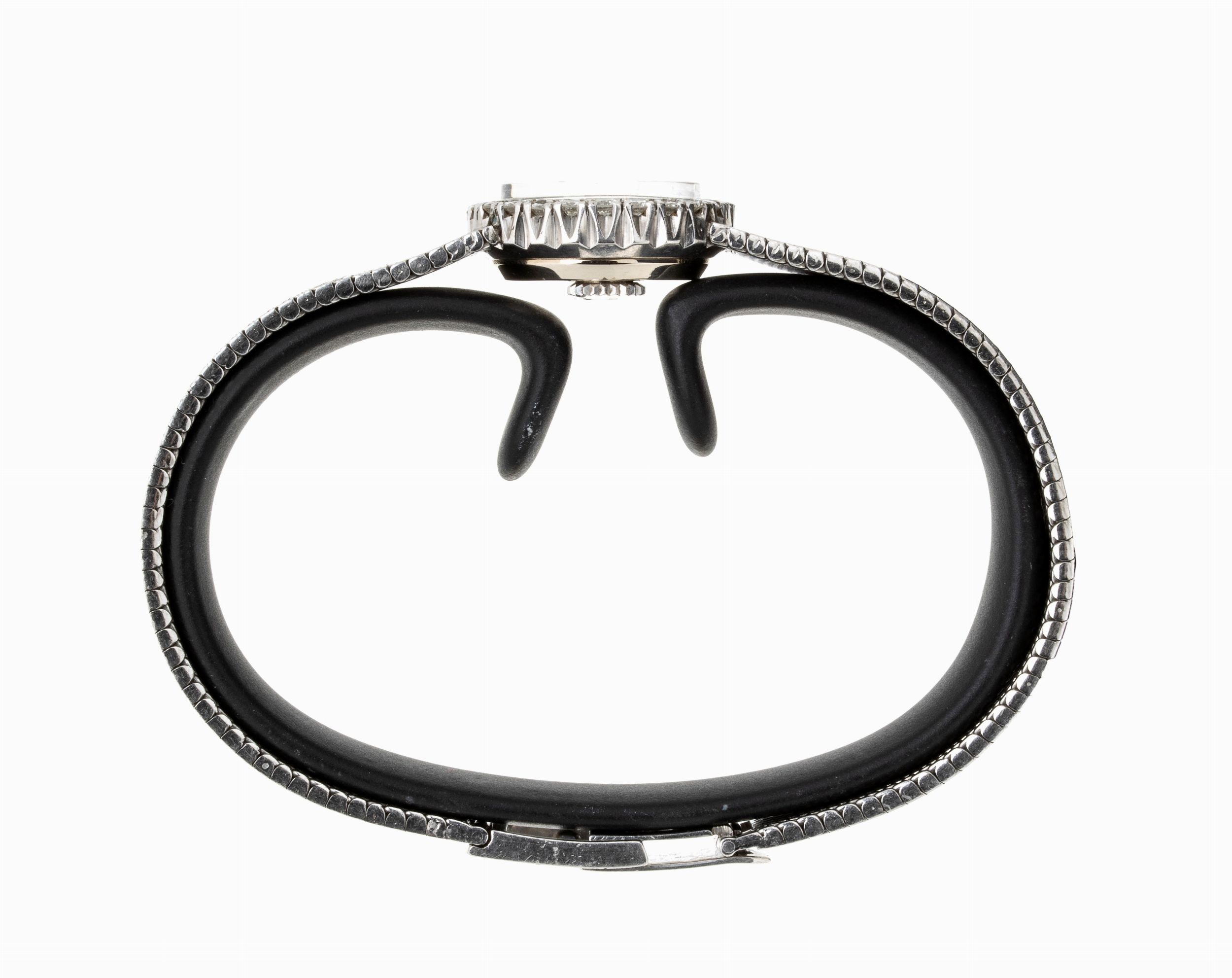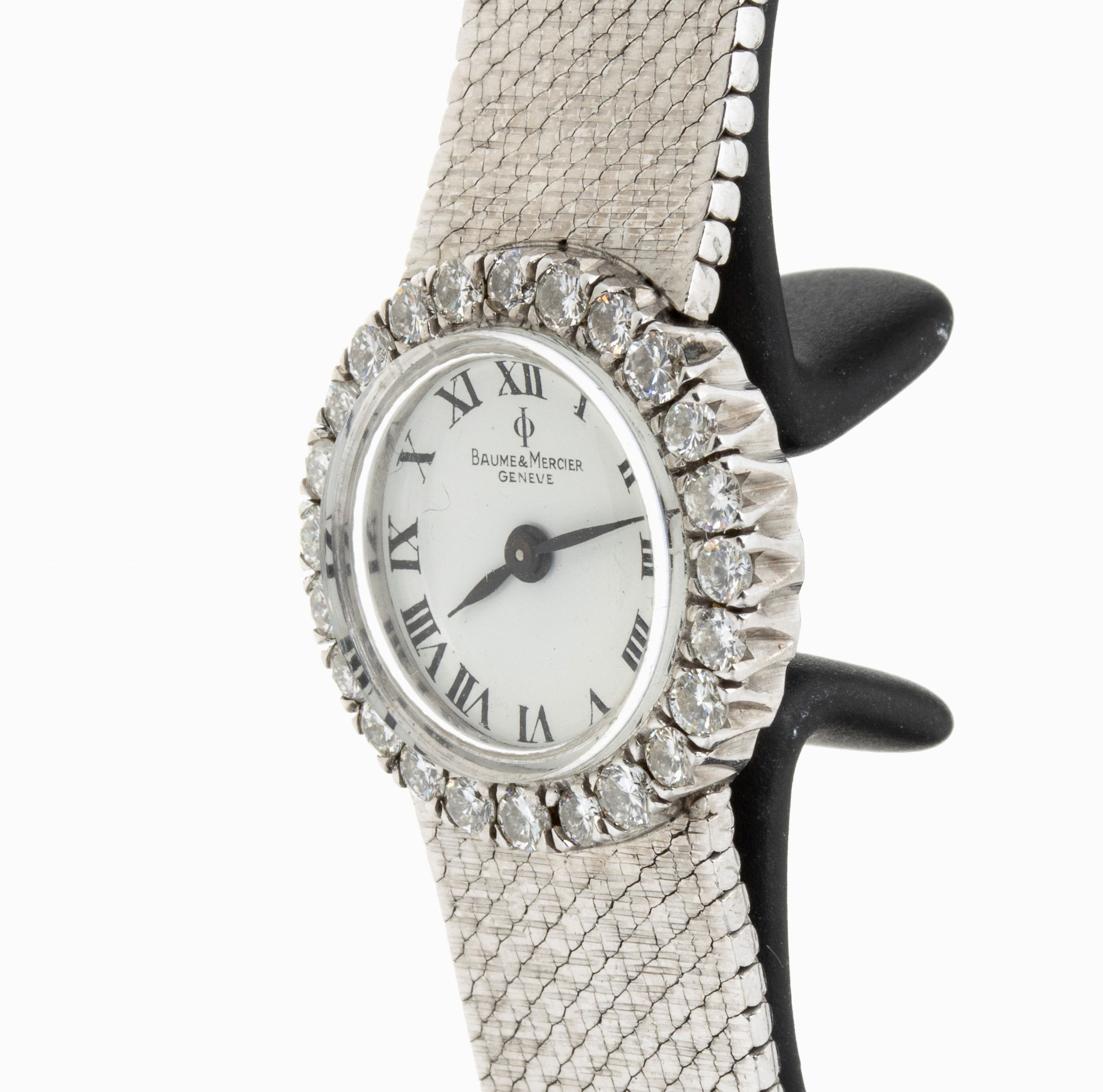 cassa in oro bianco 18k con cinturino integrato in oro bianco, quadrante bianco con numeri romani e contornato da diamanti. Movimento meccanico a carica manuale con corona sul fondello.