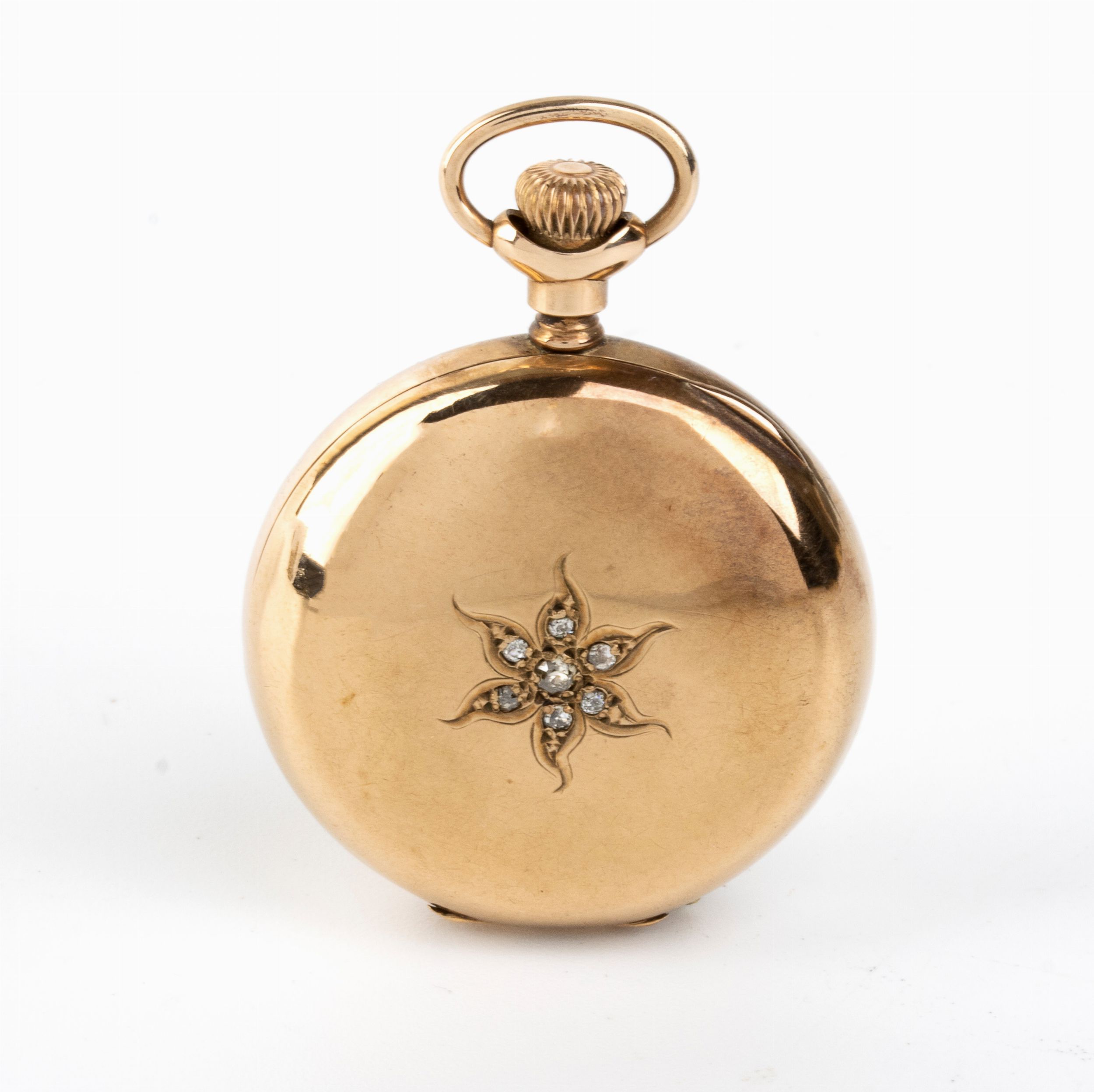 cassa tripla in oro giallo 18k decorato con n. 07 diamanti di forma rotonda, taglio a rosa, quadrante ceramica con indici romani e secondi alle 6. Movimento meccanico a carica a corona con scappamento a cilindro.