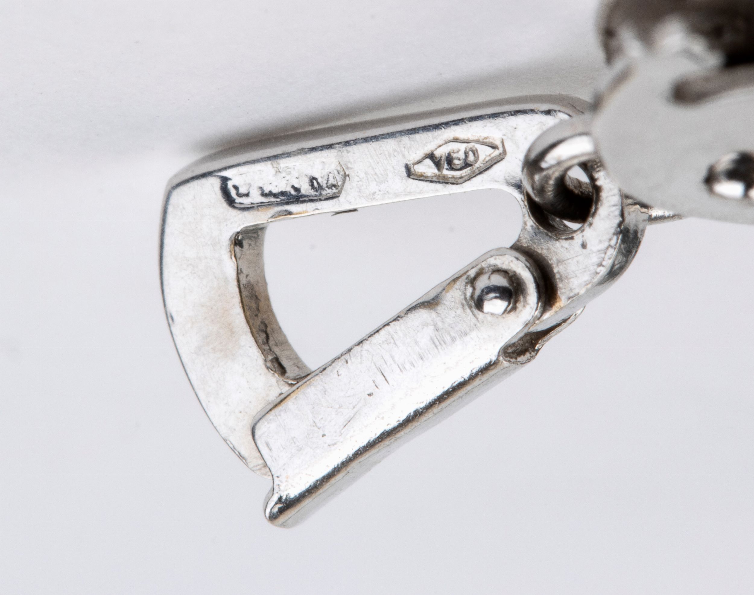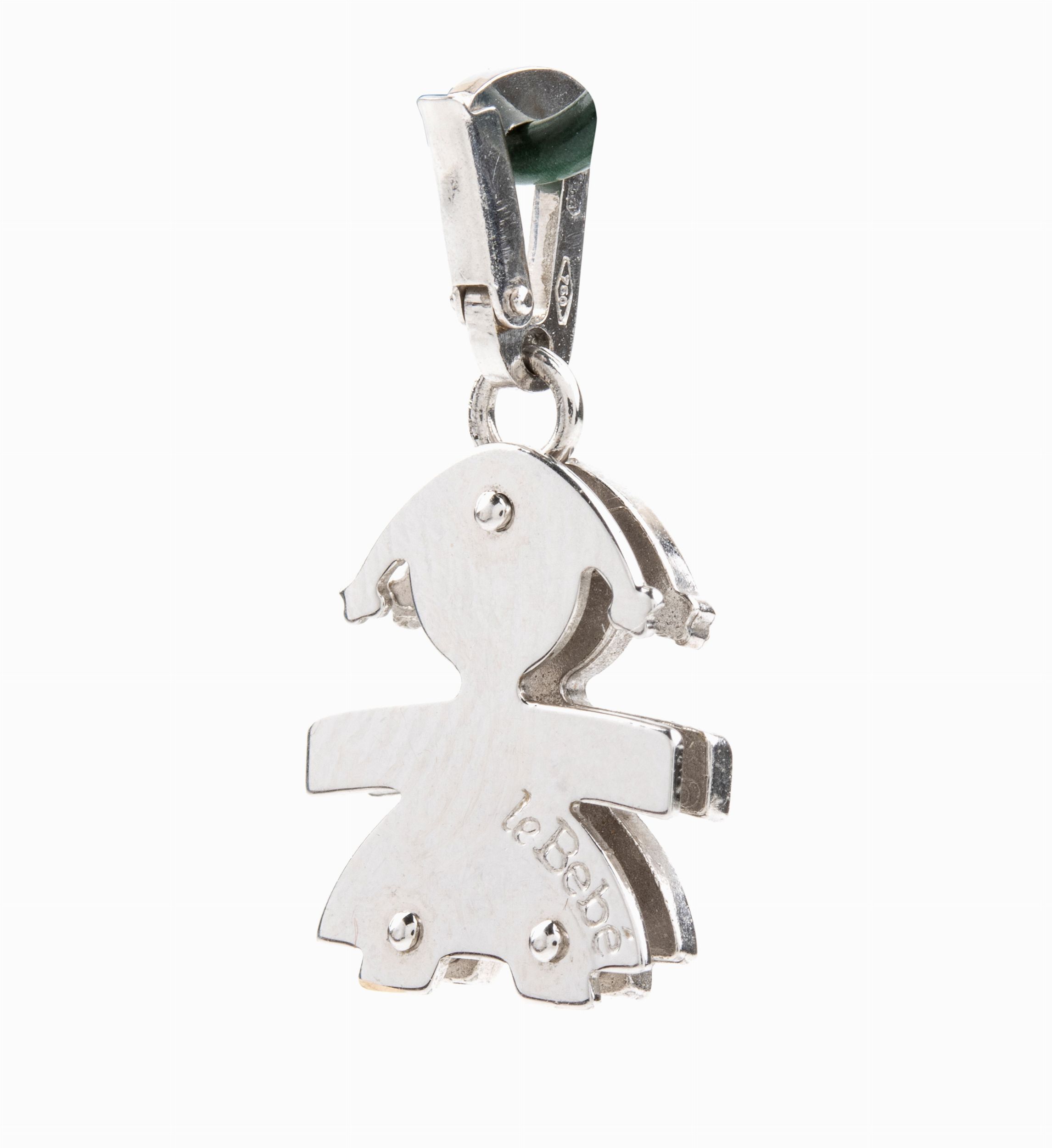 in oro bianco 18k , a forma di bambina impreziosito da n. 18 diamanti di forma rotonda, taglio brillante, circa 0.20 ct, F-G, VVS.Punzonato 750 - LEBEBE. Dimensioni 2 x 1 cm. Peso 2,2 gr.Stato di conservazione: **** buono.
