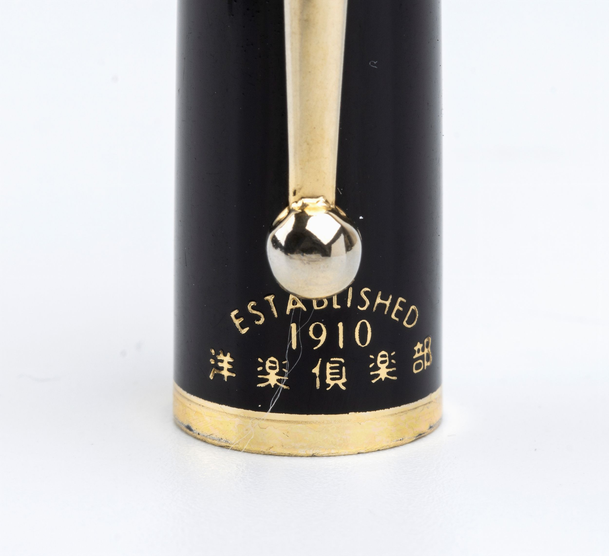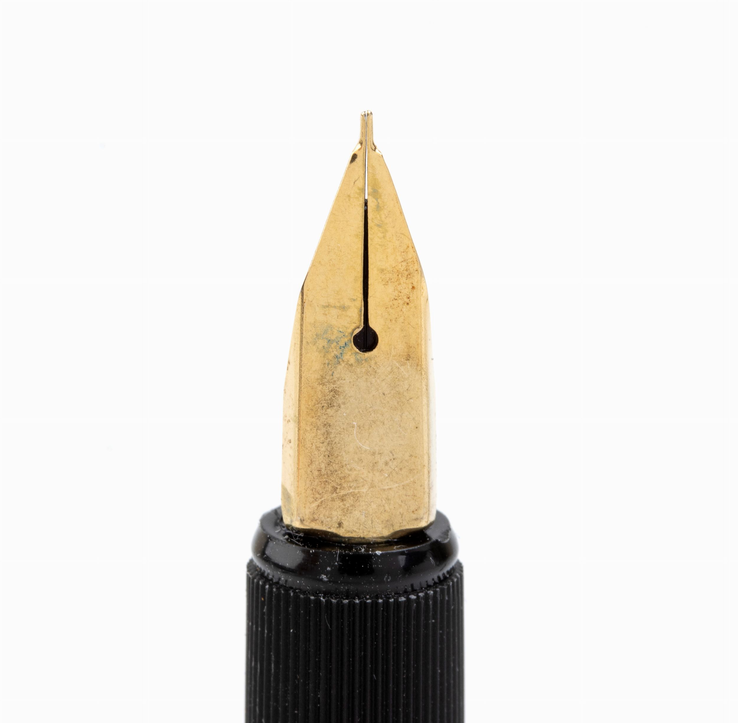 corpo e cappuccio neri, pennino in metallo. Sistema di caricamento a cartuccia Lunghezza penna 12 cm, peso 15 gr. Stato di conservazione: **** buono. La penna non è stata testata e anche se sembra funzionante, potrebbe necessitare di una piccola revisione.