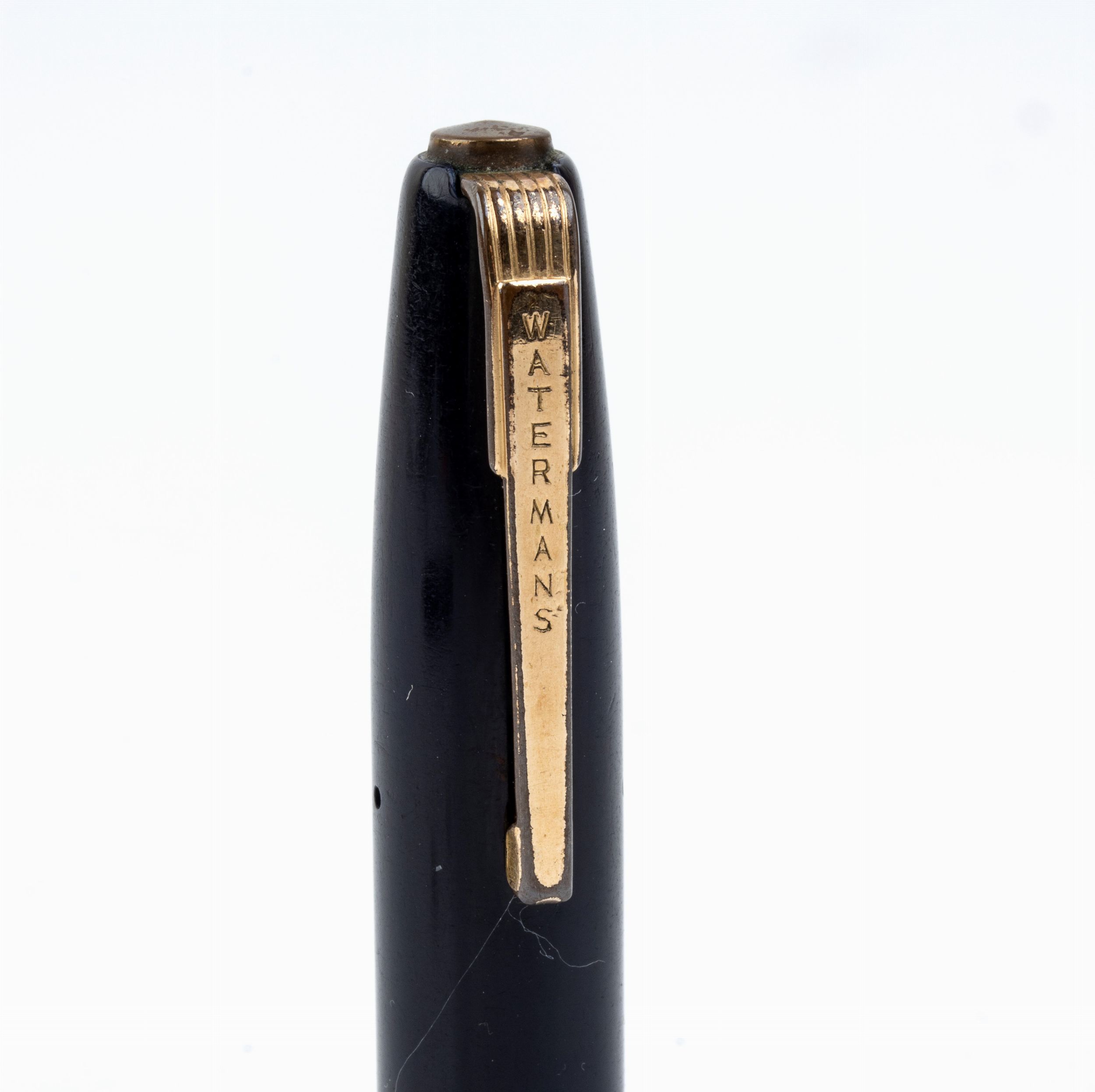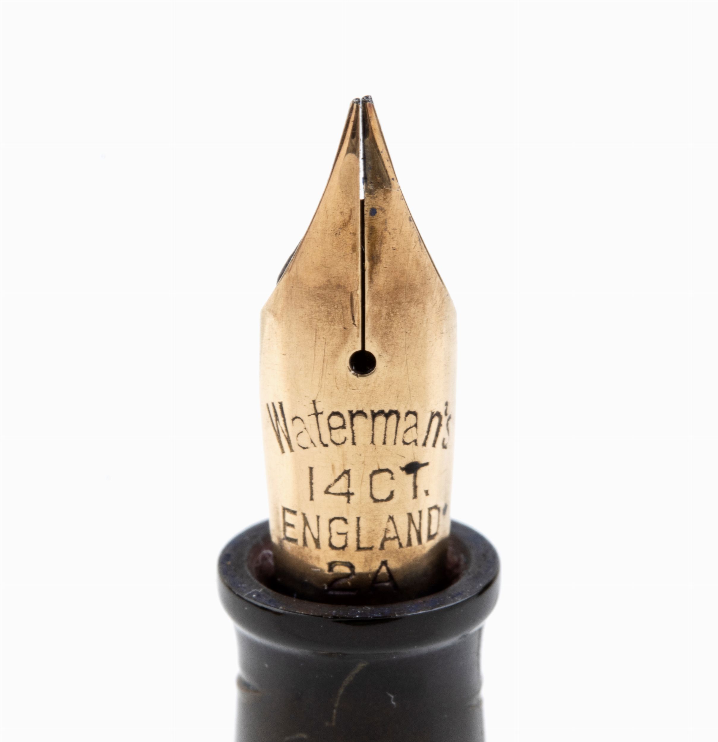 corpo in lacca nera con finiture dorate, pennino in oro 14k riportante la dicitura 14K - Waterman - England - 2A. Sistema di caricamento a stantuffo.