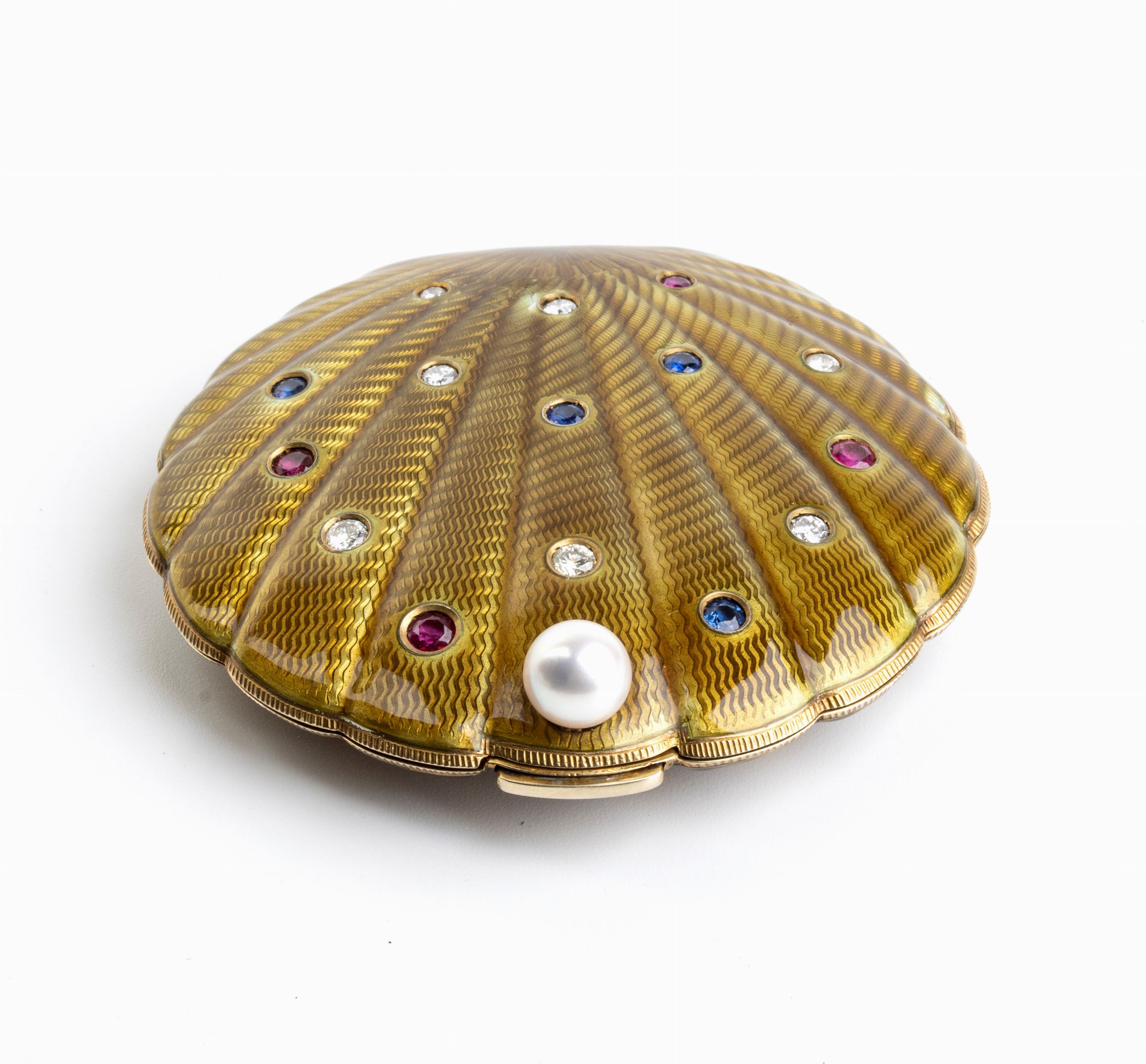 a forma di conchiglia decorata con smalto, impreziosita da zaffiri, rubini, diamanti ed una perla coltivata d'acqua salata.