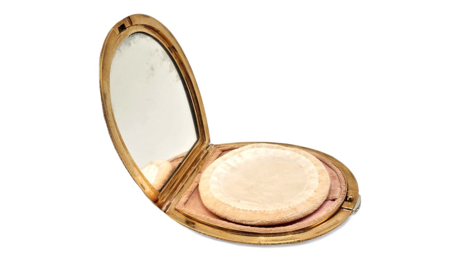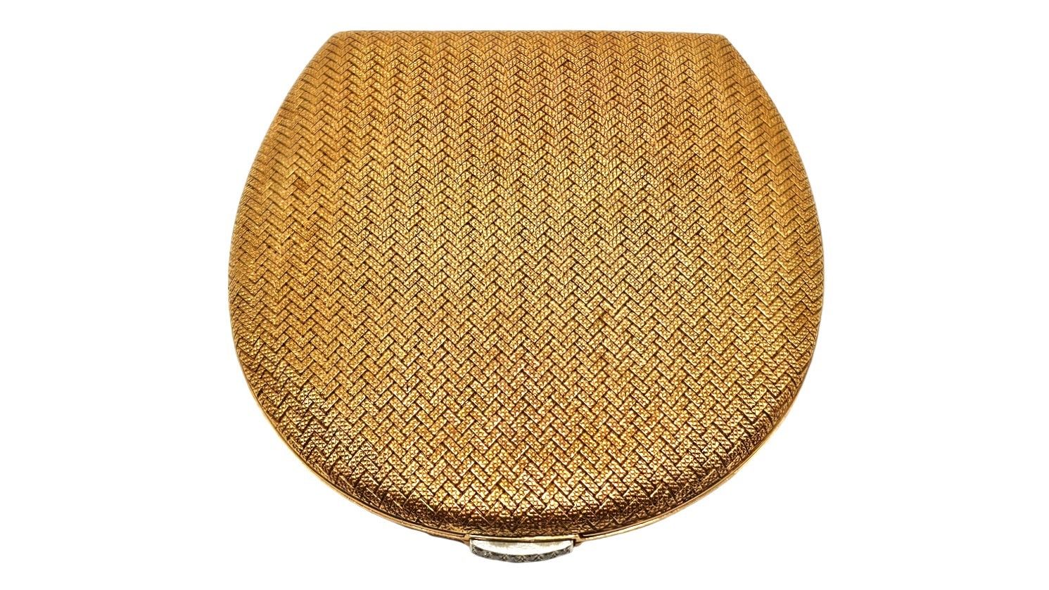 superficie realizzata con motivo di sottile intreccio a vimini in oro giallo 18k, chiusura in oro bianco con dettaglio in diamanti; corredata di specchio e retino interno Firmato BULGARI.