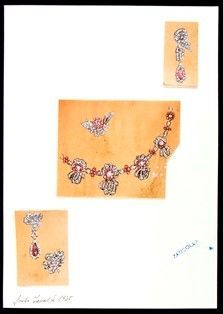 disegni di due orecchini, due spille ed un girocollo in diamanti e rubini.Tecniche miste su velina applicata su cartoncino.Stato di conservazione: **** buono.