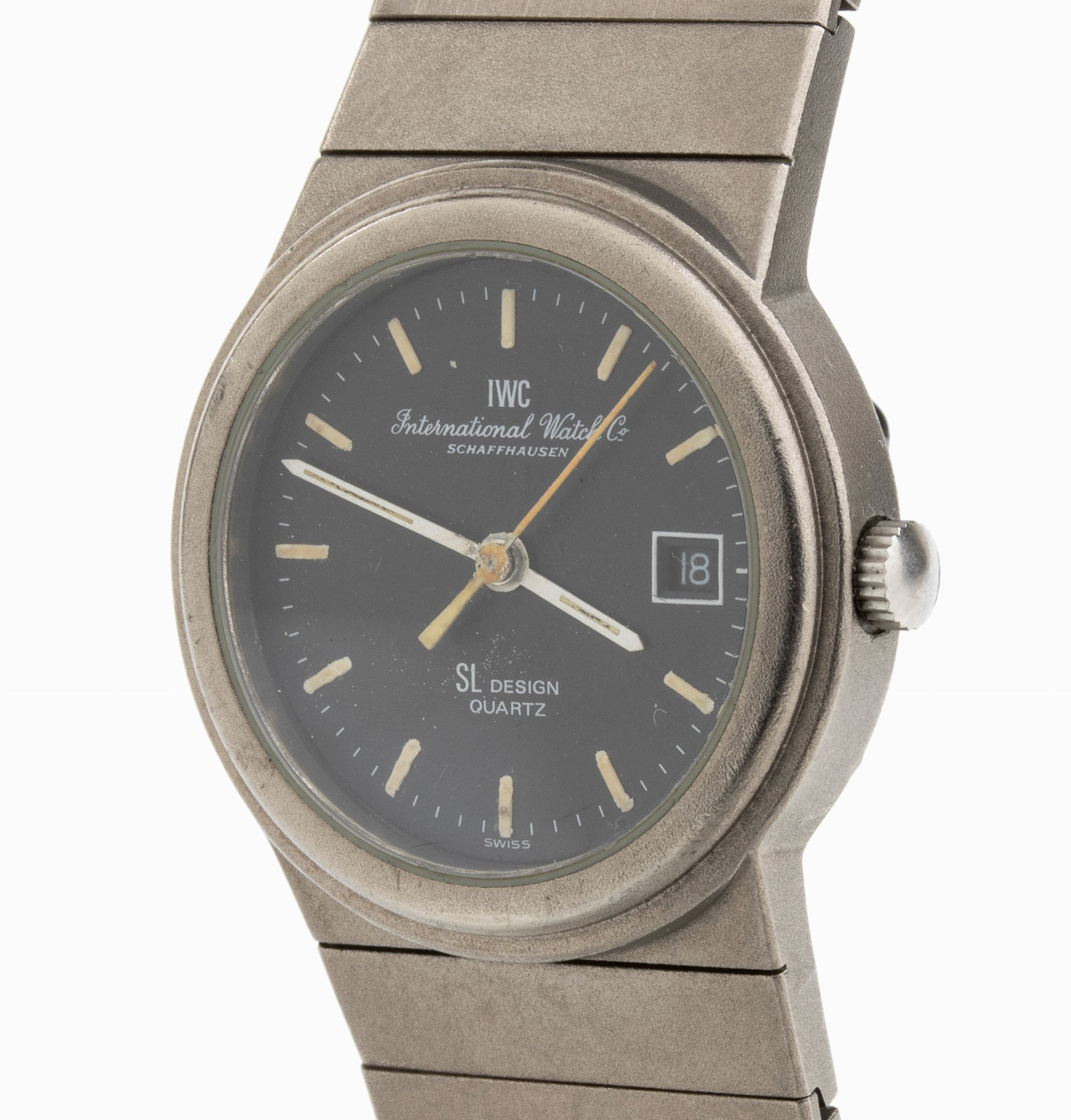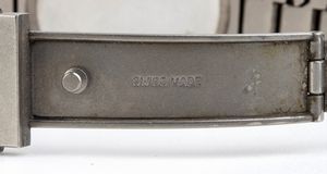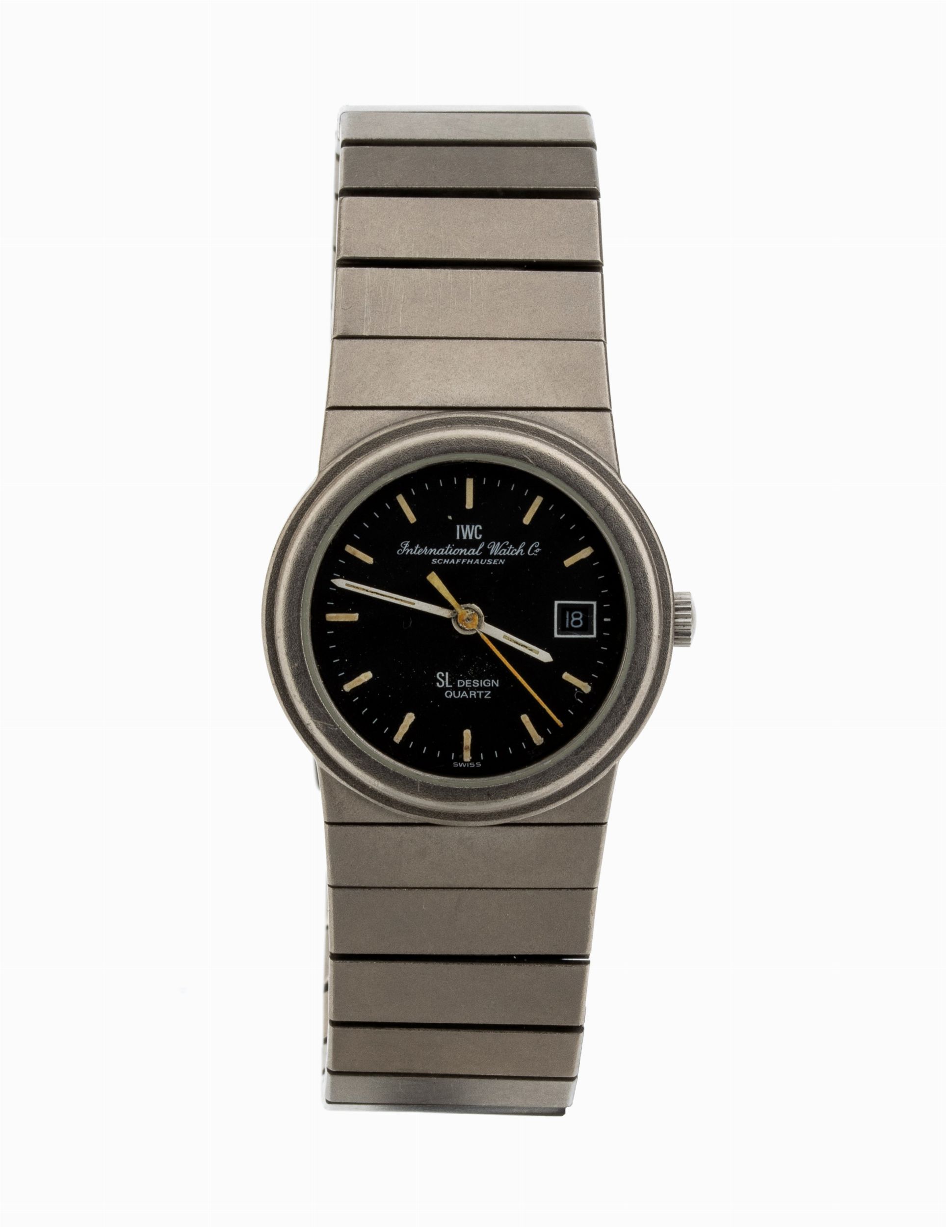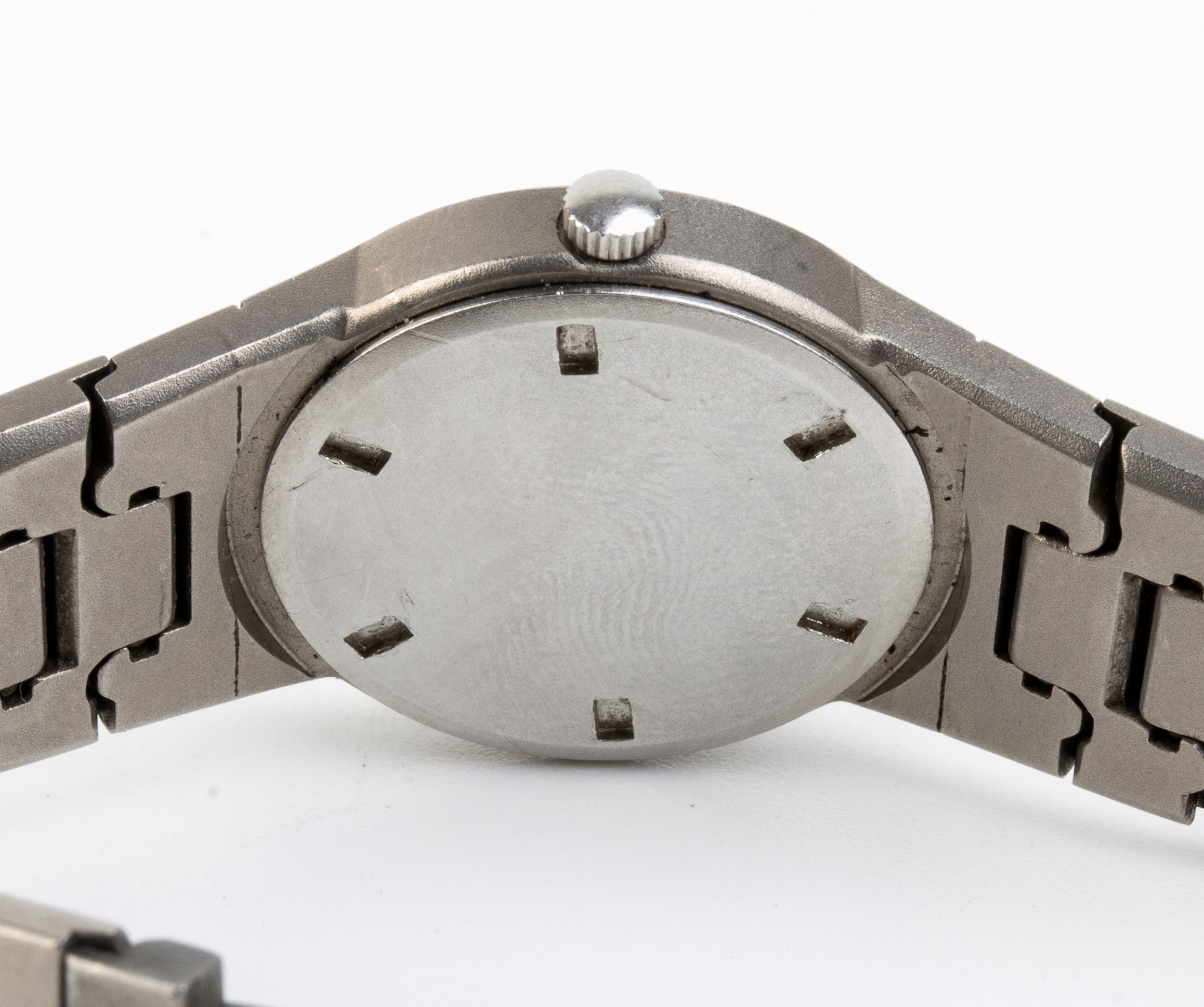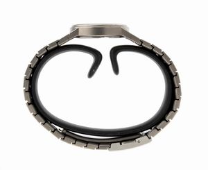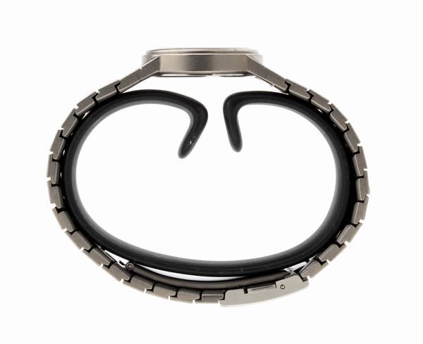 cassa e bracciale in titanio con quadrante nero, indici e sfera bianchi e lancetta dei secondi gialla. Movimento al quarzo.Diametro cassa 26 mm. Peso lordo 50 gr.Stato di conservazione: *** discreto, attualmente marciante, difetti.