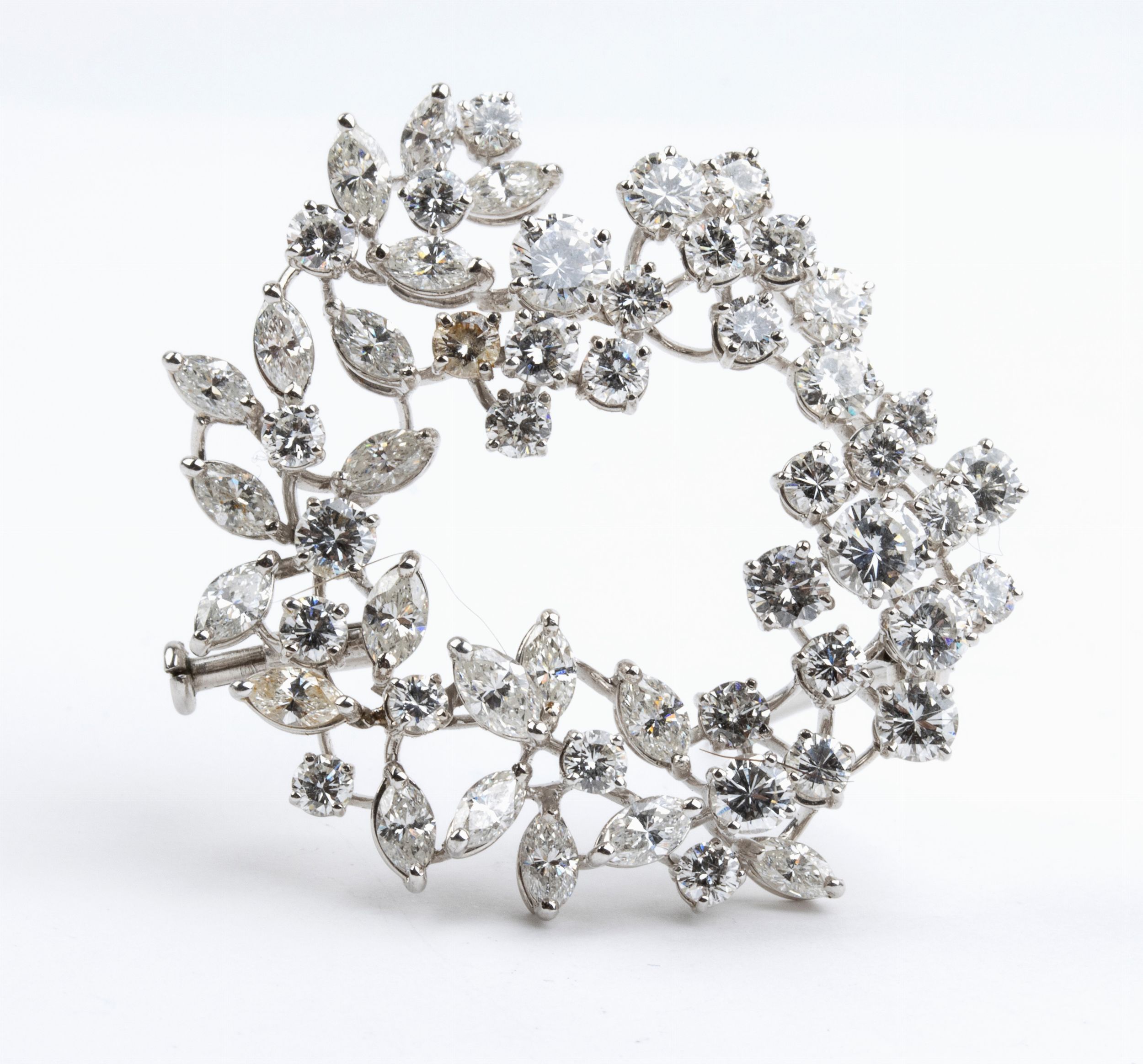 N. 36 diamanti di forma rotonda, taglio brillante, n. 20 diamanti di forma a navetta, taglio brillante modificato, totale circa 4.50 ct, colore F-G, VVS-SI.