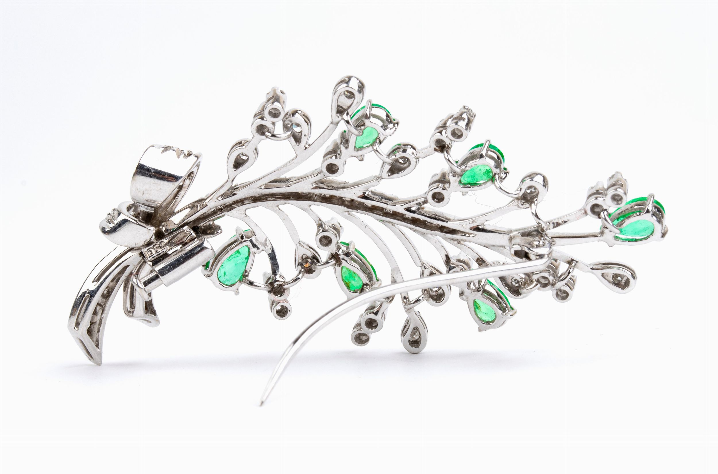 in oro bianco 18k, a motivi di ramo, con foglie e nastri impreziositi da smeraldi e diamanti.