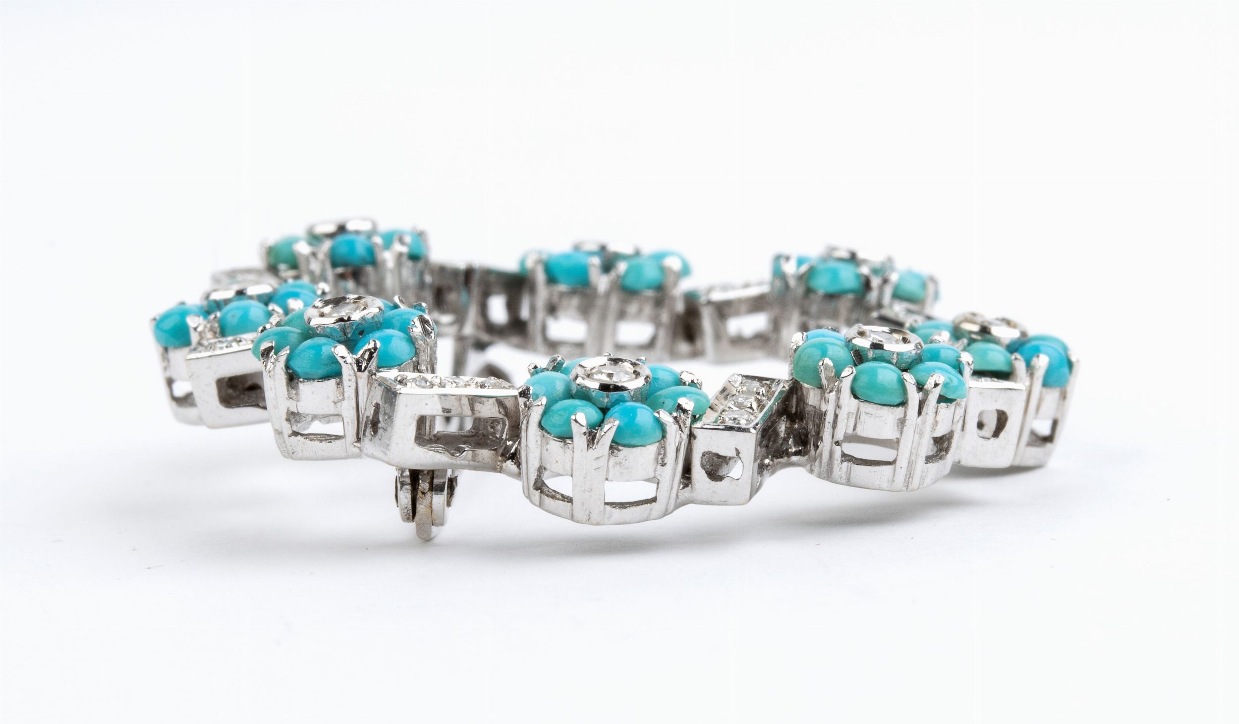 motivo a ghirlanda con piccoli fiori in turchese e diamanti. n. 32 diamanti di forma rotonda, taglio brillante e taglio huit-huit, circa 0.45 ct, G-H, VS.Dimensioni 3,5 x 3,5 cm. Peso 9,9 gr.Stato di conservazione: ***** eccellente.