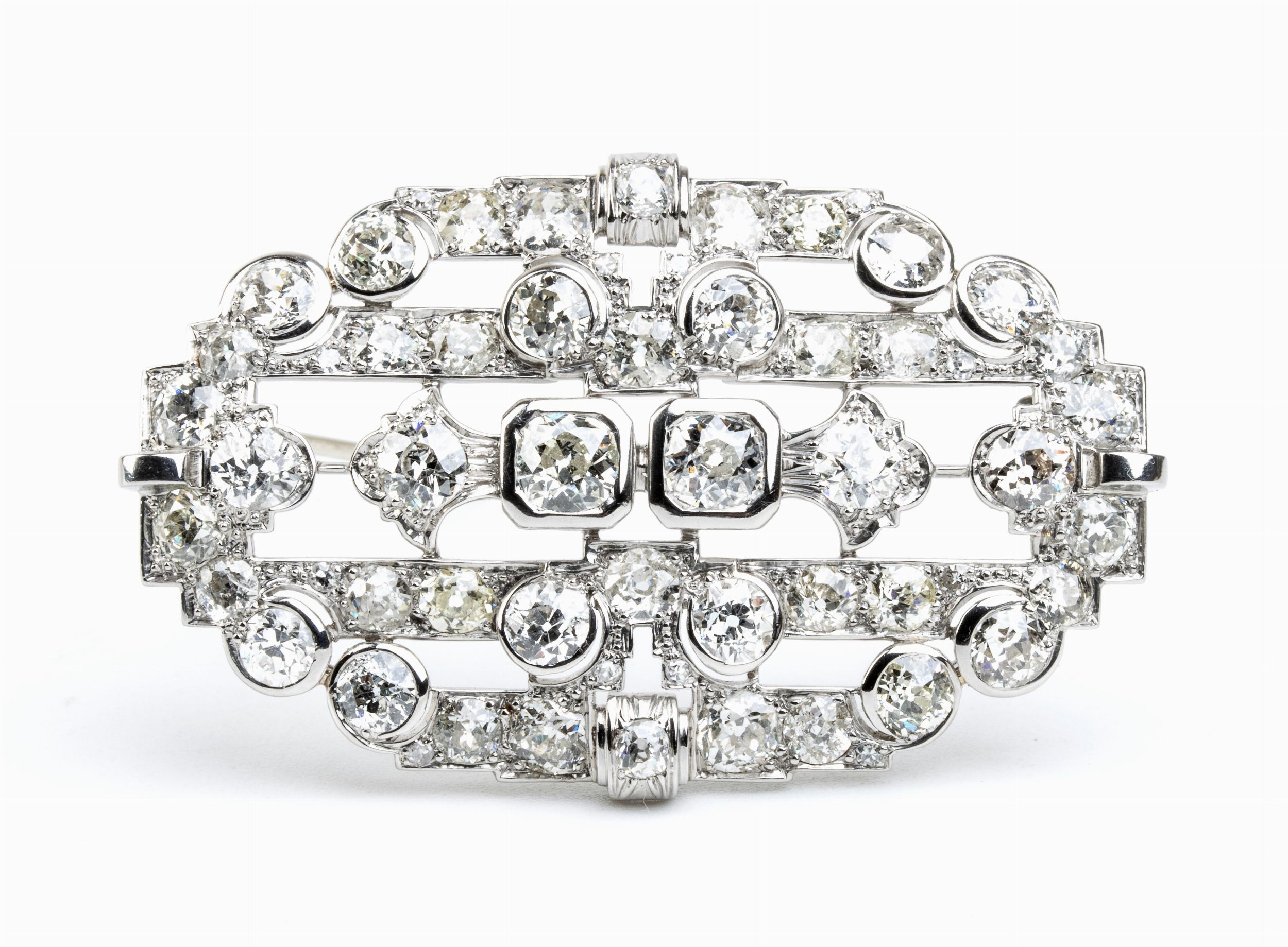 lastra traforata a forma di losanga con motivo geometrico in diamanti. N. 58 diamanti di forma rotonda ed irregolare, taglio vecchio Europeo, circa 16.50 ct.Dimensioni 5,5 x 3,4 cm. Peso 18,5 gr.Stato di conservazione: ***** eccellente.
