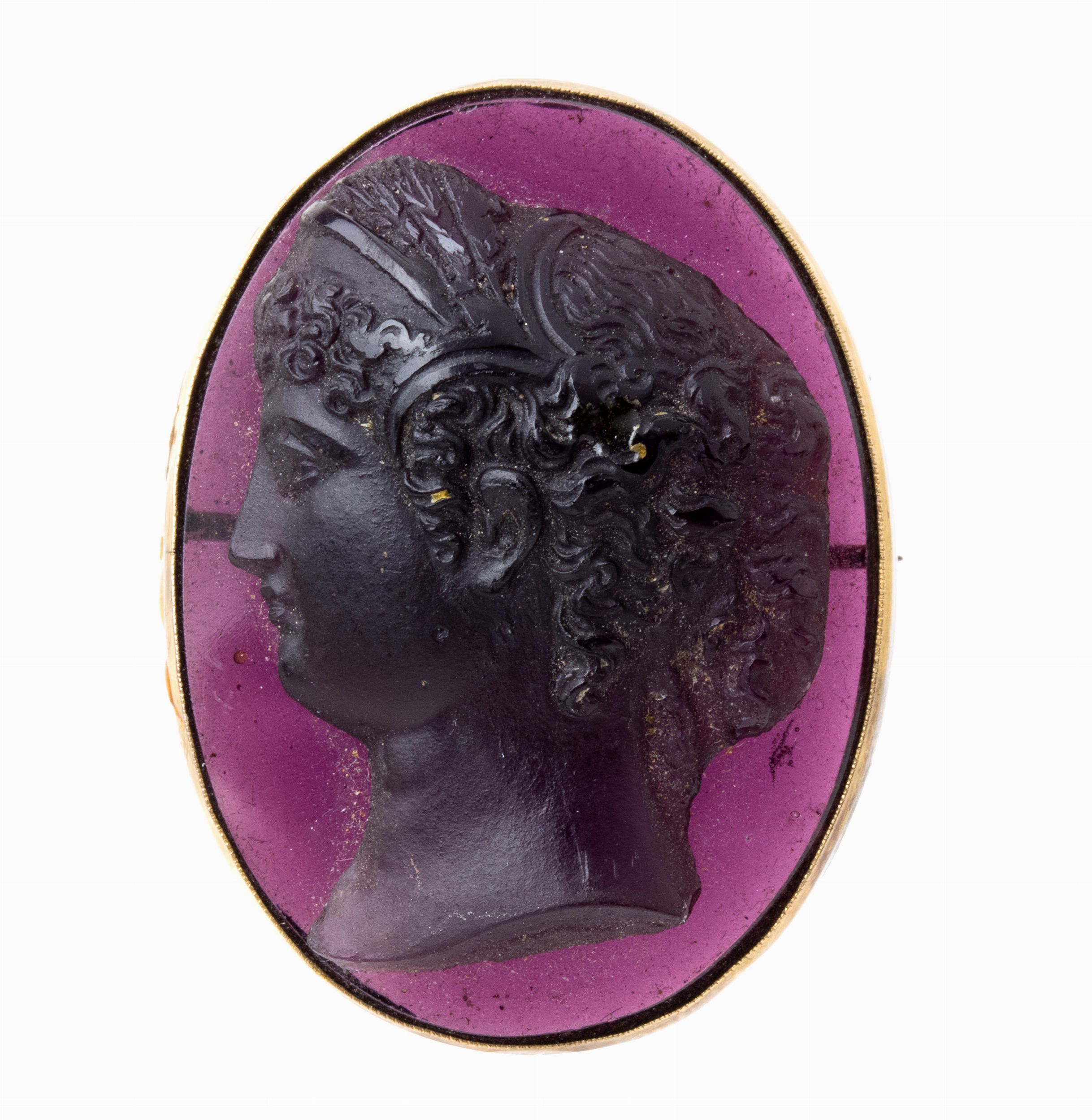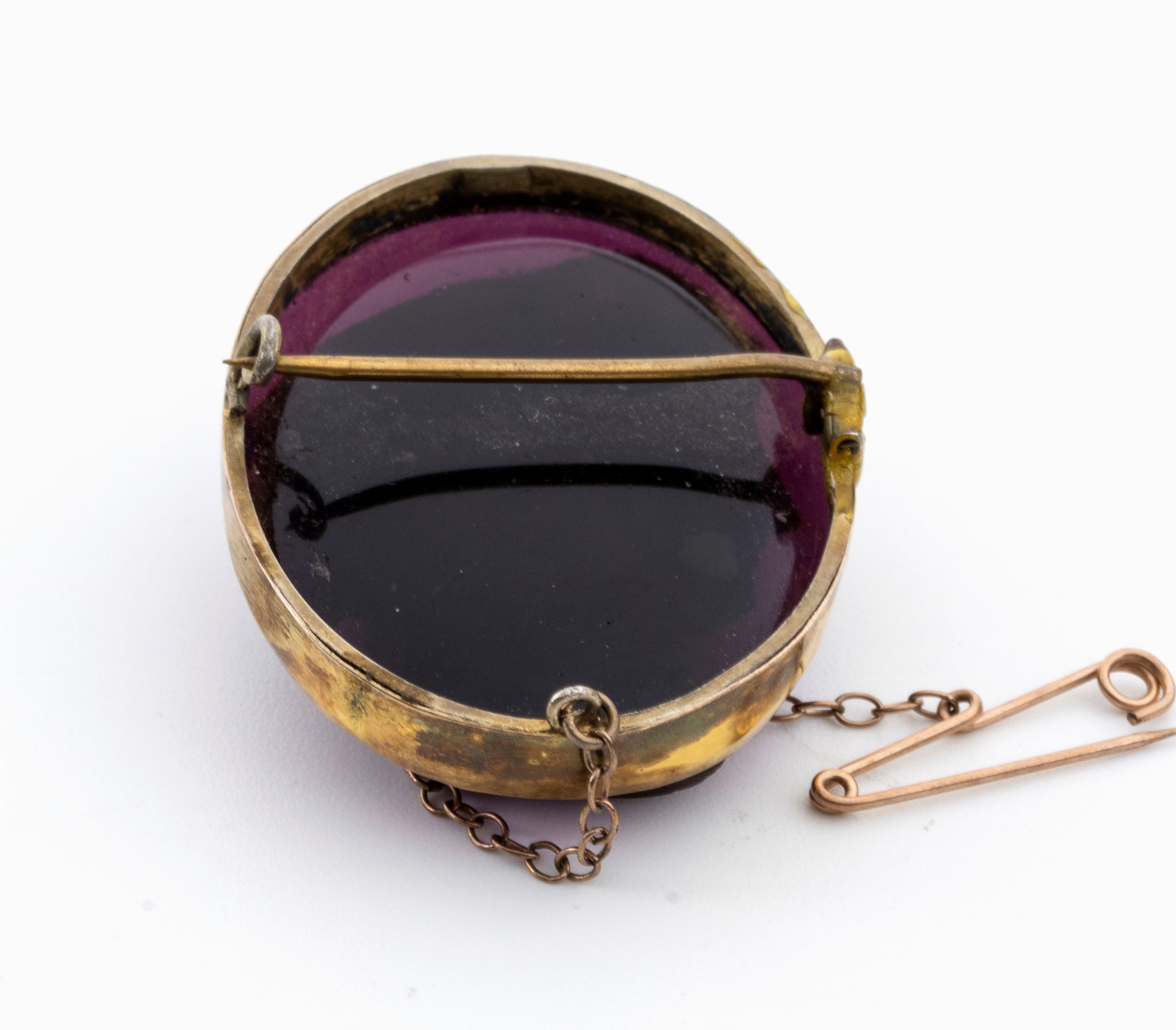 spilla ovale in oro incastonata con un cammeo in pasta vitrea viola, raffigurante il profilo del volto di una donna.Dimensioni 4,3 x 3,2 cm. Peso 22 gr.Stato di conservazione: **** buono.
