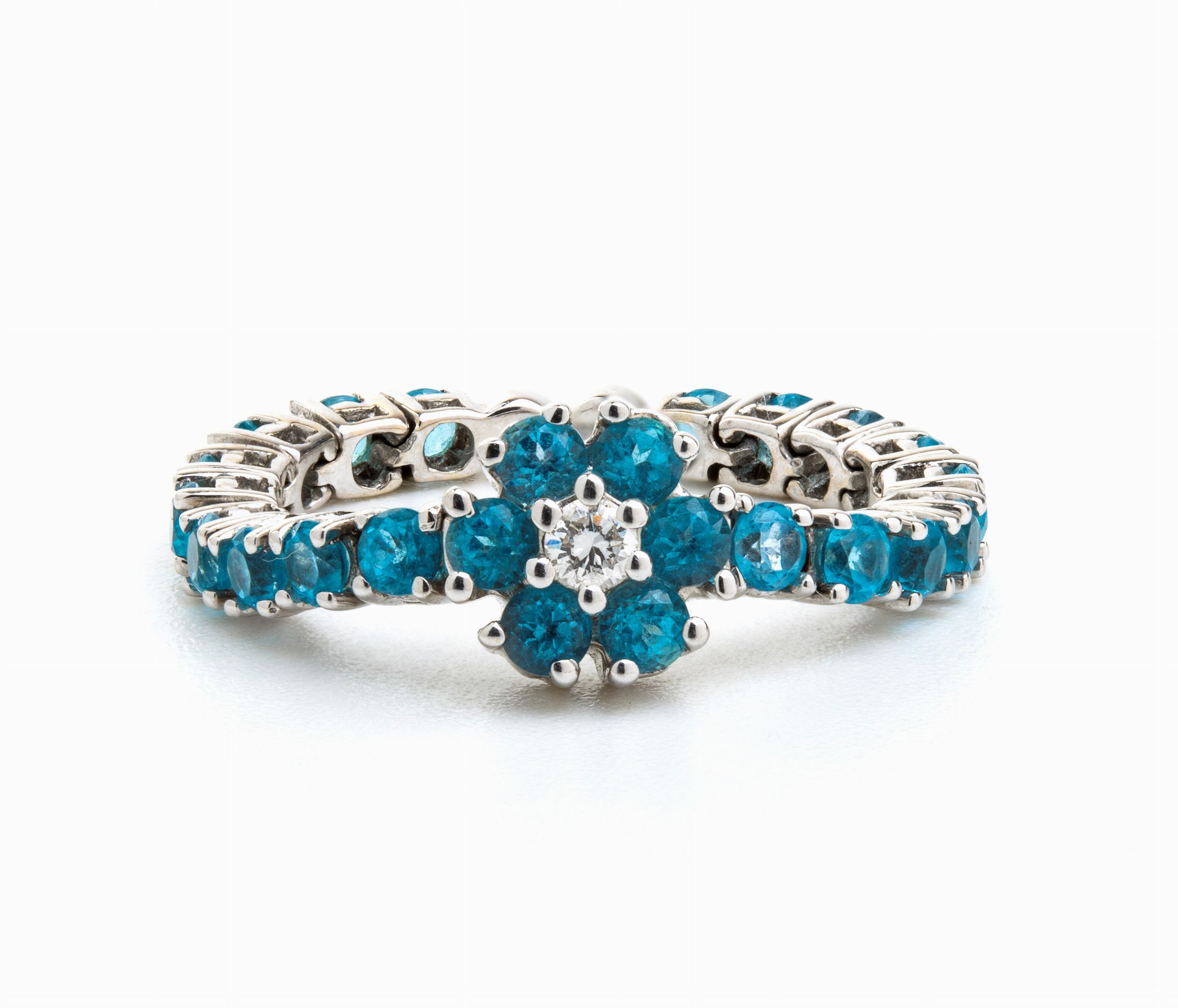 in oro bianco 18k, incastonata con linea di acquemarine, fiore centrale con diamante.