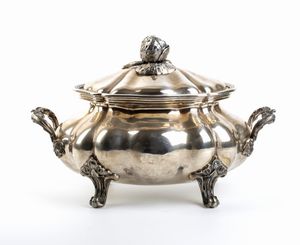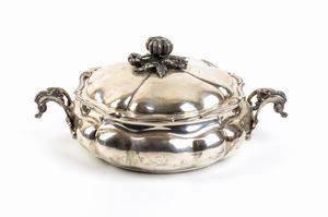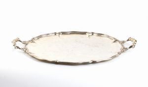 Dimensioni 65 x 40 cm. Peso 2215 gr. Inizio XX secolo di forma ovale, con manici laterali. Argento 800/1000, [..]