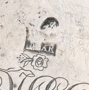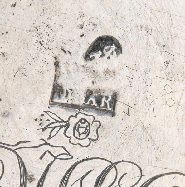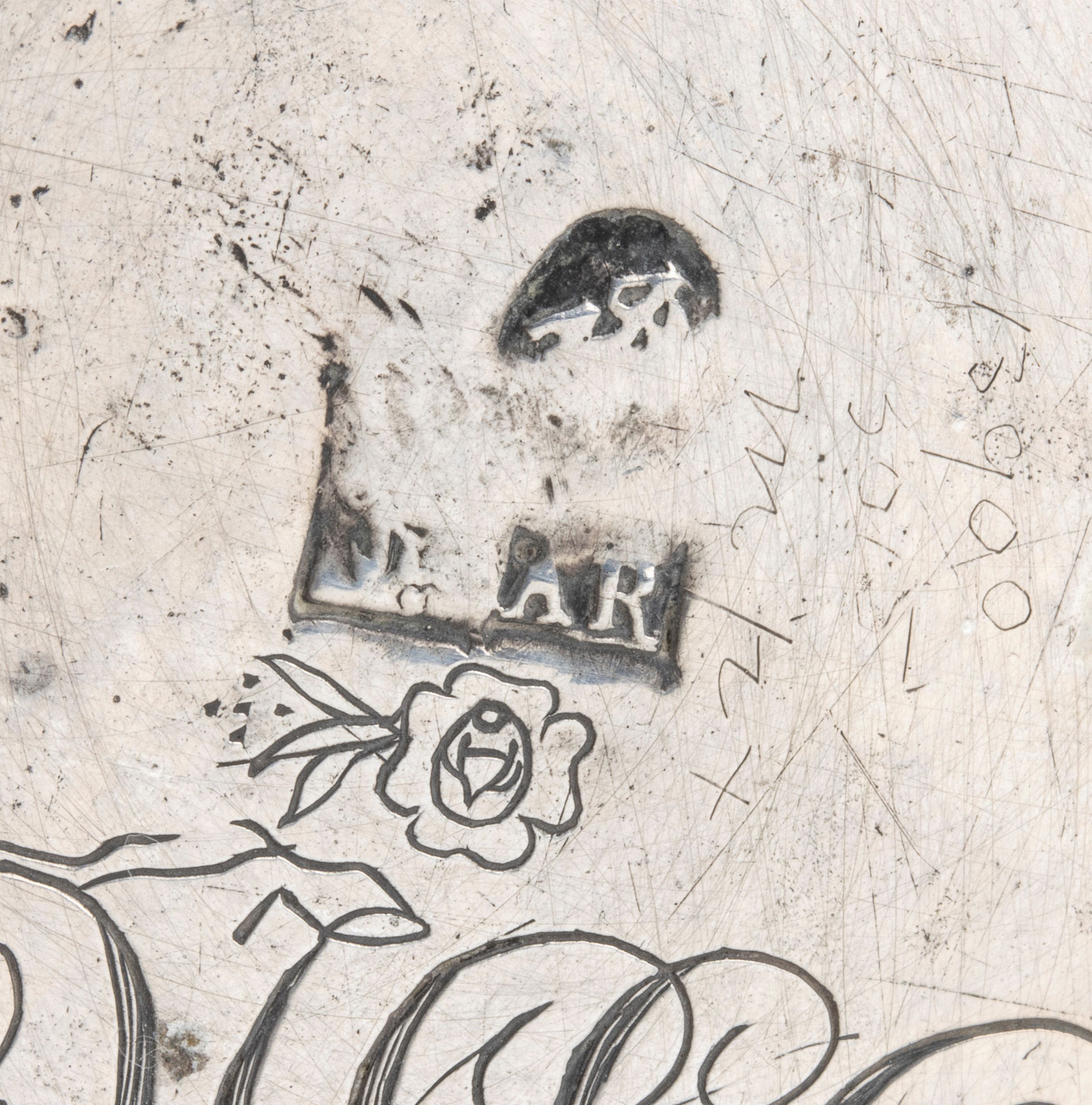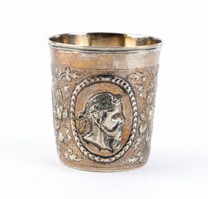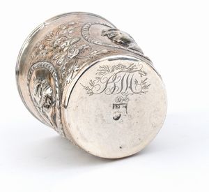 di forma colindrica sbalzato e cesellato con profili all'antica. Punzonato con marchi non identificati.Stato di conservazione: **** buono, minori segni d'uso commensurati all'uso nel tempo.