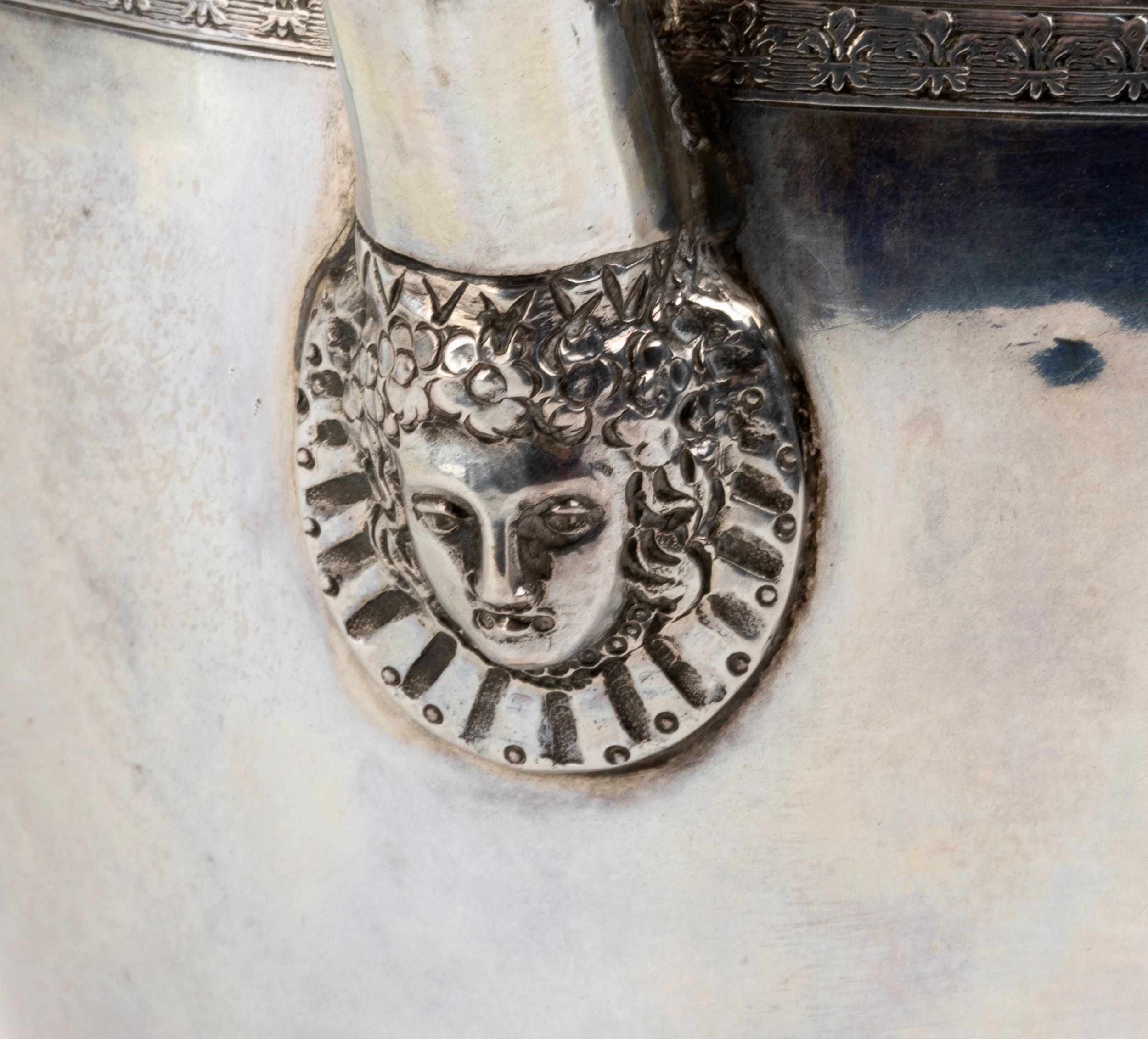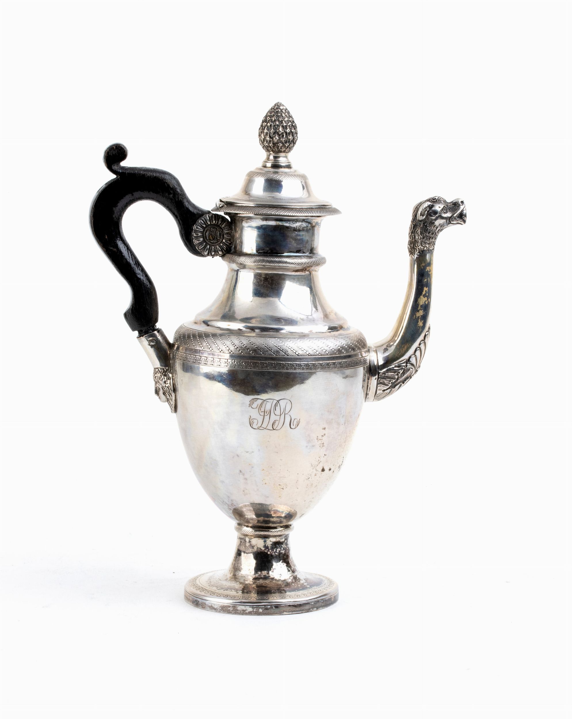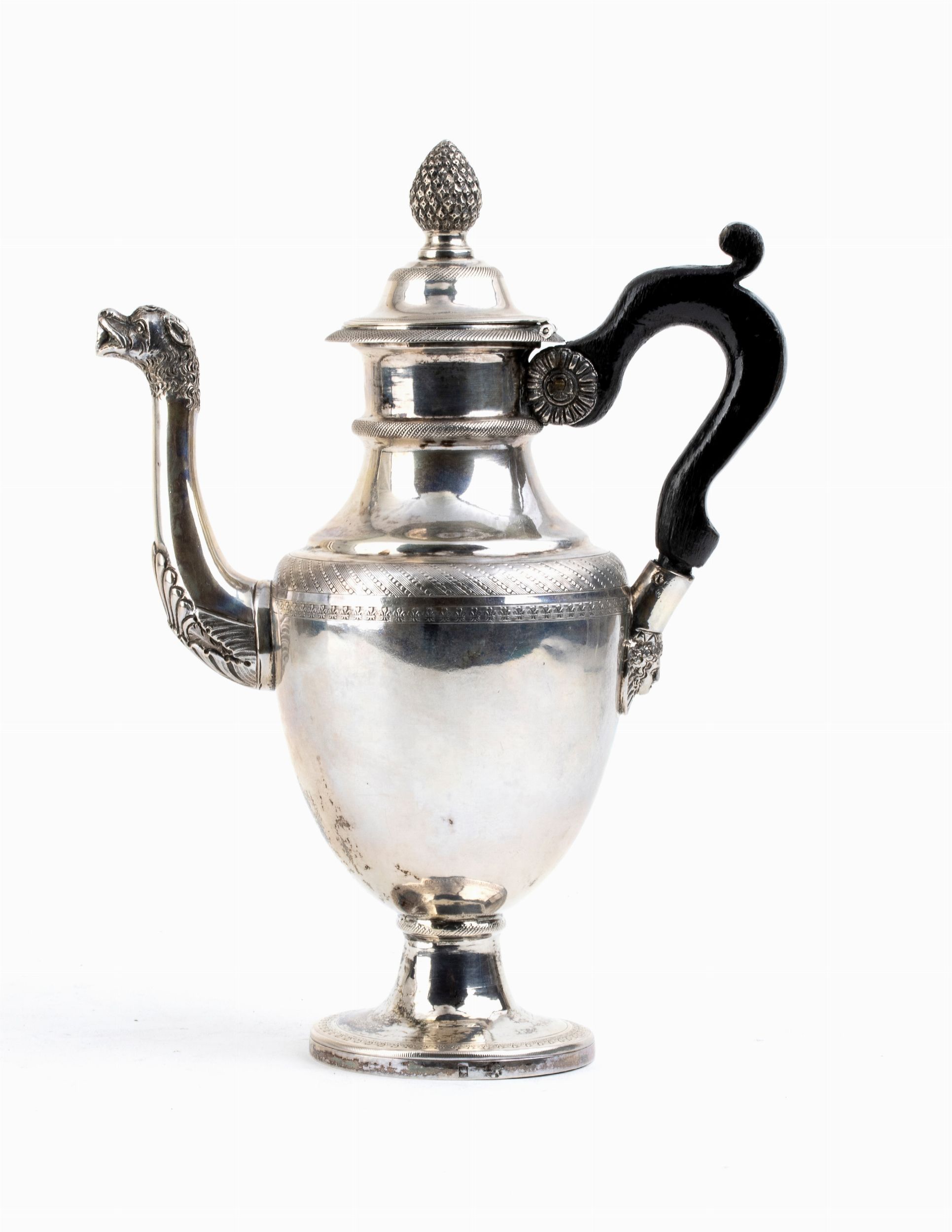 corpo ovoidale liscio con monogramma poggiante su piede circolare, collo rastremato con versatoio sagomato e beccuccio zoomorfo. Coperchio incernierato con presa a pigna, manico in legno ebanizzato. Punzonata con il marchio in uso alla corporazione degli orefici di Napoli per l'argento al titolo di 833/1000, 1832-1872, e con le iniziali R.P. dell'argentiere Raffaele Parascandolo.