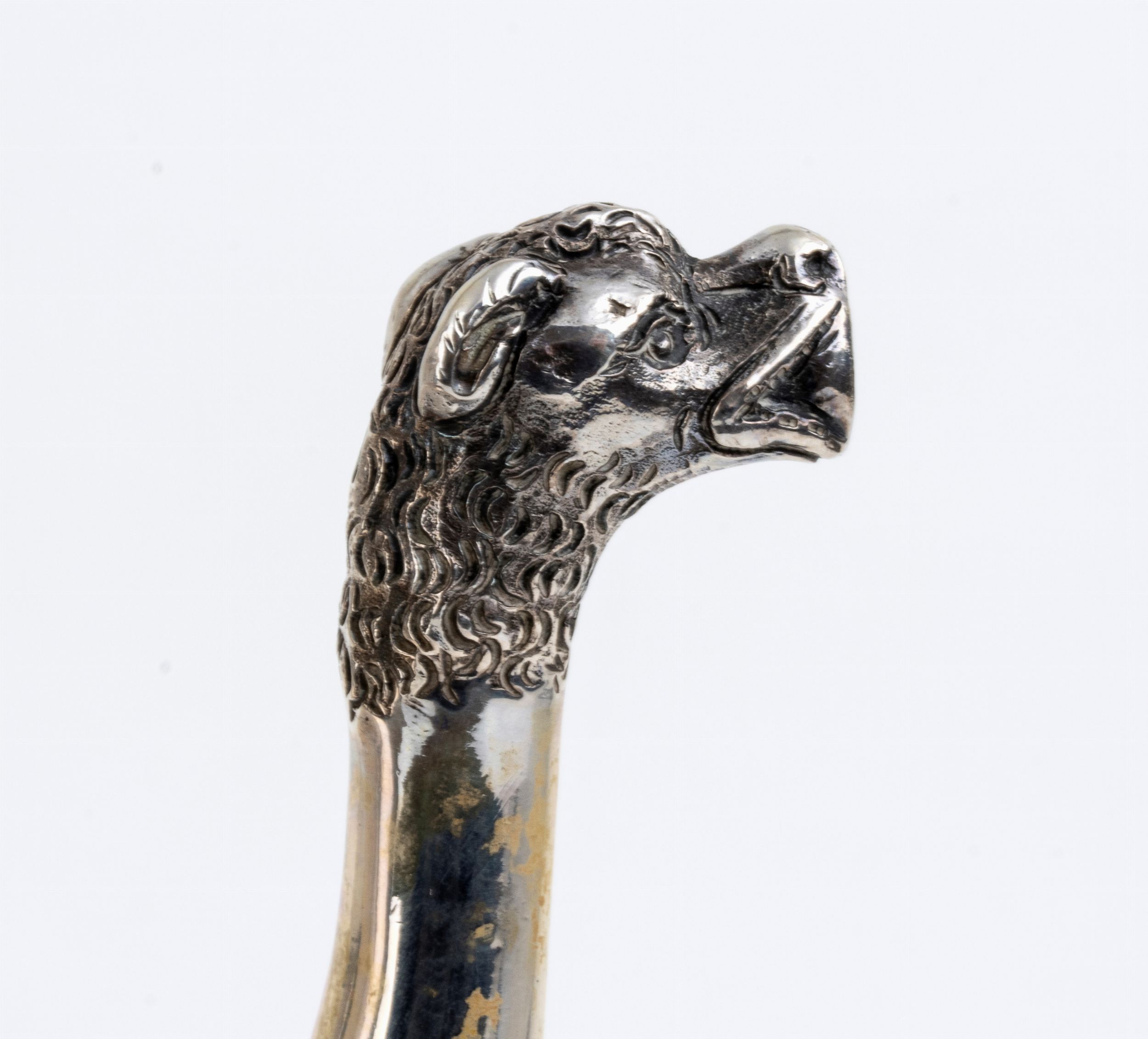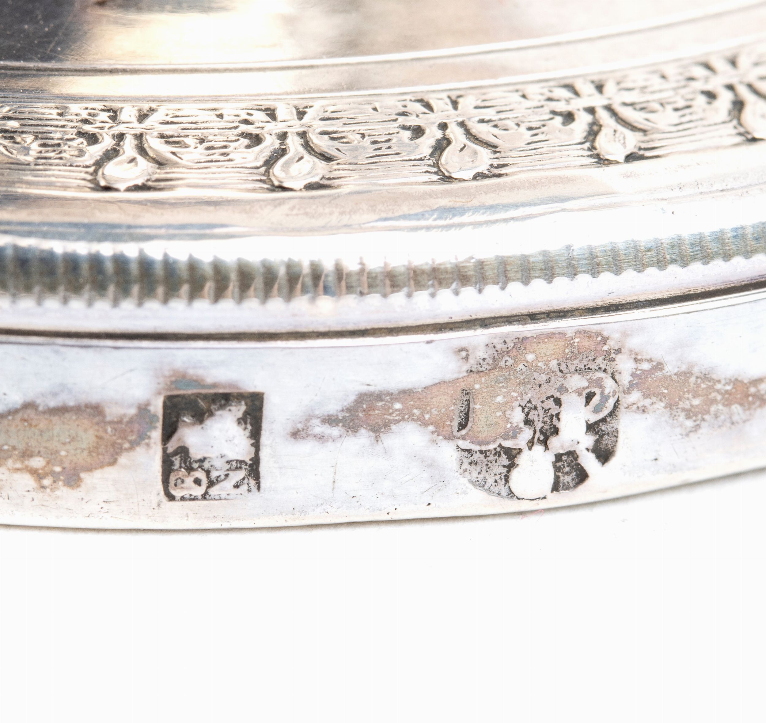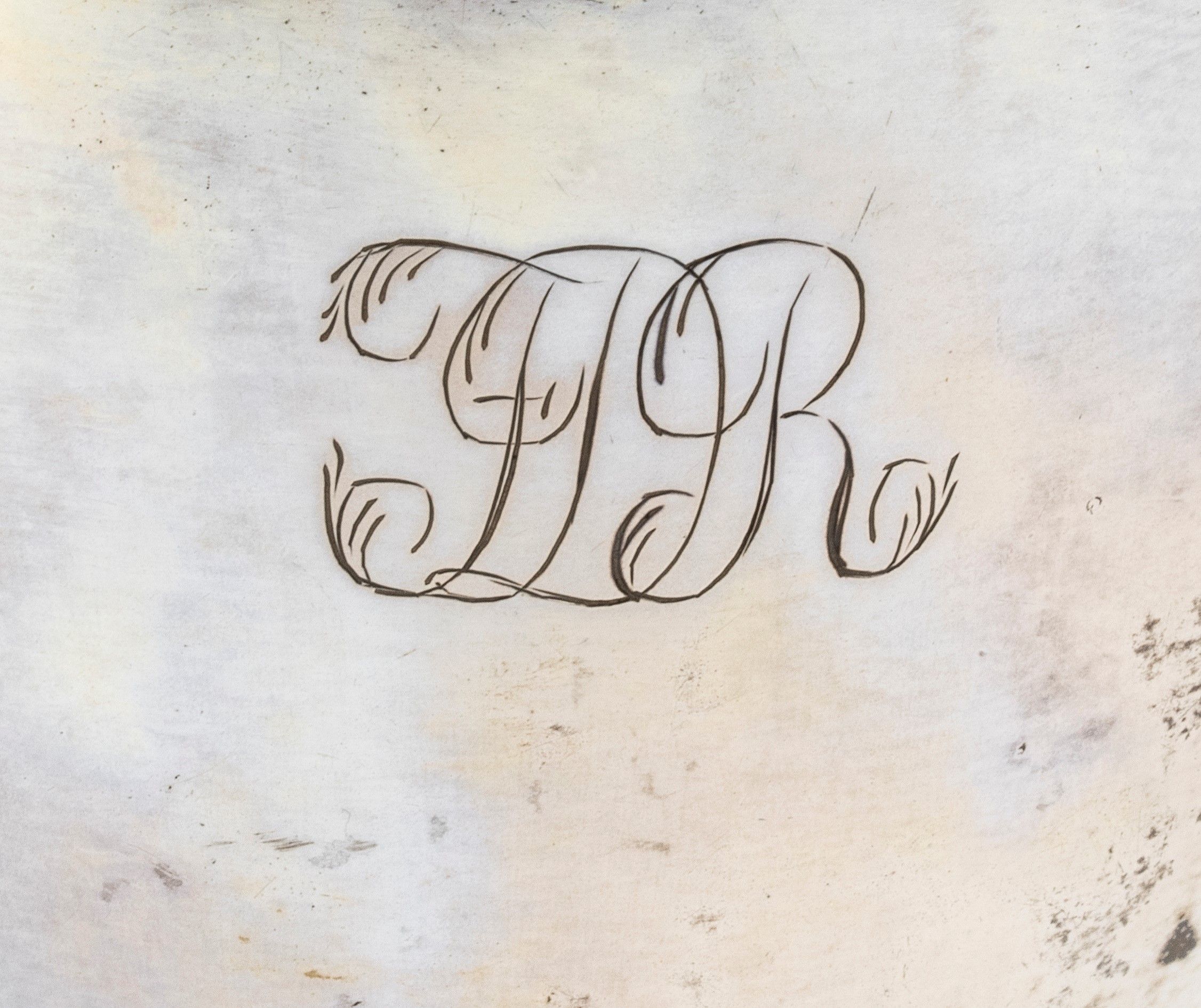 corpo ovoidale liscio con monogramma poggiante su piede circolare, collo rastremato con versatoio sagomato e beccuccio zoomorfo. Coperchio incernierato con presa a pigna, manico in legno ebanizzato. Punzonata con il marchio in uso alla corporazione degli orefici di Napoli per l'argento al titolo di 833/1000, 1832-1872, e con le iniziali R.P. dell'argentiere Raffaele Parascandolo.