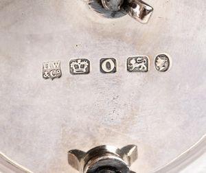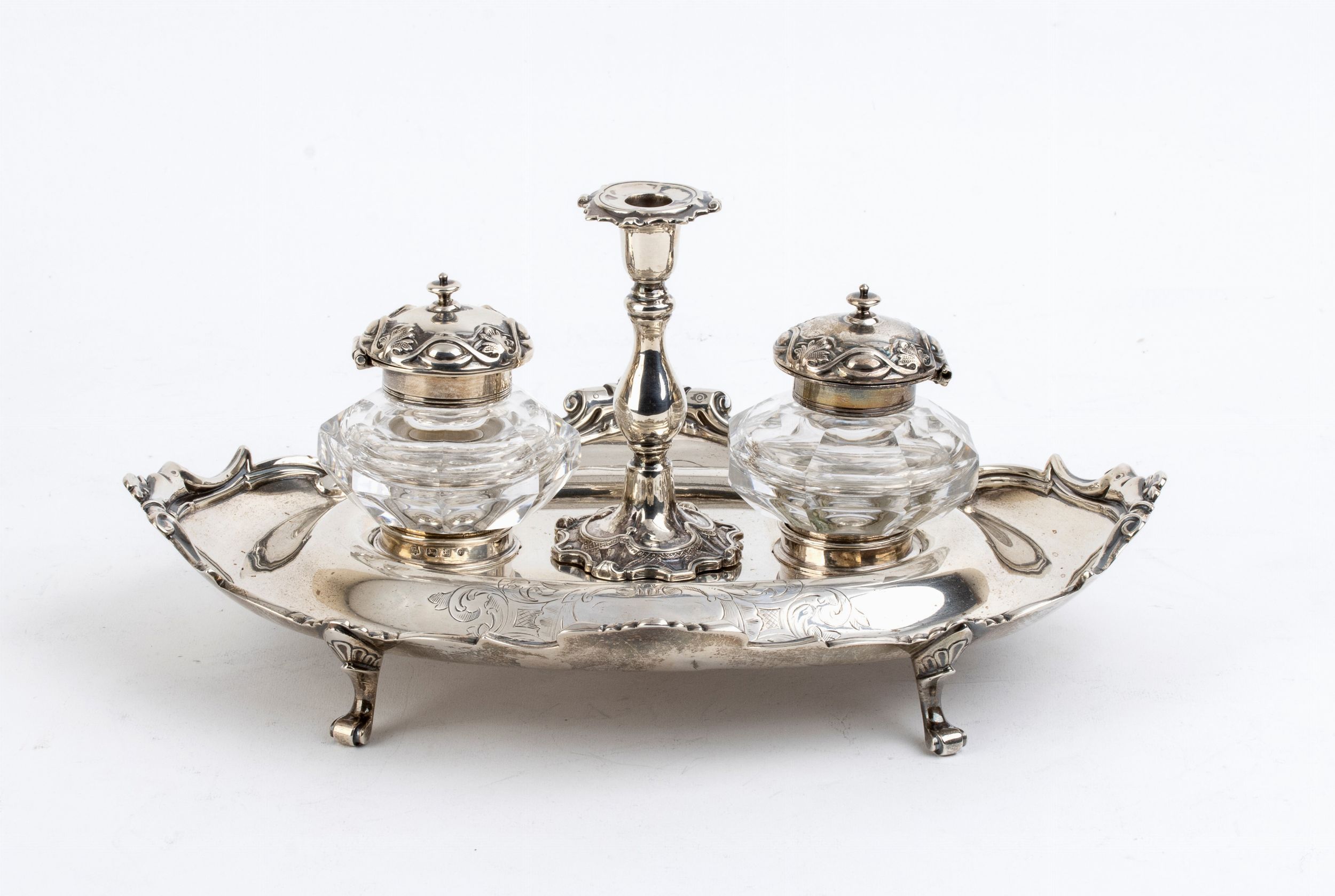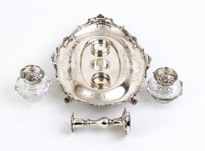 vassoio ovale con bordo perimetrale sagomato poggiante su quattro piedi a riccio; nella parte superiore un portacandela removibile al centro affiancato da una coppia di contenitori in vetro molato per l'inchiostro e la sabbia, ciascuno con coperchio in argento. Argento dorato 925/1000, serie completa di marchi città di Sheffield 1881-1882, argentieri Henry Wilkinson & Co.