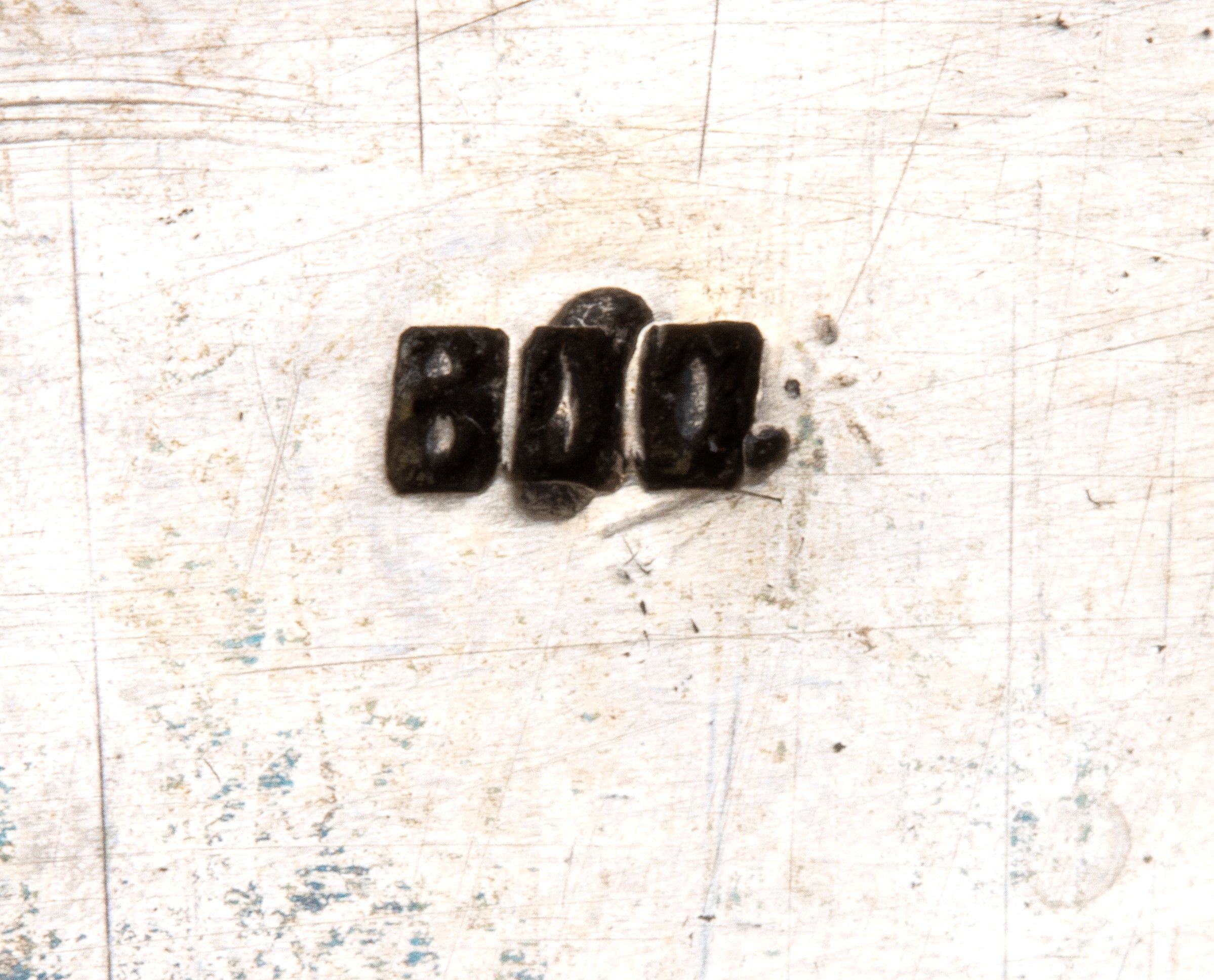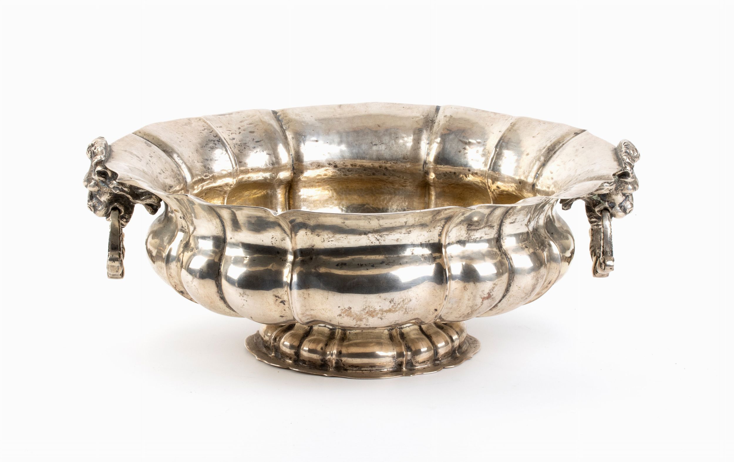 di forma ovale con manici a teste leonine. Argento 800/1000, punzonato 800. Stato di conservazione: **** buono, minori segni d'uso commensurati all'uso nel tempo.