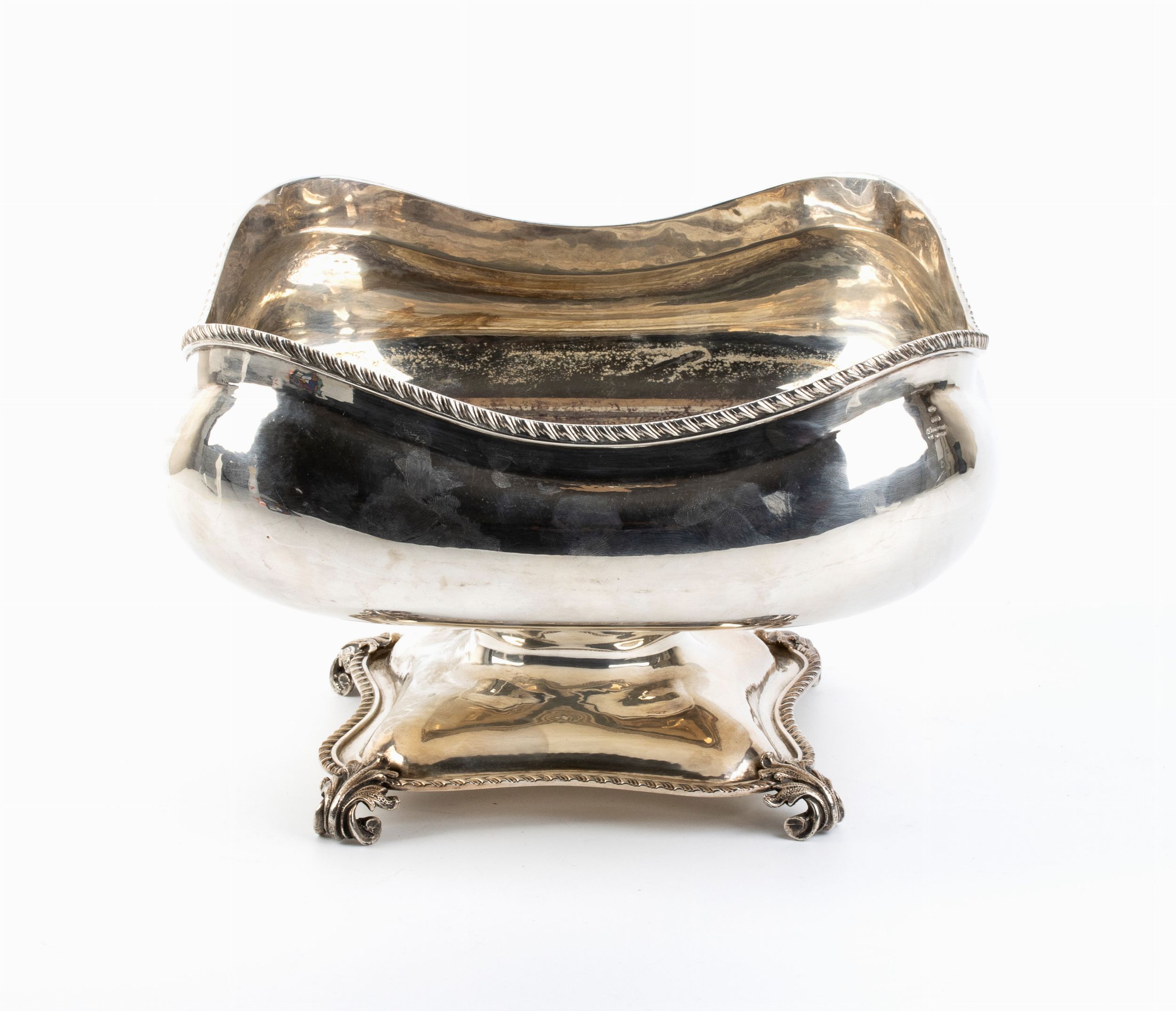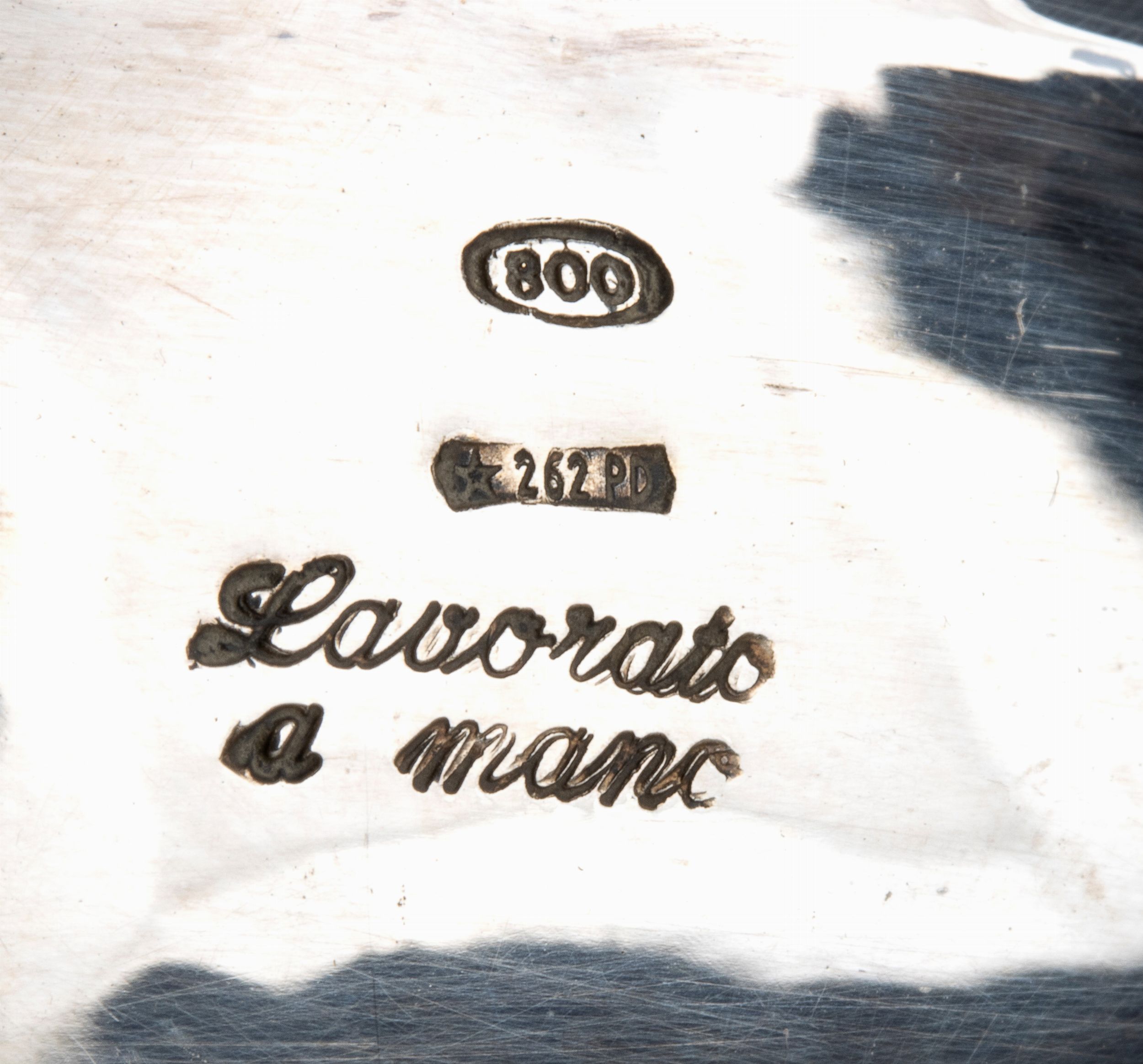 di forma quadrata poggiante su quattro piedini fogliati. Argento 800/1000, punzonato 800 - * 262 PD.Stato di conservazione: **** buono, minori segni d'uso commensurati all'uso nel tempo.