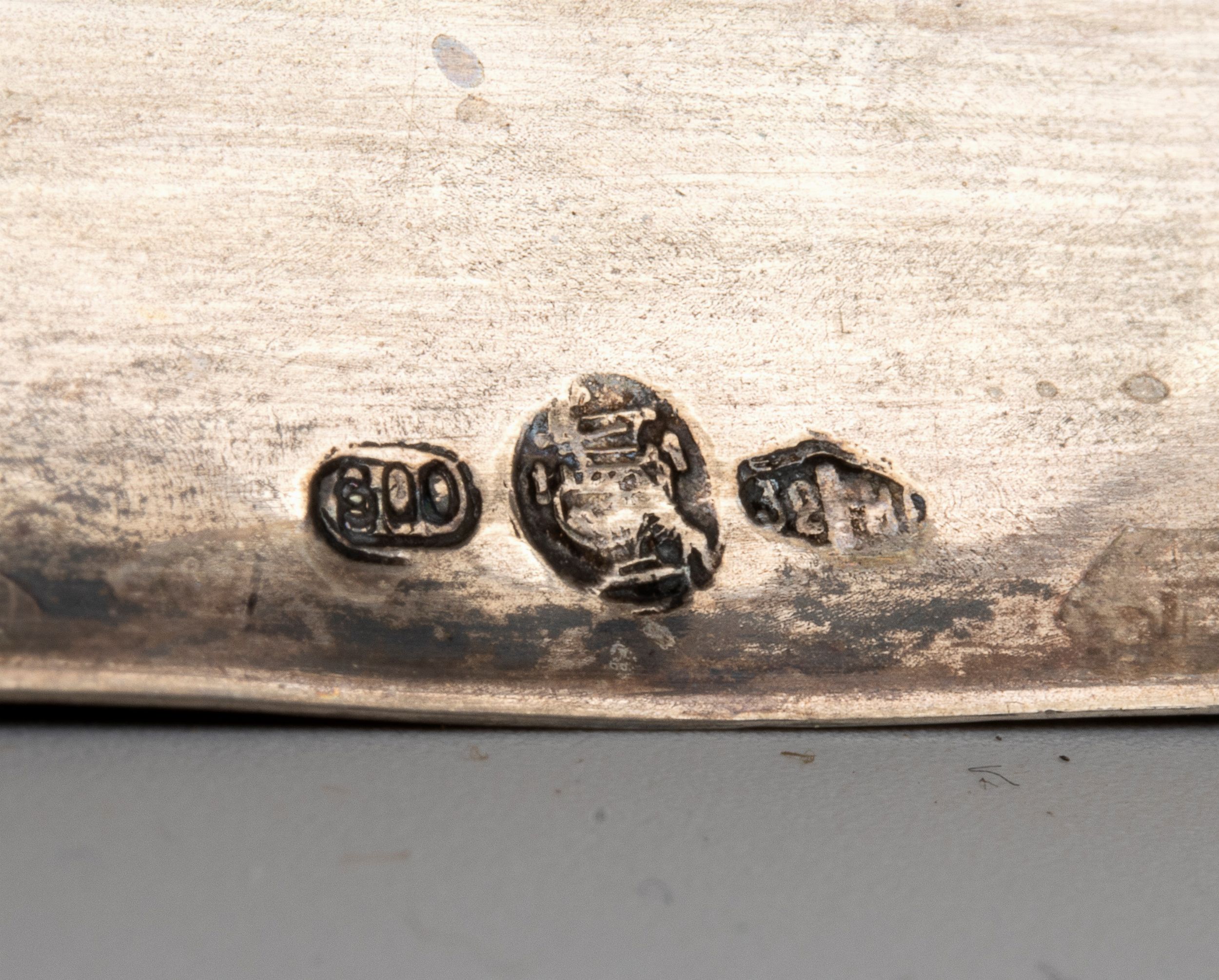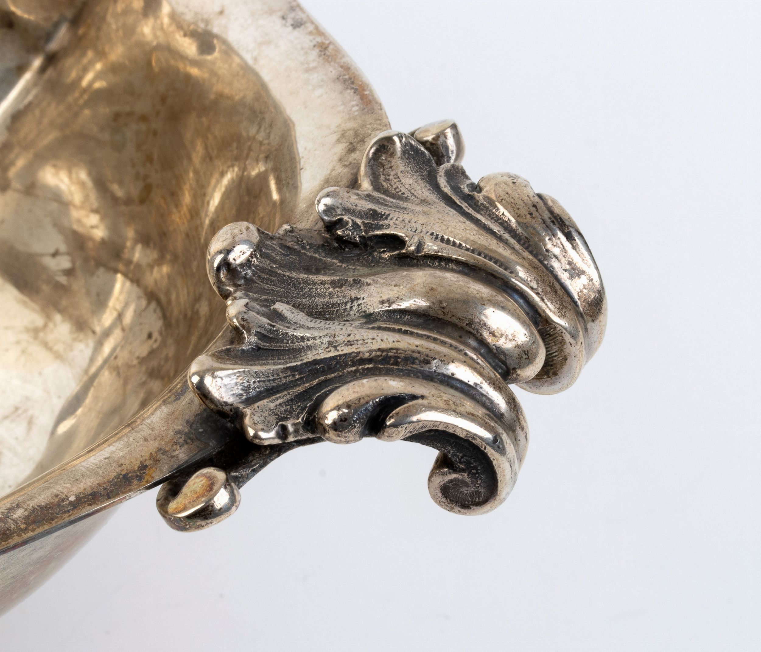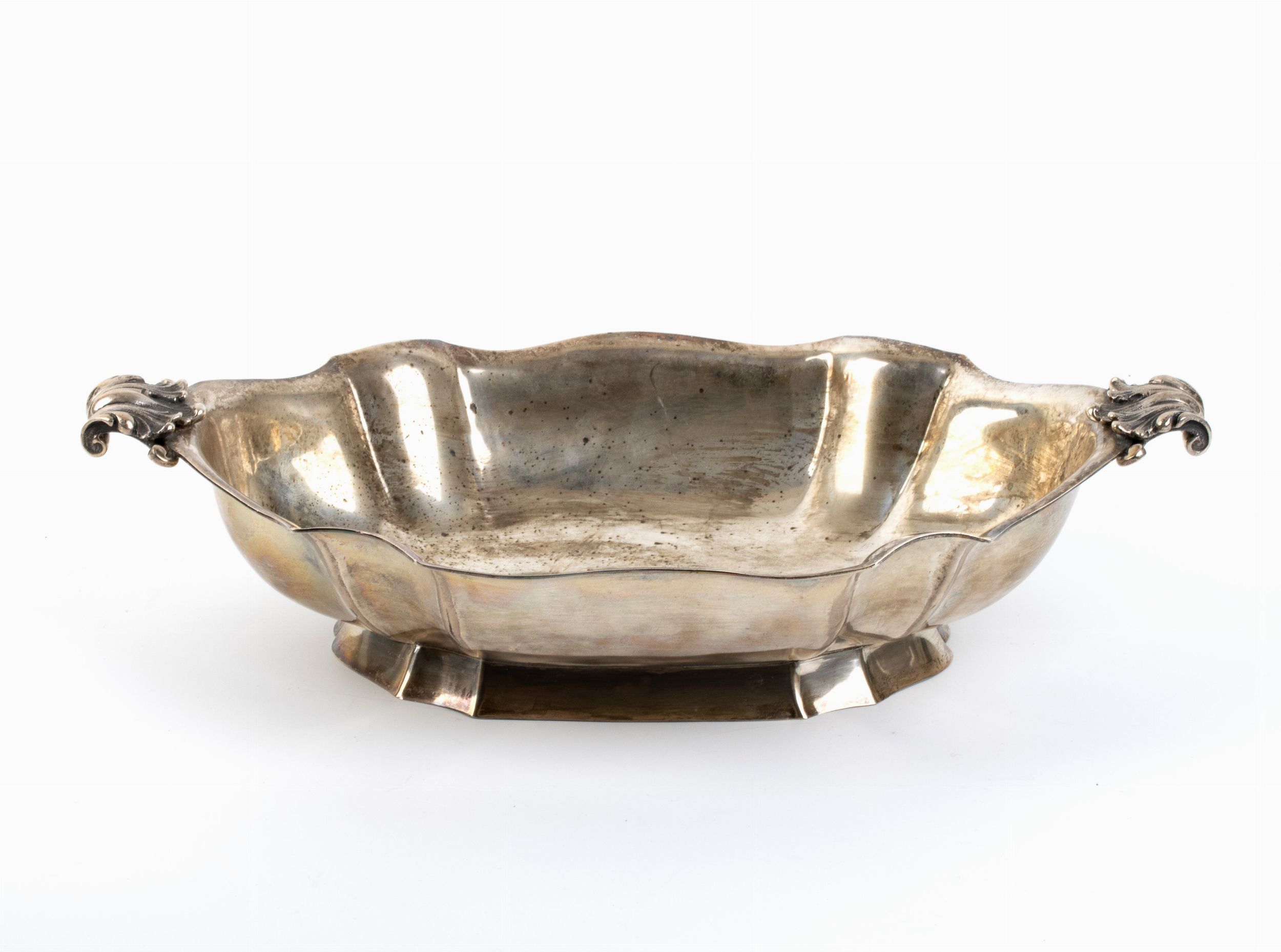 di forma ovale sagomata con prese vegetali laterali. Argento 800/1000, punzonato 800 - 32 marchio del fascio MI, argentiere DITTA MESSULAM ENRICO di Alberto.