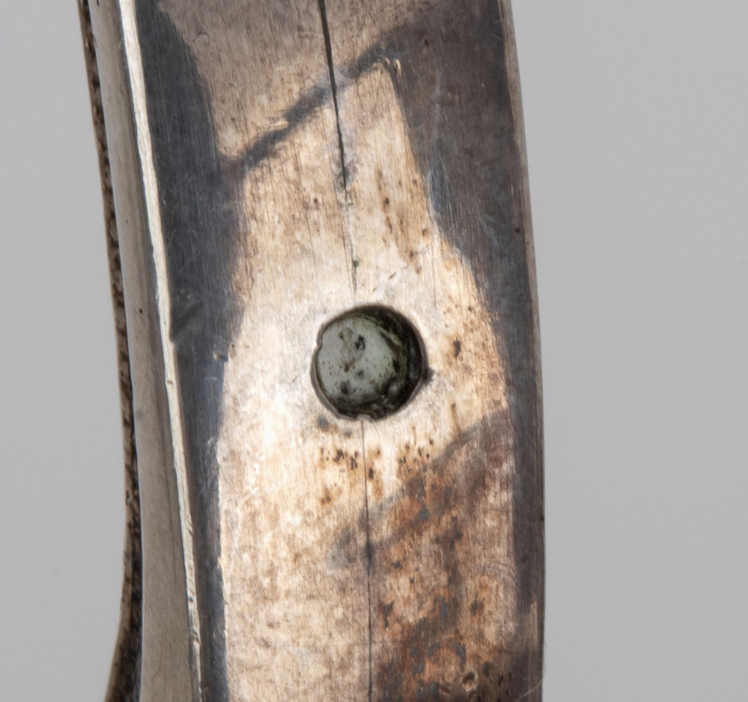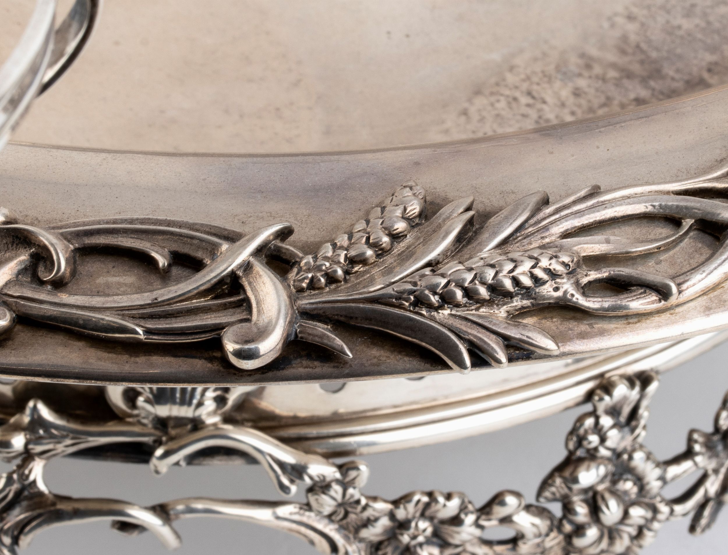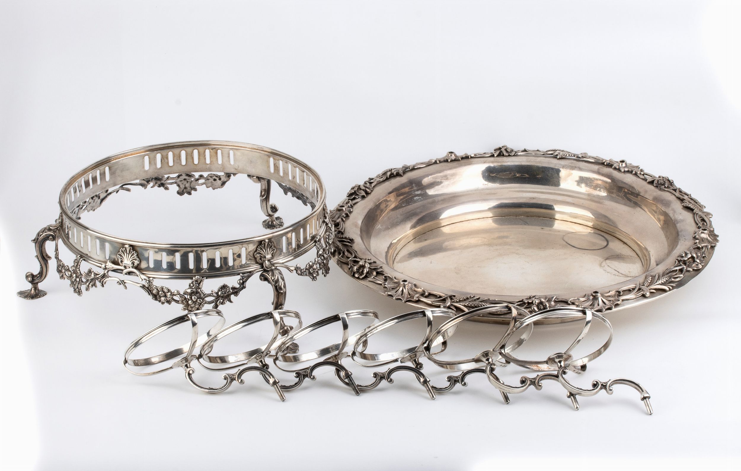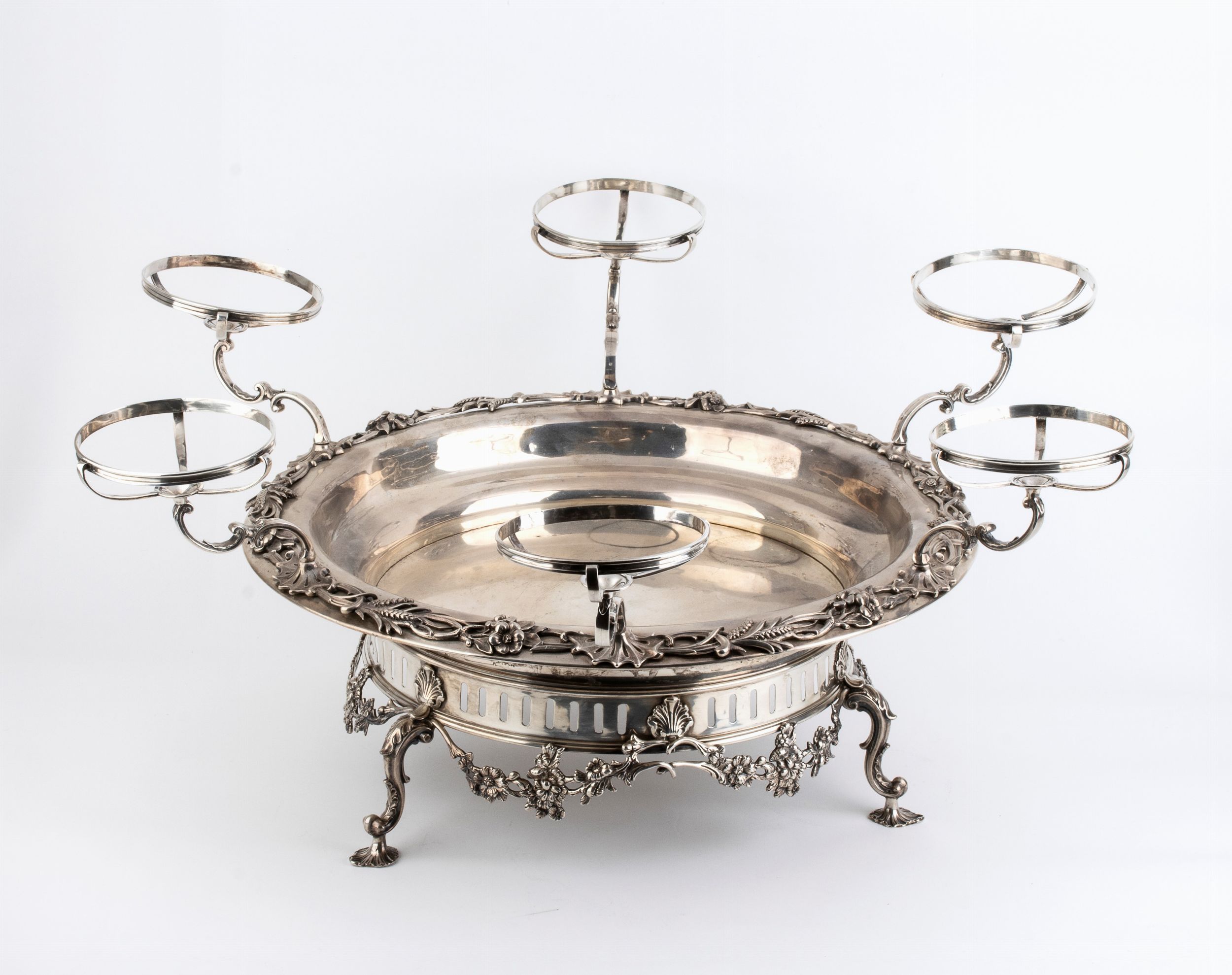di forma circolare, poggiante su tre piedi fogliati, decorato perimetralmente a ghirlande fiorate. Vassoio superiore con decorazioni applicate a motivi di spighe di grano e fiori, con sei bracci porta vaschette perimetrali. Argento 925/1000, serie completa di marchi Londra 1898-1899, argentieri Edward Barnard & Sons Ltd.