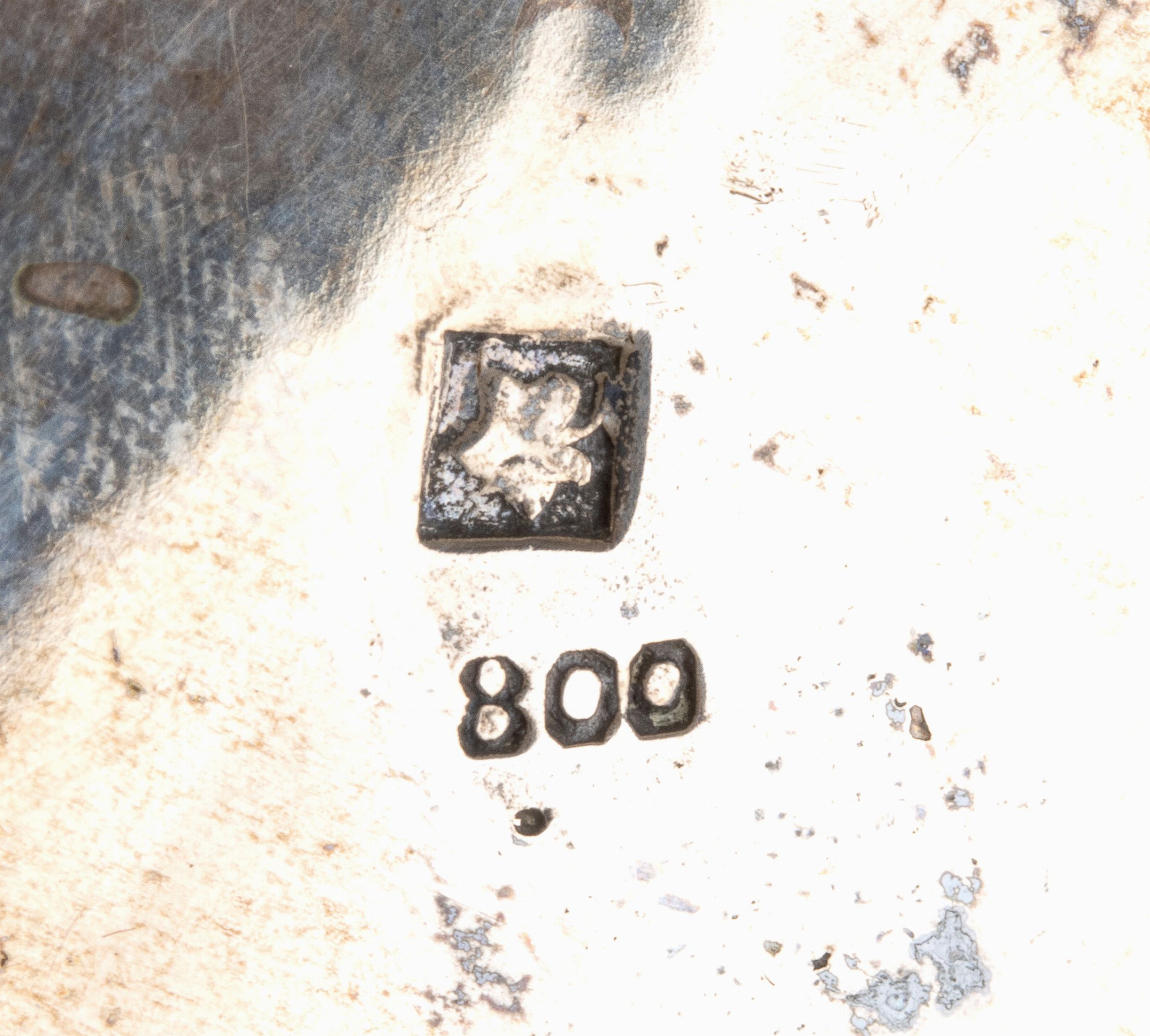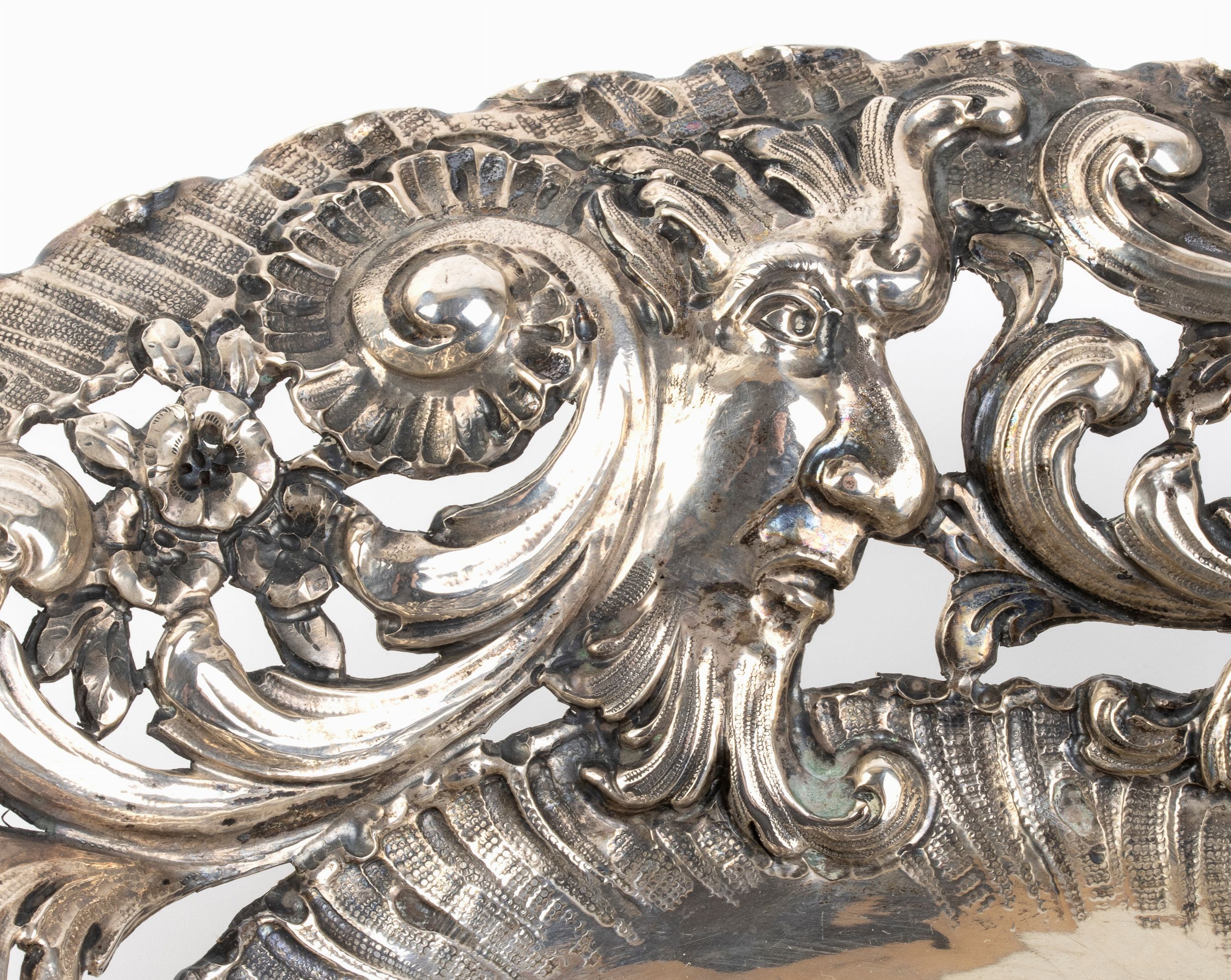 di forma rotonda poggiante su tre piedini a riccio, traforato con volute fogliate e mascheroni. Argento 800/1000, punzonato 800.Stato di conservazione: **** buono, segni dovuti al tempo.