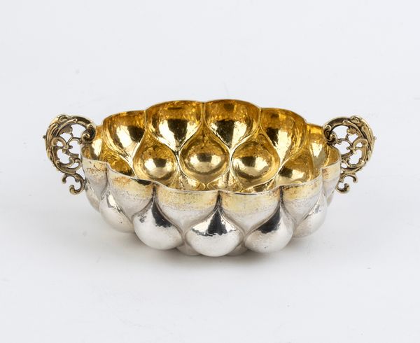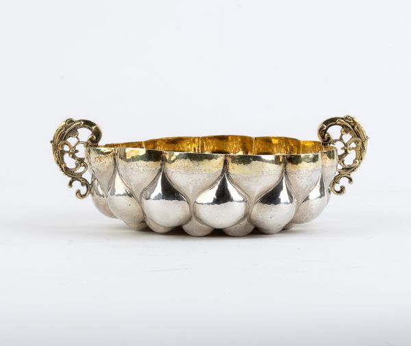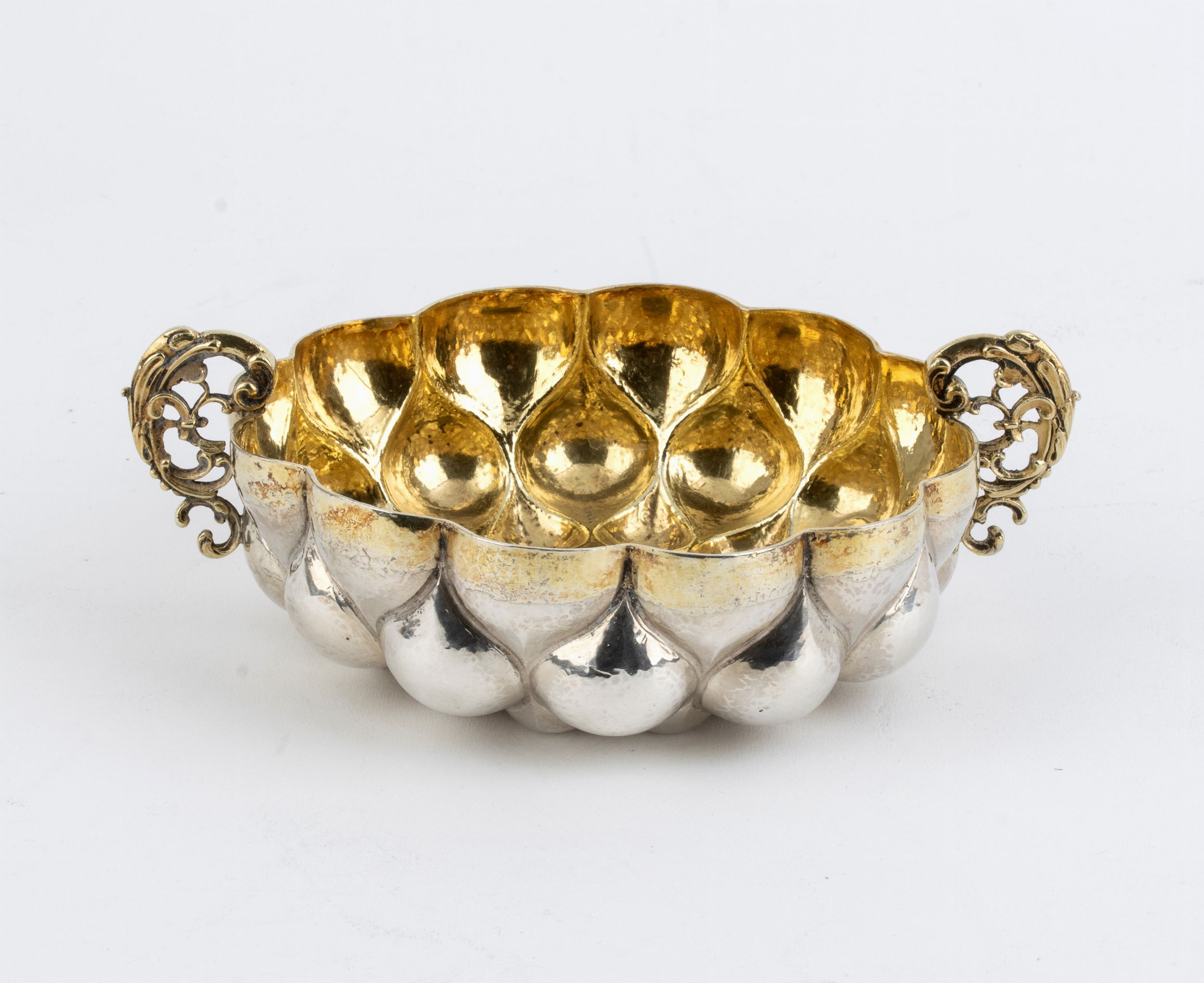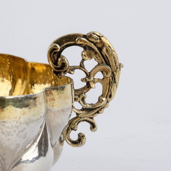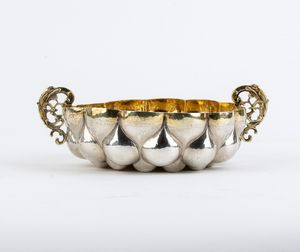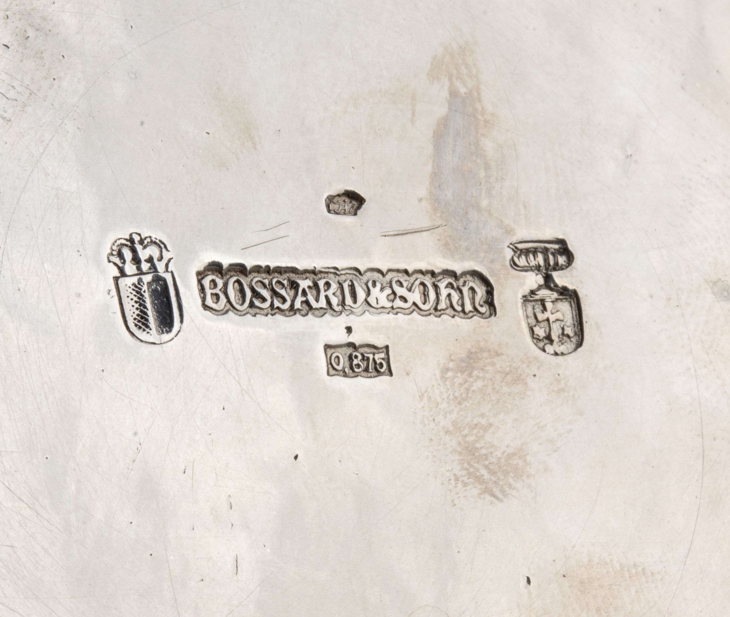 di forma circolare con manici laterali e doratura interna. Punzonata con marchi svizzeri della citta di Lucerna, con il marchio di importazione in Austra-Ungheria in uso dal 1901 al 1921 e con il marchio dell'argentiere Bossard & Son di Lucerna.