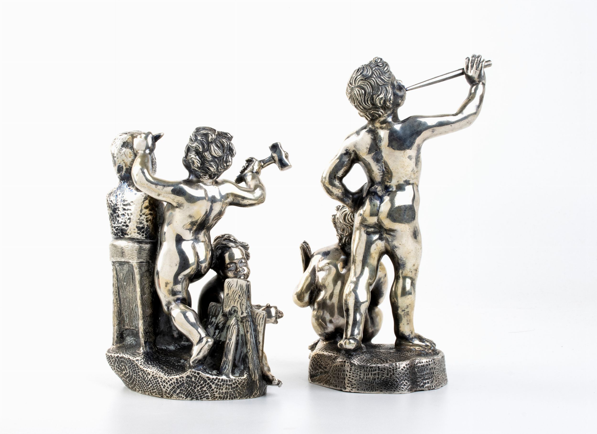 in argento fuso raffiguranti una coppia di putti musicanti, dotati di flauto e arpa, e una coppia di putti artisti, un pittore e uno scultore. Punzonati 800.
