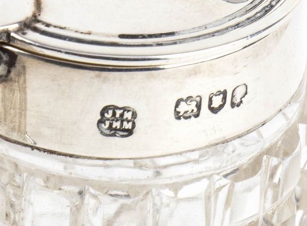 di forma triangolare con tre contenitori in vetro molato. Argento 925/1000, serie completa di marchi Londra 1901, argentieri Hukin & Heath, John Thomas Heath & John Hartswore Middleton.