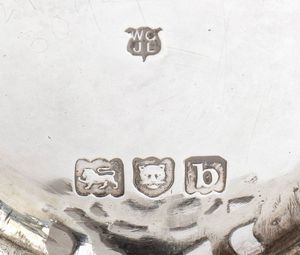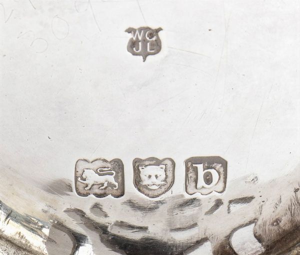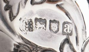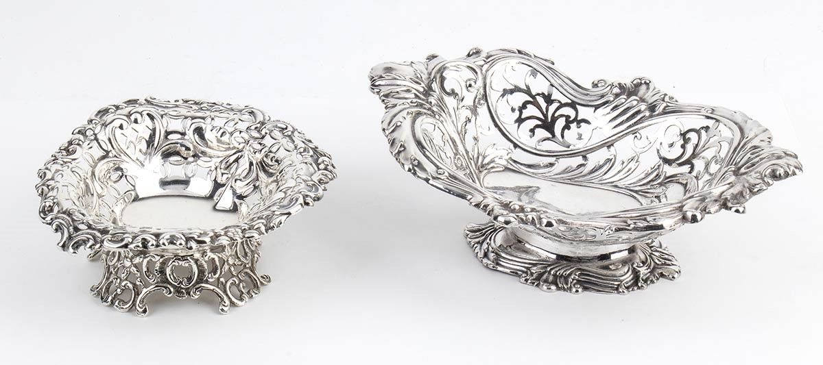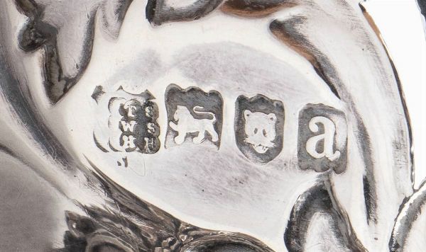 1) di forma ovale sagomata decorato e traforato a volute vegetali; argento 925/1000, serie completa di marchi Londra 1896-1897, argentieri Thomas Alfred Slater, Walter Brindsley Slater & Henry Arthur Holland. Dimensioni 6 x 17 x 12 cm, peso 117 gr.