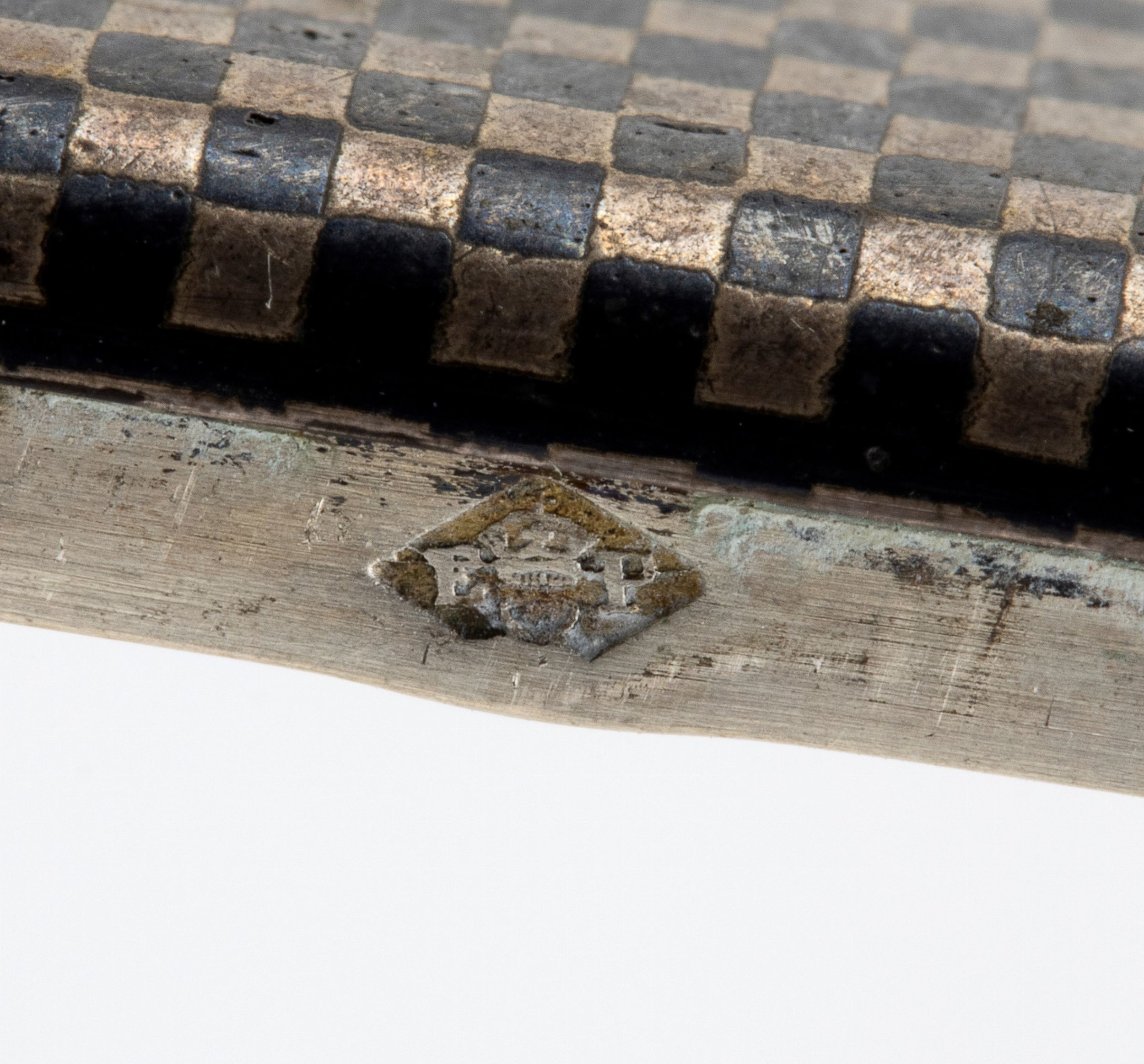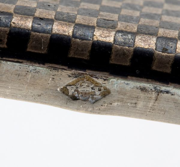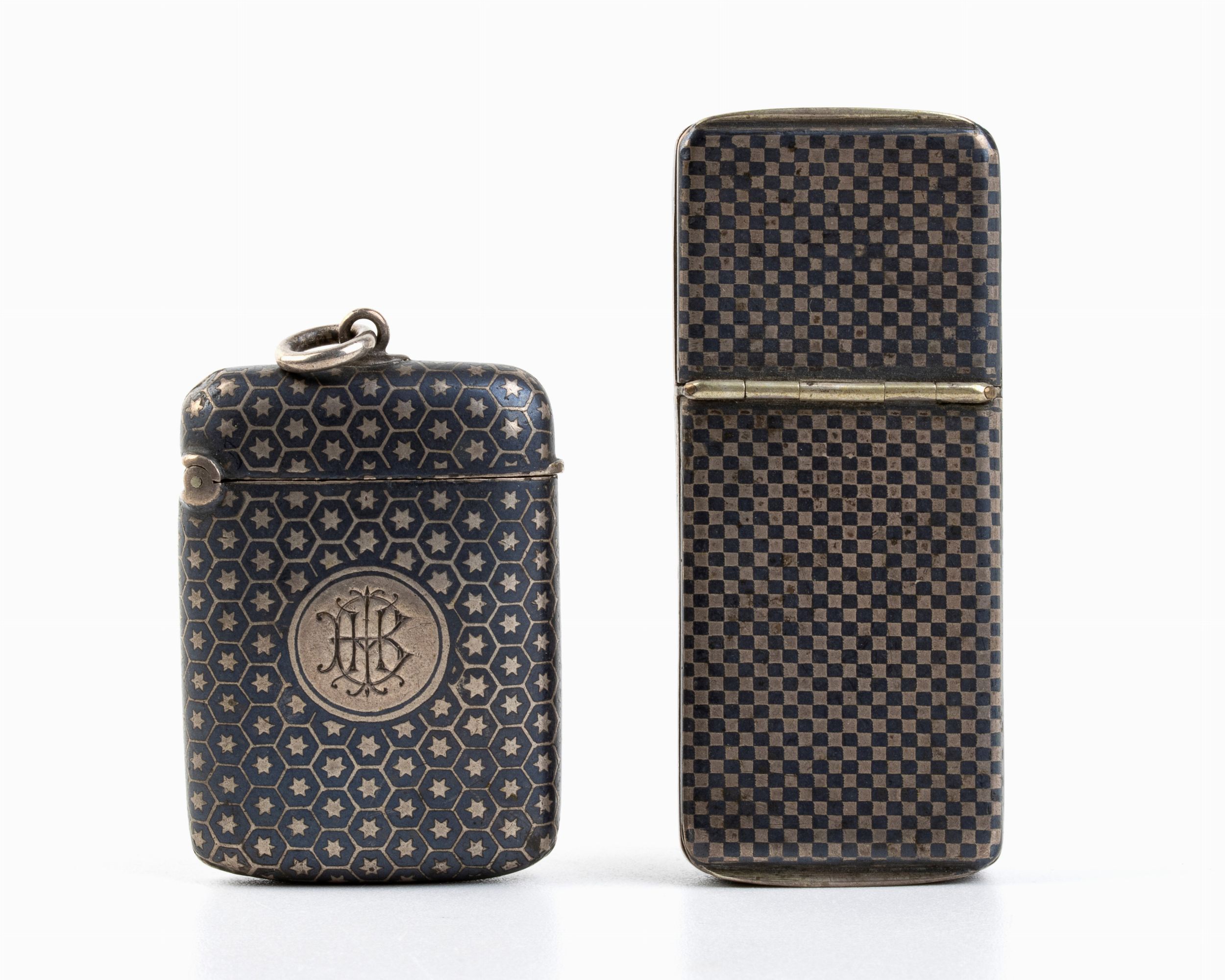 Francia e Austria, XIX secolo a) di forma rettangolare con doppia apertura superiore, interamente niellato a motivi geometrici; punzonato con la serie completa di marchi per l'argento al titolo di 900/1000 in uso in Austria Ungheria dal 1886 al 1822.
