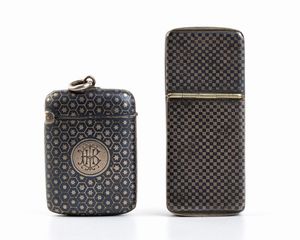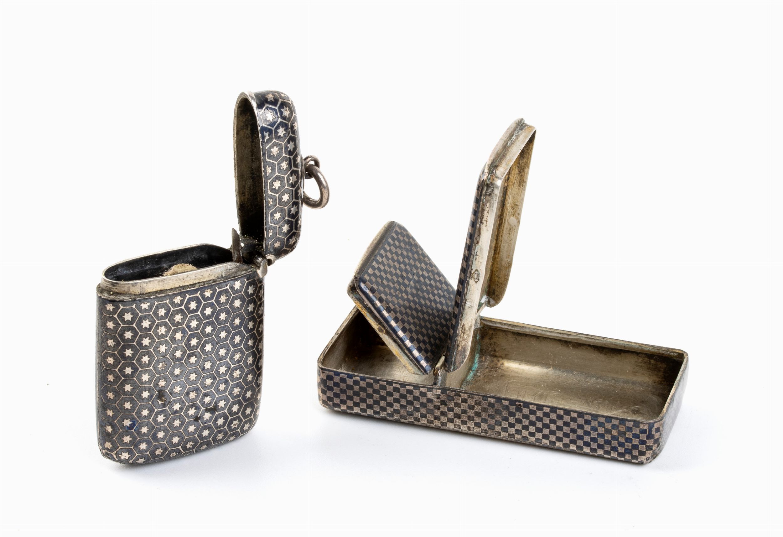 b) di forma rettangolare con coperchio incernierato, interamente niellato a motivi geometrici; punzonato con i marchio francesi in uso dopo il 1838 per l'argento al titolo minimo di 800/1000.