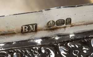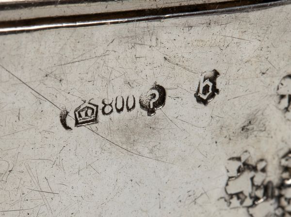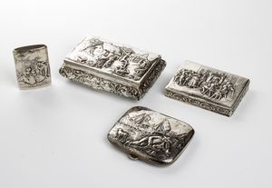 a) tabacchiera di forma rettangolare con coperchio incernierato decorato con scene di villaggio; argento 800/1000 punzonata con i marchi in uso ad Hannau dall'argentiere L. Neresheimer & Co. e con i marchi di importazione a Londra nel 1910, importatore Berthold Muller.
