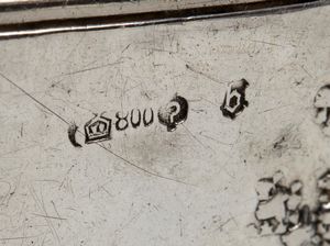b) tabacchiera di forma rettangolarecon coperchio incernierato decorato con scene di villaggio; argento 800/1000 punzonata con i marchi in uso in Italia dopo il 1968 800 - * 22 NO.
