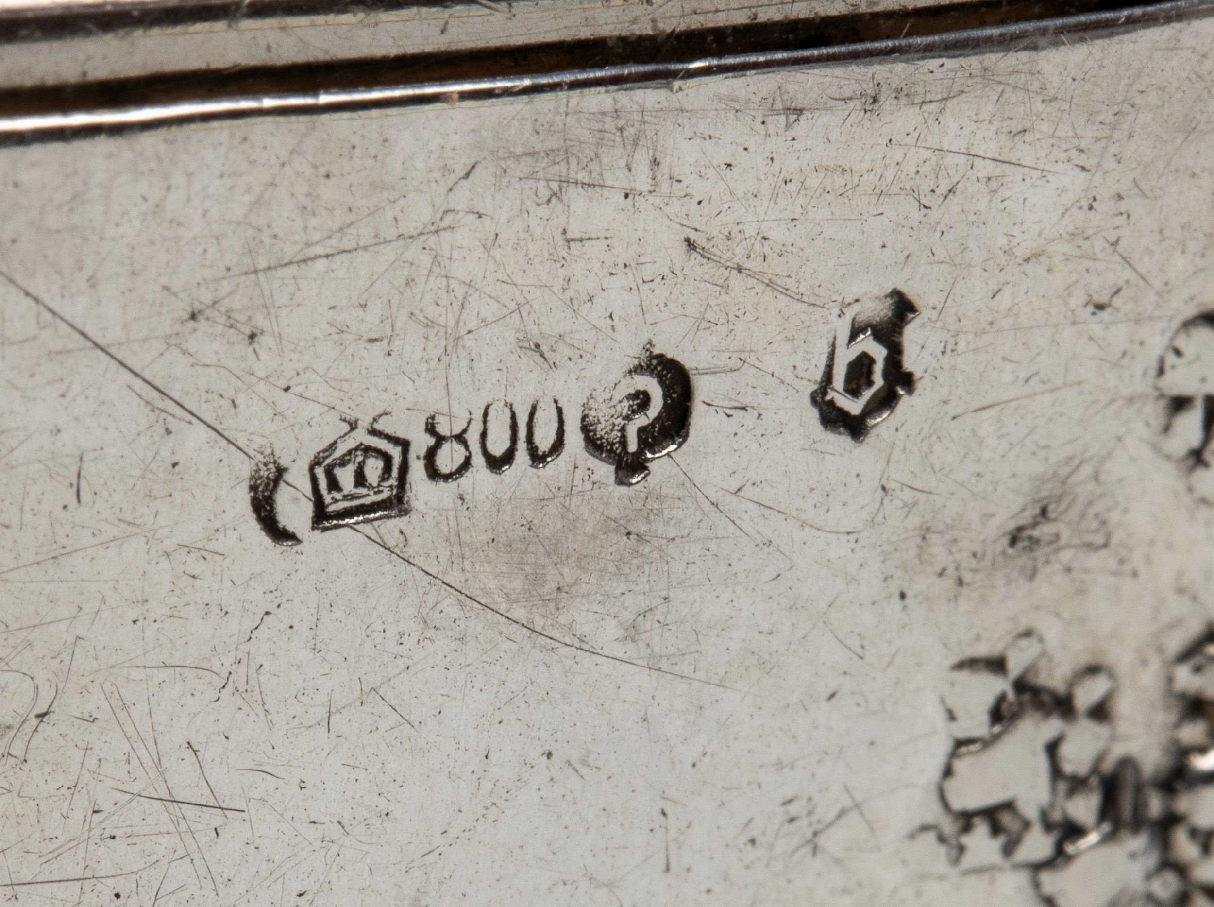 d) porta fiammiferi di forma rettangolare con coperchio incernierato decorato con una scena galante; argento 800/1000 punzonata con i marchi in uso in Germania dopo il 1888.