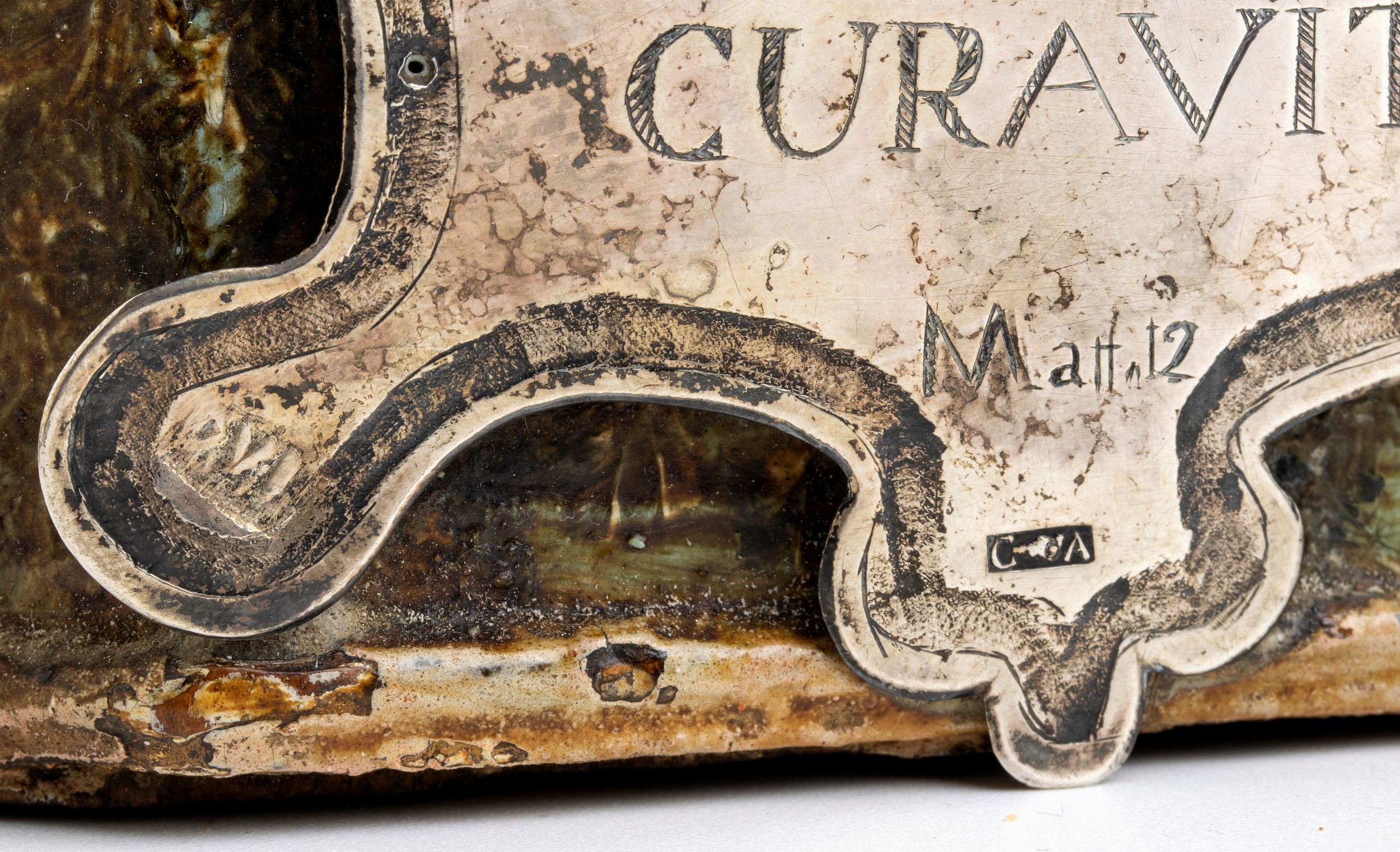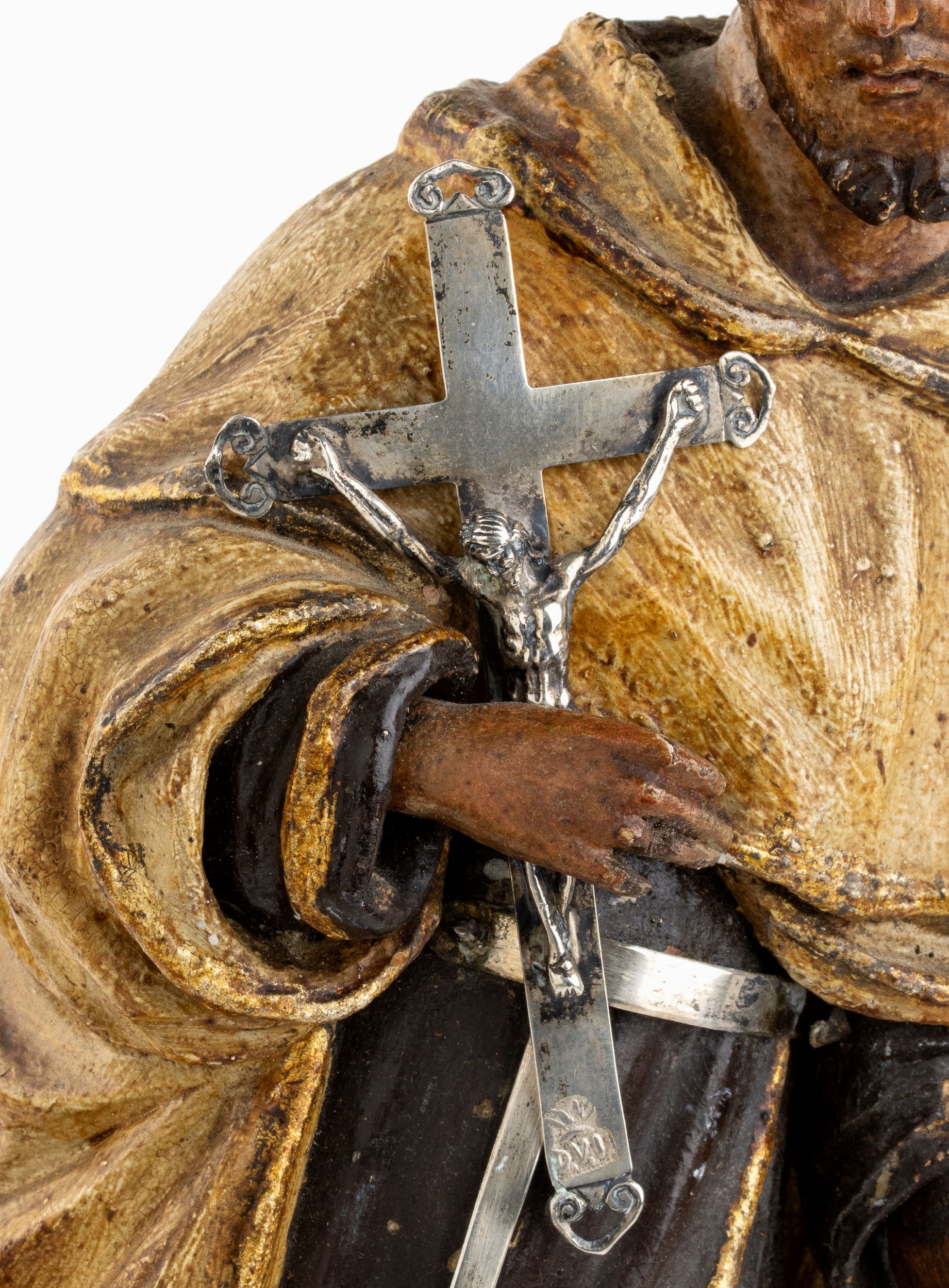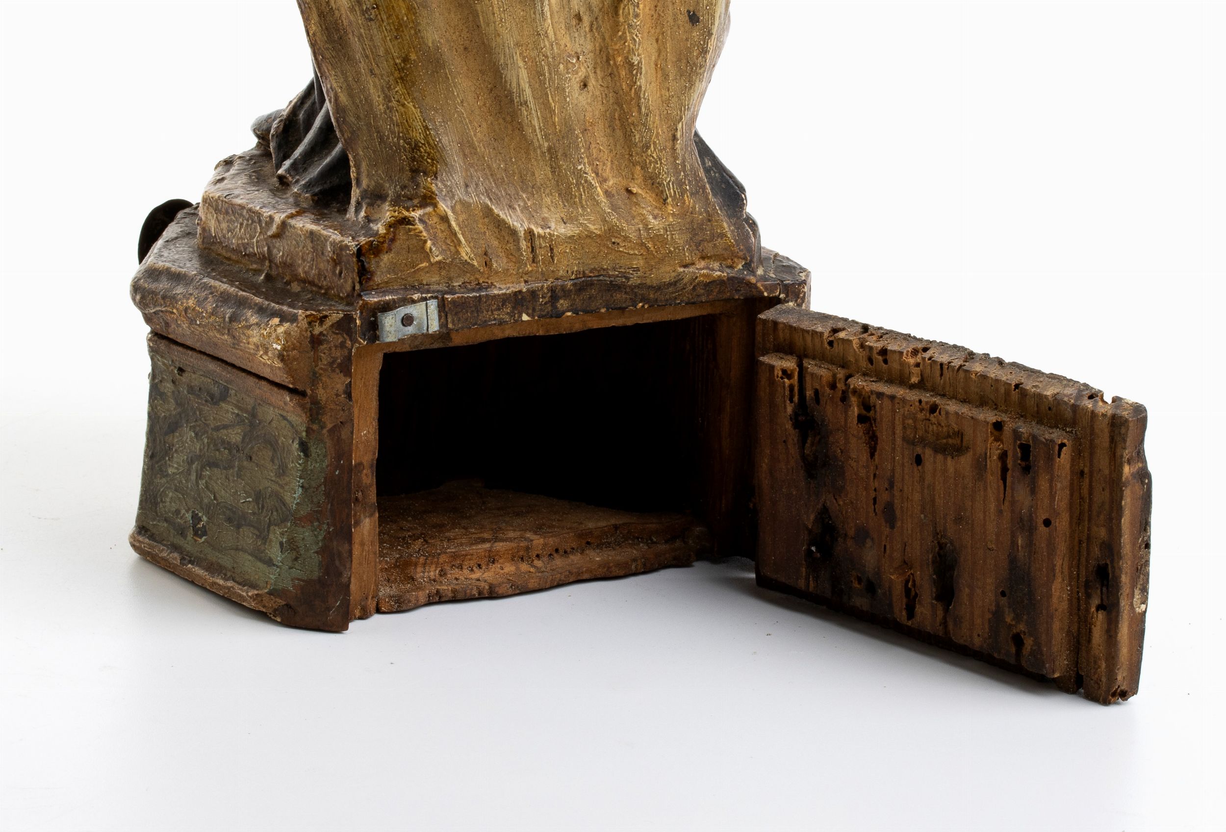 scultura lignea su plinto ottagnale raffigurante il santo con la croce e aureola. Sul fronte la fessura per l'elemosina e un cartiglio in argento con l'iscrizione ET CURAVIT - Matt. 12, punzonato con la il marchio della bulla di Trapani in uso a partire dal XVII secolo, raffigurante la falce (insenatura riproducente il porto di Trapani) sormontata da corona e, sotto, D.U.I. (Depranum Urbs Invictissima) e il marchio C A di un argentiere non identificato.