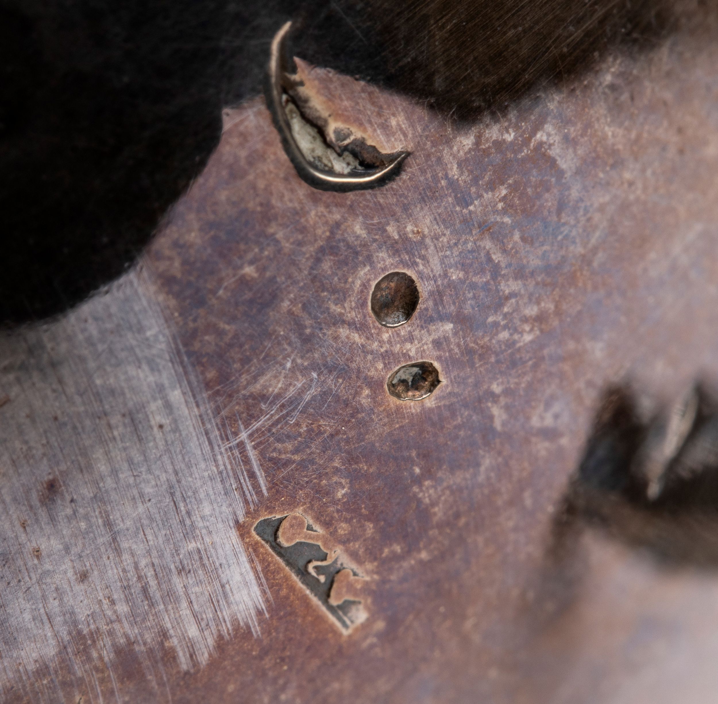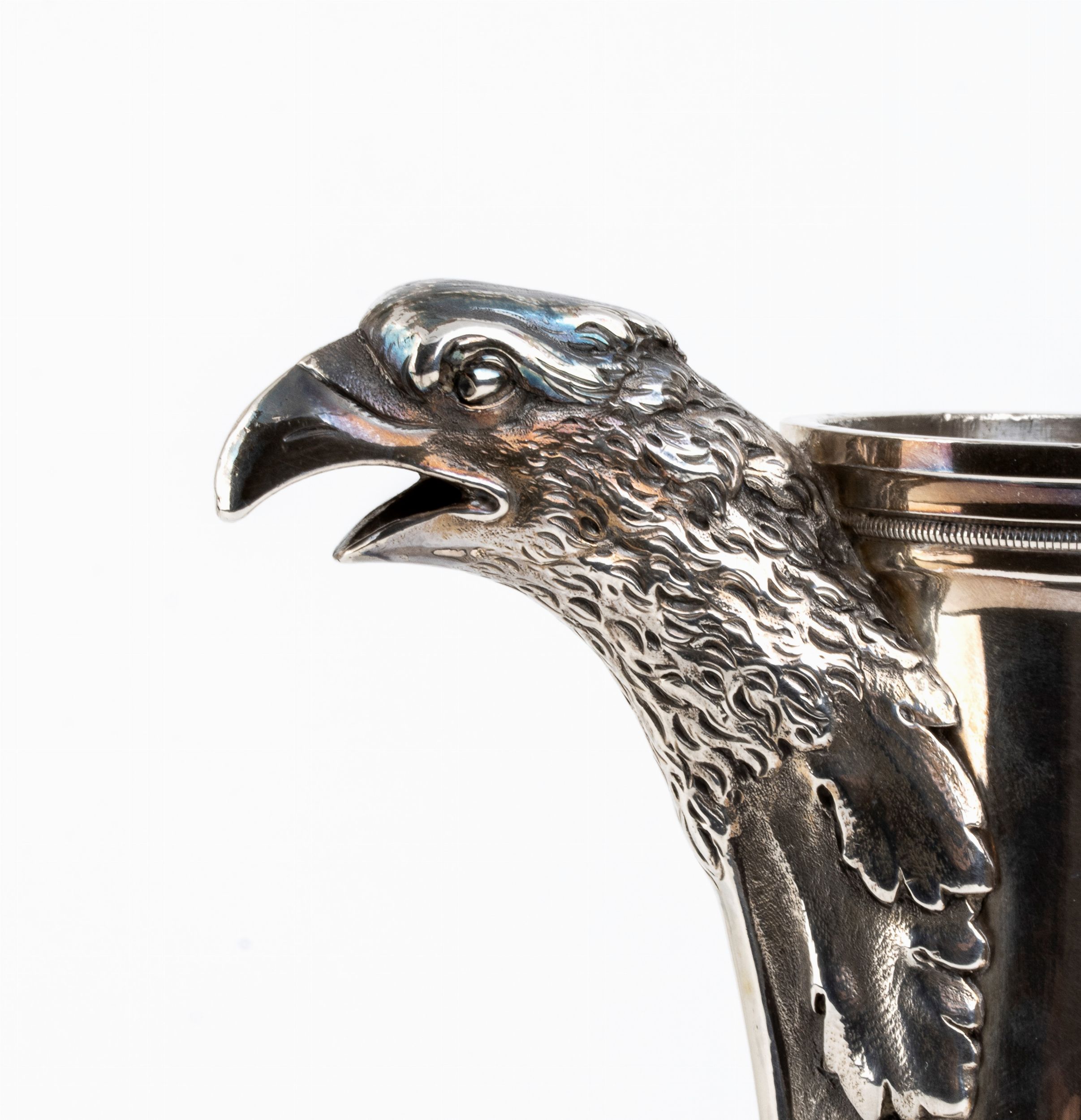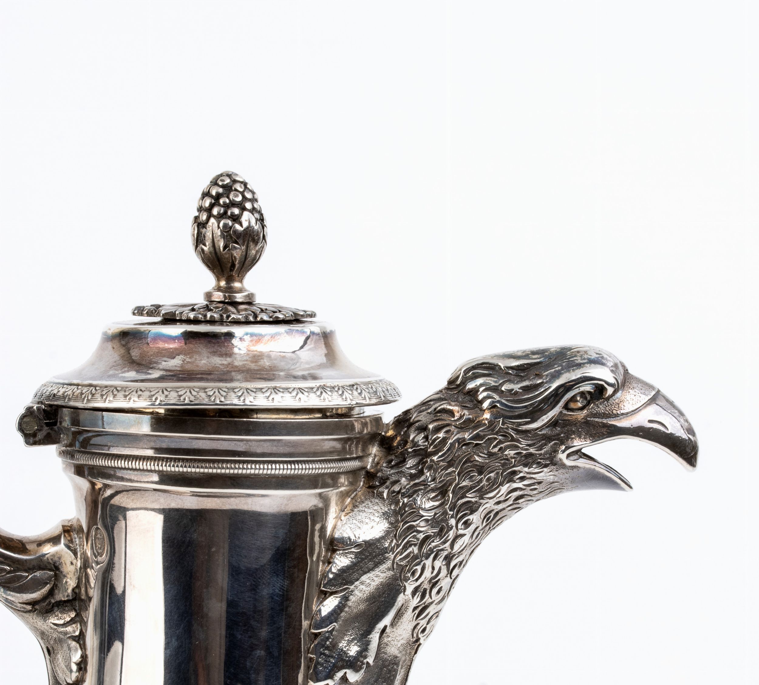 corpo ovoidale liscio poggiante su tre piedini con estremità a zoccolo e attaccatura superiore a foglie d'alloro; beccuccio a testa di rapace, coperchio incernierato con presa a pigna, manico ad ansa in ebano. Argento 950/1000, punzonata con i marchi per l'argento al primo titolo in uso a Parigi dal 1798 al 1809, con il marchio non ufficiale utilizzato dall'Association des Orfévres di Parigi per l'argento al primo titolo di 950/1000 testa di cinghiale e con le iniziali J.N.B.dell'argentiere Jean-Nicolas Boulanger.